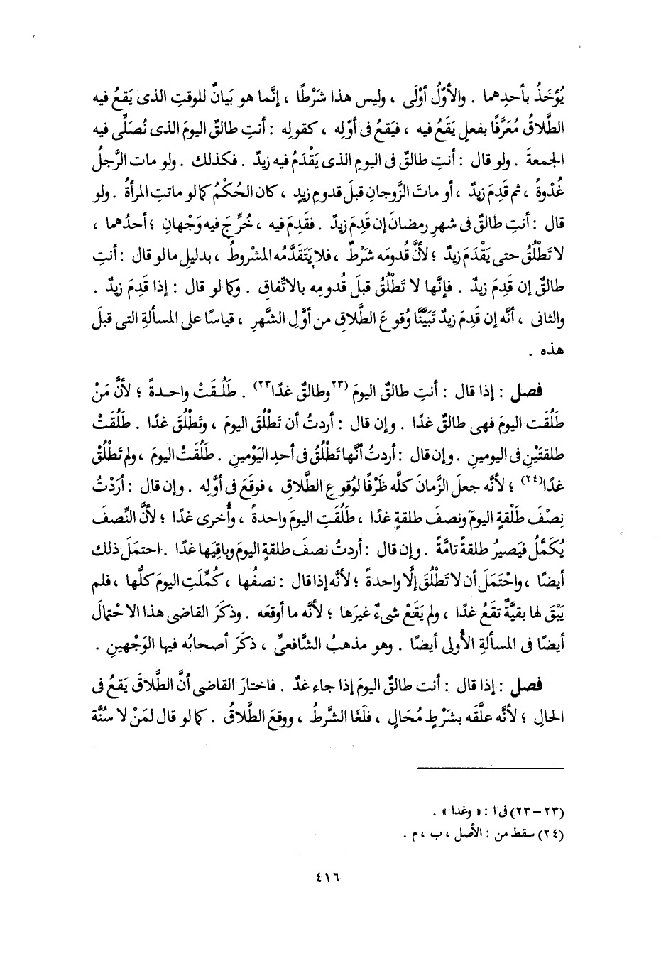 فصل: إذا قال: أنتِ طالقٌ اليومَ [وطالقٌ غدًا] (٢٣). طَلُقَتْ واحدةً؛ لأنَّ مَنْ طَلُقَت اليومَ فهى طالقٌ غدًا. وإن قال: أردتُ أن تَطْلُقَ اليومَ، وتَطْلُقَ غدًا. طَلُقَتْ طلقتَيْنِ فى اليومينِ. وإن قال: أردتُ أنَّها تَطْلُقُ فى أحدِ اليَوْمينِ. طَلُقَتْ اليومَ، ولم تَطْلُقْ غدًا (٢٤)؛ لأنَّه جعلَ الزَّمانَ كلَّه ظَرْفًا لوُقوعِ الطَّلاقِ، فوقَعَ فى أوَّلِه. وإن قال: أرَدْتُ نِصْفَ طَلْقةٍ اليوم ونصفَ طلقةٍ غدًا، طَلُقَتِ اليومَ واحدةً، وأخرى غدًا؛ لأنَّ النِّصفَ يُكَمَّلُ فيَصيرُ طلقةً تامَّة. وإن قال: أردتُ نصفَ طلقةٍ اليومَ وباقِيَها غدًا. احتمَلَ ذلك أيضًا، واحْتَمَلَ أن لا تَطْلُقَ إلَّا واحدةً؛ لأنَّه إذا قال: نصفُها، كُمِّلَتِ اليومَ كلُّها، فلم يَبْقَ لها بقيَّة تقَعُ غدًا، ولم يَقعْ شىءٌ غيرَها؛ لأنَّه ما أوقعَه. وذكَرَ القاضى هذا الاحْتمالَ أيضًا فى المسألةِ الأُولى أيضًا. وهو مذهبُ الشَّافعىِّ، ذكَرَ أصحابُه فيها الوَجْهينِ.