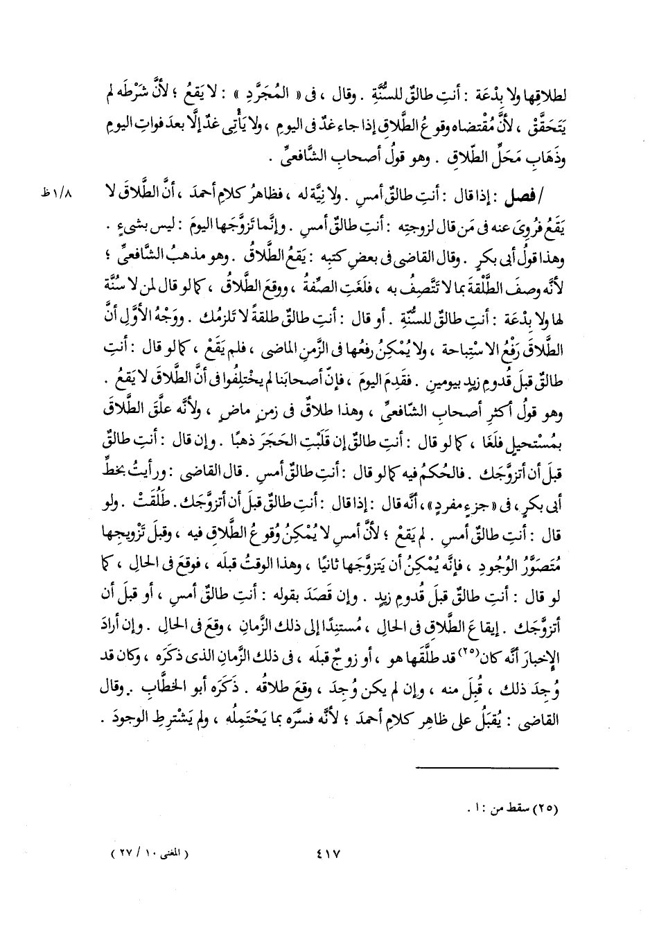 فصل: إذا قال: أنتِ طالقٌ أمس. ولا نِيَّة له، فظاهرُ كلامِ أحمدَ، أَنَّ الطَّلاقَ لا يَقَعُ فرُوِىَ عنه فى مَن قال لزوجتِه: أنتِ طالقٌ أمسِ. وإنَّما تَزوَّجَها اليومَ: ليس بشىءٍ. وهذا قولُ أبى بكرٍ. وقال القاضى فى بعضِ كتبِه: يَقعُ الطَّلاقُ. وهو مذهبُ الشَّافعىِّ؛ لأنَّه وصفَ الطَّلْقةَ بما لا تَتَّصِفُ به، فلَغَتِ الصِّفةُ، ووقعَ الطَّلاقُ، كما لو قال لمن لا سُنَّة لها ولا بِدْعَة: أنتِ طالقٌ للسُّنَّةِ. أو قال: أنتِ طالقٌ طلقةً لا تَلزمُك. ووَجْهُ الأوَّلِ أَنَّ الطَّلاقَ رَفْعُ الاسْتِباحة، ولا يُمْكِنُ رفعُها فى الزَّمنِ الماضى، فلم يَقَعْ، كما لو قال: أنتِ طالقٌ قبلَ قُدومِ زيدٍ بيومينِ. فقَدِمَ اليومَ، فإنّ أصحابَنا لم يخْتلِفُوا فى أَنَّ الطَّلاقَ لا يَقعُ. وهو قولُ أكثرِ أصحابِ الشّافعىِّ، وهذا طلاق فى زمن ماض، ولأنَّه علَّقَ الطَّلاقَ بمُسْتحيلٍ فلَغَا، كما لو قال: أنتِ طالقٌ إن قَلَبْتِ الحَجَرَ ذهبًا. وإن قال: أنتِ طالقٌ قبلَ أن أتزوَّجَك. فالحُكمُ فيه كما لو قال: أنتِ طالقٌ أمسِ. قال القاضى: ورأيتُ بخطِّ أبى بكرٍ، فى "جزءٍ مفردٍ"، أنَّه قال: إذا قال: أنتِ طالقٌ قبلَ أن أتزوَّجَك. طَلُقَتْ. ولو قال: أنتِ طالقٌ أمسِ. لم يَقعْ؛ لأنَّ أمسِ لا يُمْكِنُ وُقوعُ الطَّلاقِ فيه، وقبلَ تَزْويجِها مُتَصَوَّرُ الوُجُودِ، فإنَّه يُمْكِنُ أن يَتزوَّجَها ثانيًا، وهذا الوقتُ قبلَه، فوقعَ فى الحالِ، كما لو قال: أنتِ طالقٌ قبلَ قُدومِ زيدٍ. وإن قَصَدَ بقوله: أنتِ طالقٌ أمسِ، أو قبلَ أن أتزوَّجَك. إيقاعَ الطَّلاقِ فى الحالِ، مُستنِدًا إلى ذلك الزَّمانِ، وقعَ فى الحالِ. وإن أرادَ الإخبارَ أنَّه كان (٢٥) قد طلَّقَها هو، أو زوجٌ قبلَه، فى ذلك الزَّمانِ الذى ذكَرَه، وكان قد وُجِدَ ذلك، قُبِلَ منه، وإن لم يكن وُجِدَ، وقعَ طلاقُه. ذَكَرَه أبو الخطَّابِ. وقال القاضى: يُقبَلُ على ظاهِر كلامِ أحمدَ؛ لأنَّه فسَّرهَ بما يَحْتَمِلُه، ولم يَشْترِطِ الوجودَ.