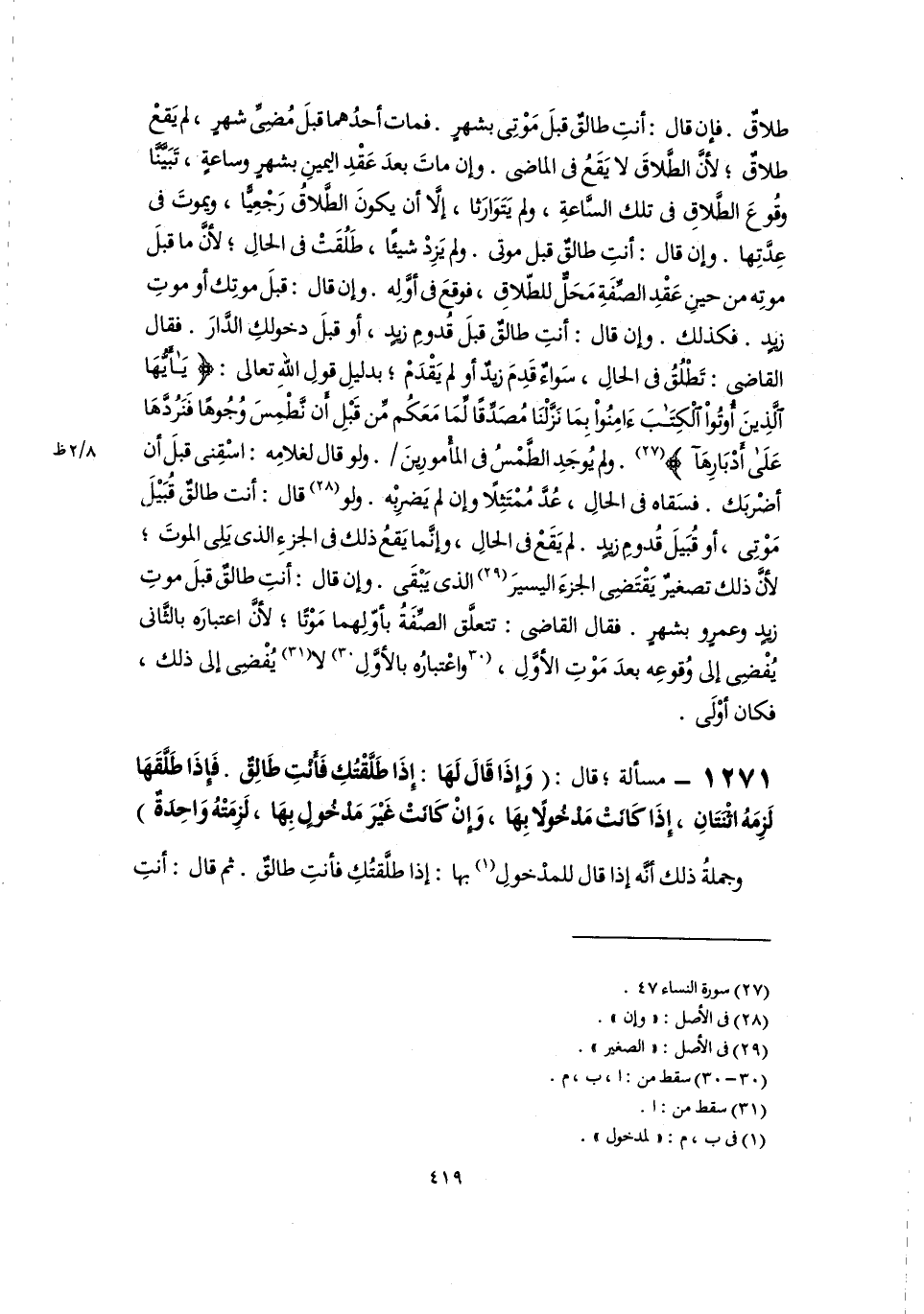 طلاقٌ. فإن قال: أنتِ طالقٌ قبلَ مَوْتِى بشهرٍ. فمات أحدُهما قبلَ مُضِىِّ شهرٍ، لم يَقعْ طلاقٌ؛ لأنَّ الطَّلاقَ لا يَقَعُ فى الماضى. وإن ماتَ بعدَ عَقْدِ اليمينِ بشهرٍ وساعةٍ، تَبَيَّنَّا وقُوعَ الطَّلاقِ فى تلك السَّاعةِ، ولم يَتَوَارَثا، إلَّا أن يكونَ الطَّلاقُ رَجْعِيًّا، ويموتَ فى عِدَّتِها. وإن قال: أنتِ طالقٌ قبل موتى. ولم يَزِدْ شيئًا، طَلُقَتْ فى الحالِ؛ لأنَّ ما قبلَ موتِه من حينِ عَقْدِ الصِّفَةِ مَحَلٌّ للطّلاقِ، فوقعَ فى أولِه. وإن قال: قبلَ موتِك أو موتِ زيد. فكذلك. وإن قال: أنتِ طالقٌ قبلَ قُدومِ زيد، أو قبلَ دخولكِ الدَّارَ. فقال القاضى: تَطْلُقُ فى الحالِ، سَواءٌ قَدِمَ زيذ أو لم يَقْدَمْ؛ بدليلِ قولِ اللَّهِ تعالى: {يَاأَيُّهَا الَّذِينَ أُوتُوا الْكِتَابَ آمِنُوا بِمَا نَزَّلْنَا مُصَدِّقًا لِمَا مَعَكُمْ مِنْ قَبْلِ أَنْ نَطْمِسَ وُجُوهًا فَنَرُدَّهَا عَلَى أَدْبَارِهَا} (٢٧). ولم يُوجَدِ الطَّمس فى المأْمورِينَ. ولو قال لغلامِه: اسْقِنى قبلَ أن أضْربَك. فسَقاه فى الحالِ، عُدَّ مُمْتَثِلًا وإن لم يَضربه. ولو (٢٨) قال: أنت طالقٌ قُبَيْلَ مَوْتِى، أو قُبَيلَ قُدومِ زيد. لم يَقَعْ فى الحالِ، وإنَّما يَقعُ ذلك فى الجزءِ الذى يَلِى الموتَ؛ لأنَّ ذلك تصغير يَقْتَضِى الجزءَ اليسيرَ (٢٩) الذى يَبْقَى. وإن قال: أنتِ طالقٌ قبلَ موتِ زيدٍ وعمرٍو بشهر. فقال القاضى: تتعلَّق الصِّفَةُ بأوّلِهما مَوْتًا؛ لأنَّ اعتبارَه بالثَّانى يُفْضِى إلى وُقوعِه بعدَ مَوْتِ الأوَّلِ، [واعْتبارُه بالأوَّلِ] (٣٠) لا (٣١) يُفْضِى إلى ذلك، فكان أوْلَى.