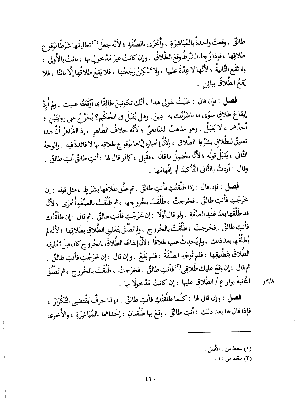 فصل: فإن قال: إذا طلَّقتُكِ فأنتِ طالقٌ. ثم علَّقَ طَلاقَها بشَرْطٍ، مثل قوله: إن خَرَجْتِ فأنتِ طالقٌ. فخَرجتْ، طَلُقَتْ بخُروجِها، ثم طَلُقَتْ بالصِّفَةِ أُخْرَى؛ لأنَّه قد طَلَّقَها بعدَ عَقْدِ الصِّفَةِ. ولو قال أوَّلًا: إن خَرَجْتِ فأنتِ طالقٌ. ثم قال: إن طلَّقْتُك فأنتِ طالقٌ. فخَرجتْ، طَلُقَتْ بالخُروجِ، ولم تَطْلُقْ بتَعْليقِ الطَّلاقِ بطَلاقِها؛ لأنَّه لم يُطلِّقْها بعدَ ذلك، ولم يُحدِثْ عليها طلاقًا؛ لأنَّ إيقاعَه الطَّلاقَ بالخُروجِ كان قبلَ تَعْليقِه الطَّلاقَ بتَطْليقِها، فلم تُوجَدِ الصِّفَةُ، فلم يَقَعْ. وإن قال: إن خَرَجْتِ فأنتِ طالقٌ. ثم قال: إن وقعَ عليك طَلاقِى (٣) فأنتِ طالقٌ. فخرَجتْ، طَلُقَتْ بالخُروجِ، ثم تَطْلُقُ الثَّانيةَ بوقوعَ الطَّلاقِ عليها، إن كانتْ مَدْخولًا بها.
