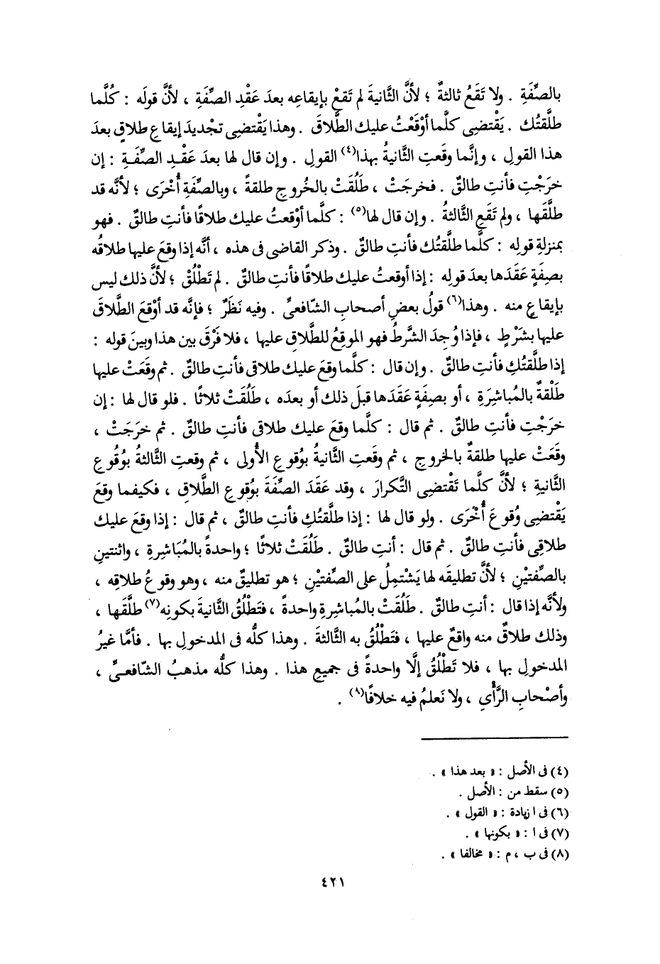 بالصِّفَةِ. ولا تَقَعُ ثالثةٌ؛ لأنَّ الثَّانيةَ لم تَقعْ بإيقاعِه بعدَ عَقْدِ الصِّفَةِ؛ لأنَّ قولَه: كُلَّما طلَّقتُك. يَقْتضِى كلَّما أوْقَعْتُ عليك الطَّلاقَ. وهذا يَقْتضِى تجْديدَ إيقاعِ طلاقٍ بعدَ هذا القولِ، وإنَّما وقَعتِ الثَّانيةُ بهذا (٤) القولِ. وإن قال لها بعدَ عَقْدِ الصِّفَةِ: إن خرَجْتِ فأنتِ طالقٌ. فخرجَتْ، طَلُقَتْ بالخُروجِ طلقةً، وبالصِّفَةِ أُخْرَى؛ لأنَّه قد طلَّقَها، ولم تَقَعِ الثَّالثةُ. وإن قال لها (٥): كلَّما أوْقعتُ عليك طلاقًا فأنتِ طالقٌ. فهو بمنزلةِ قولِه: كلَّما طلقتُك فأنتِ طالقٌ. وذكر القاضى فى هذه، أنَّه إذا وقعَ عليها طلاقُه بصِفَةٍ عَقَدَها بعدَ قولِه: إذا أوقعتُ عليك طلاقًا فأنتِ طالقٌ. لم تَطْلُقْ؛ لأنَّ ذلك ليس بإيقاعٍ منه. وهذا (٦) قولُ بعضِ أصحابِ الشّافعىِّ. وفيه نَظَرٌ؛ فإنَّه قد أوْقعَ الطَّلاقَ عليها بشَرْطٍ، فإذا وُجِدَ الشَّرْطُ فهو الموقِعُ للطَّلاقِ عليها، فلا فَرْقَ بين هذا وبينَ قوله: إذا طلَّقتُكِ فأنتِ طالقٌ. وإن قال: كلَّما وقعَ عليك طلاقى فأنتِ طالقٌ. ثم وقَعَتْ عليها طَلْقة بالمُباشِرَةِ، أو بصِفَةٍ عَقَدَها قبلَ ذلك أو بعدَه، طَلُقَتْ ثلاثًا. فلو قال لها: إن خرَجْتِ فأنتِ طالقٌ. ثم قال: كلَّما وقعَ عليك طلاقى فأنتِ طالقٌ. ثم خرَجَتْ، وقَعَتْ عليها طلقةٌ بالخروجِ، ثم وقَعتِ الثَّانيةُ بوُقوعِ الأولى، ثم وقعتِ الثَّالثةُ بوُقُوعِ الثَّانيةِ؛ لأنَّ كلَّما تَقْتضِى التَّكرارَ، وقد عَقَدَ الصِّفَةَ بوُقوعِ الطَّلاقِ، فكيفما وقعَ يَقْتضِى وُقوعَ أُخْرَى. ولو قال لها: إذا طلَّقتُكِ فأنتِ طالقٌ، ثم قال: إذا وقعَ عليك طلاقِى فأنتِ طالقٌ. ثم قال: أنتِ طالقٌ. طَلُقَتْ ثلاثًا؛ واحدةً بالمُبَاشِرةِ، واثنتينِ بالصِّفتيْنِ؛ لأنَّ تطليقَه لها يَشْتمِلُ على الصِّفتيْنِ؛ هو تطليقٌ منه، وهو وقوعُ طلاقِه، ولأنَّه إذا قال: أنتِ طالقٌ. طَلُقَتْ بالمُباشِرةِ واحدةً، فتَطْلُقُ الثَّانيةَ بكونِه (٧) طلَّقَها، وذلك طلاقٌ منه واقعٌ عليها، فتَطْلُقُ به الثَّالثةَ. وهذا كلُّه فى المدخولِ بها. فأمَّا غيرُ المدخولِ بها، فلا تَطْلُقُ إلَّا واحدةً فى جميعِ هذا. وهذا كلُّه مذهبُ الشّافعىِّ، وأصْحابِ الرَّأْىِ، ولا نَعلمُ فيه خلافًا (٨).