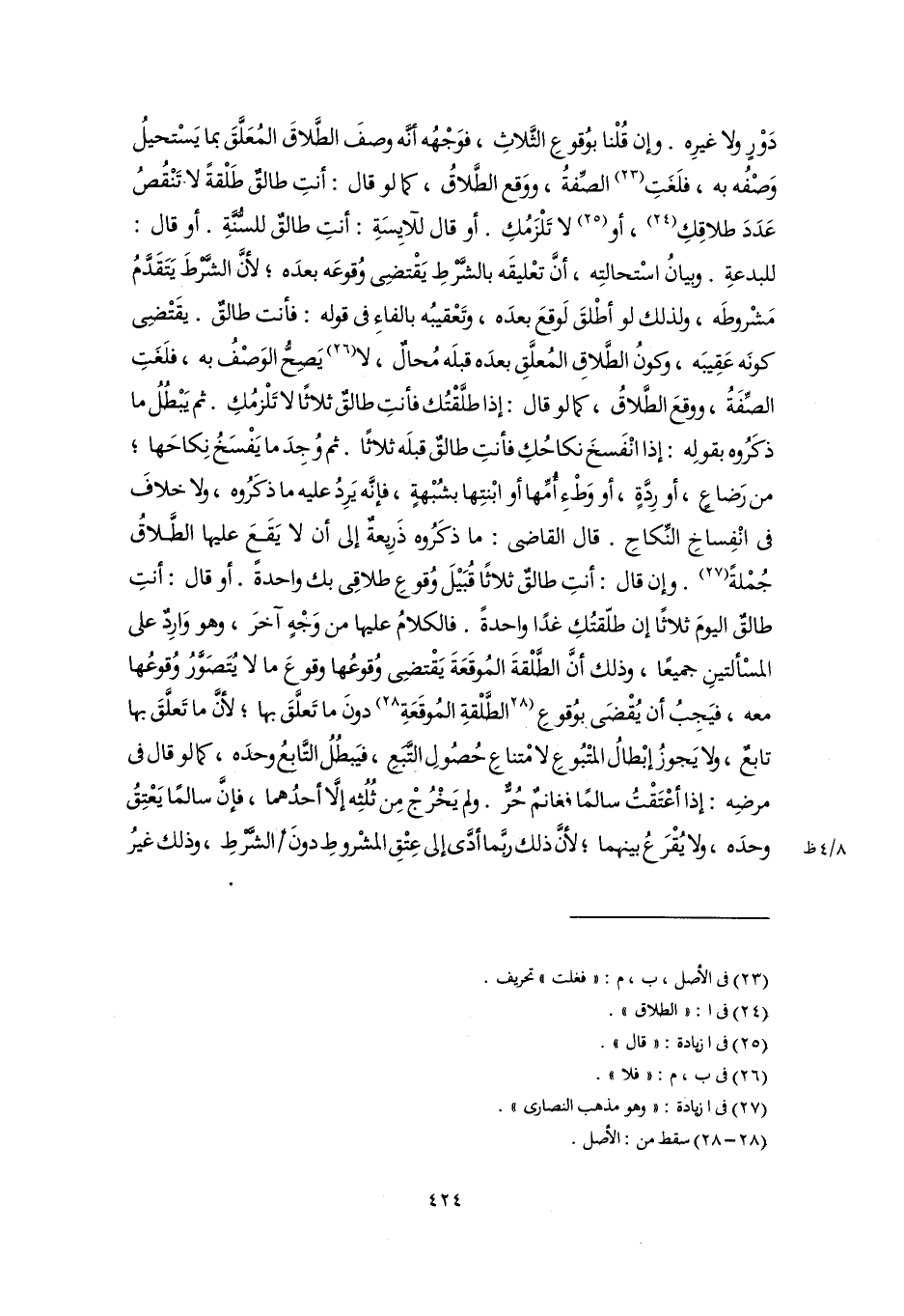 دَوْرٍ ولا غيرِه. وإن قُلْنا بوُقوعِ الثَّلاثِ، فوَجْهُه أنَّه وصفَ الطَّلاقَ المُعَلَّقَ بما يَسْتحيلُ وَصْفُه به، فلَغَتِ (٢٣) الصِّفةُ، ووَقع الطَّلاقُ، كما لو قال: أنتِ طالقٌ طَلْقةً لا تَنْقُصُ عَدَدَ طلاقِكِ (٢٤)، أو (٢٥) لا تَلْزَمُكِ. أو قال للآيِسَةِ: أنتِ طالقٌ للسُّنَّةِ. أو قال: للبدعةِ. وبيانُ اسْتحالتِه، أَنَّ تعْليقَه بالشَّرطِ يَقْتضِى وُقوعَه بعدَه؛ لأنَّ الشَّرطَ يَتَقَدَّمُ مَشْروطَه، ولذلك لو أطْلقَ لَوقعَ بعدَه، وتَعْقيبُه بالفاءِ فى قوله: فأنت طالقٌ. يقَتْضِى كونَه عَقِيبَه، وكونُ الطَّلاقِ المُعلَّقِ بعدَه قبلَه مُحالٌ، لا (٢٦) يَصِحُّ الوَصْفُ به، فلَغَتِ الصِّفَةُ، ووقعَ الطَّلاقُ، كما لو قال: إذا طلَّقْتُك فأنتِ طالقٌ ثلاثًا لا تَلْزمُكِ. ثم يَبْطُل ما ذكَرُوه بقولِه: إذا انْفَسخَ نكاحُكِ فأنتِ طالقٌ قبلَه ثلاثًا. ثم وُجِدَ ما يَفْسَخُ نِكاحَها؛ من رَضاعٍ، أو رِدَّةٍ، أو وَطْءِ أمِّها أو ابْنتِها بشُبْهةٍ، فإنَّه يَرِدُ عليه ما ذكَرُوه، ولا خلافَ فى انْفِساخِ النِّكاحِ. قال القاضى: ما ذكَرُوه ذَرِيعةٌ إلى أن لا يَقَعَ عليها الطَّلاقُ جُمْلةً (٢٧). وإن قال: أنتِ طالقٌ ثلاثًا قُبَيْلَ وُقوعِ طلاقِى بك واحدةً. أو قال: أنتِ طالقٌ اليومَ ثلاثًا إن طلّقتُكِ غدًا واحدةً. فالكلامُ عليها من وَجهٍ آخرَ، وهو وَارِدٌ على المسْألتينِ جميعًا، وذلك أَنَّ الطَّلْقةَ المُوقَعَةَ يَقْتضِى وُقوعُها وقوعَ ما لا يُتَصَوّرُ وُقوعُها معه، فيَجِبُ أن يُقْضَى بوُقوعِ [الطَّلْقةِ المُوقَعَةِ] (٢٨) دونَ ما تَعلَّقَ بها؛ لأنَّ ما تَعلَّقَ بها تابعٌ، ولا يَجوزُ إبْطالُ المتْبُوعِ لامْتناعِ حُصُولِ الِتَبَعِ، فيَبطُلُ التابعُ وحدَه، كما لو قال فى مرضِه: إذا أعْتَقْتُ سالمًا فغانم حُرٌّ. ولم يَخْرُجْ مِن ثُلُثِه إلا أحدُهما، فإنَّ سالمًا يَعْتِقُ وحدَه، ولا يُقْرَعُ بينهما؛ لأنَّ ذلك ربَّما أدَّى إلى عِتْقِ المشْروطِ دونَ الشَّرْطِ، وذلك غيرُ