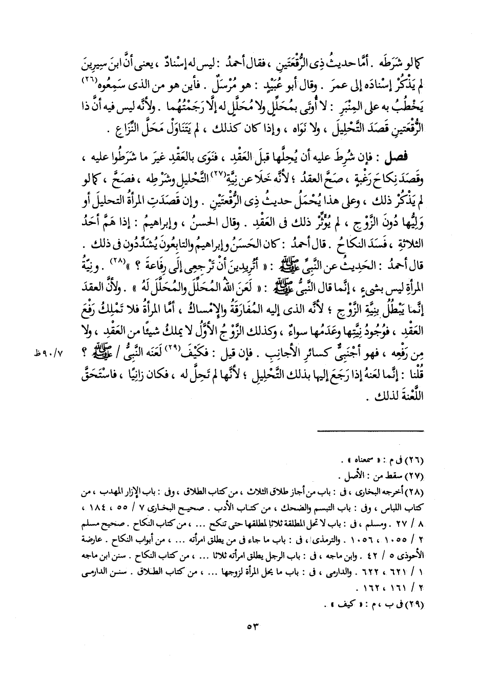 كما لو شَرَطَه. أمَّا حديثُ ذِى الرُّقْعَتَينِ، فقال أحمدُ: ليس له إسْنادٌ، يعنى أَنَّ ابنَ سِيرِينَ لم يَذْكُرْ إسنادَه إلى عمرَ. وقال أبو عُبَيْدٍ: هو مُرْسَلٌ. فأين هو من الذى سَمِعُوه (٢٦) يَخْطُبُ به على المِنْبَرِ: لا أُوتَى بمُحَلِّلٍ ولا مُحَلَّلٍ له إلَّا رَجَمْتُهُما. ولأنَّه ليس فيه أَنَّ ذا الرُّقْعَتينِ قصَدَ التَّحْلِيل، ولا نَوَاه، وإذا كان كذلك، لم يَتَنَاوَلْ مَحَلَّ النِّزَاعِ.