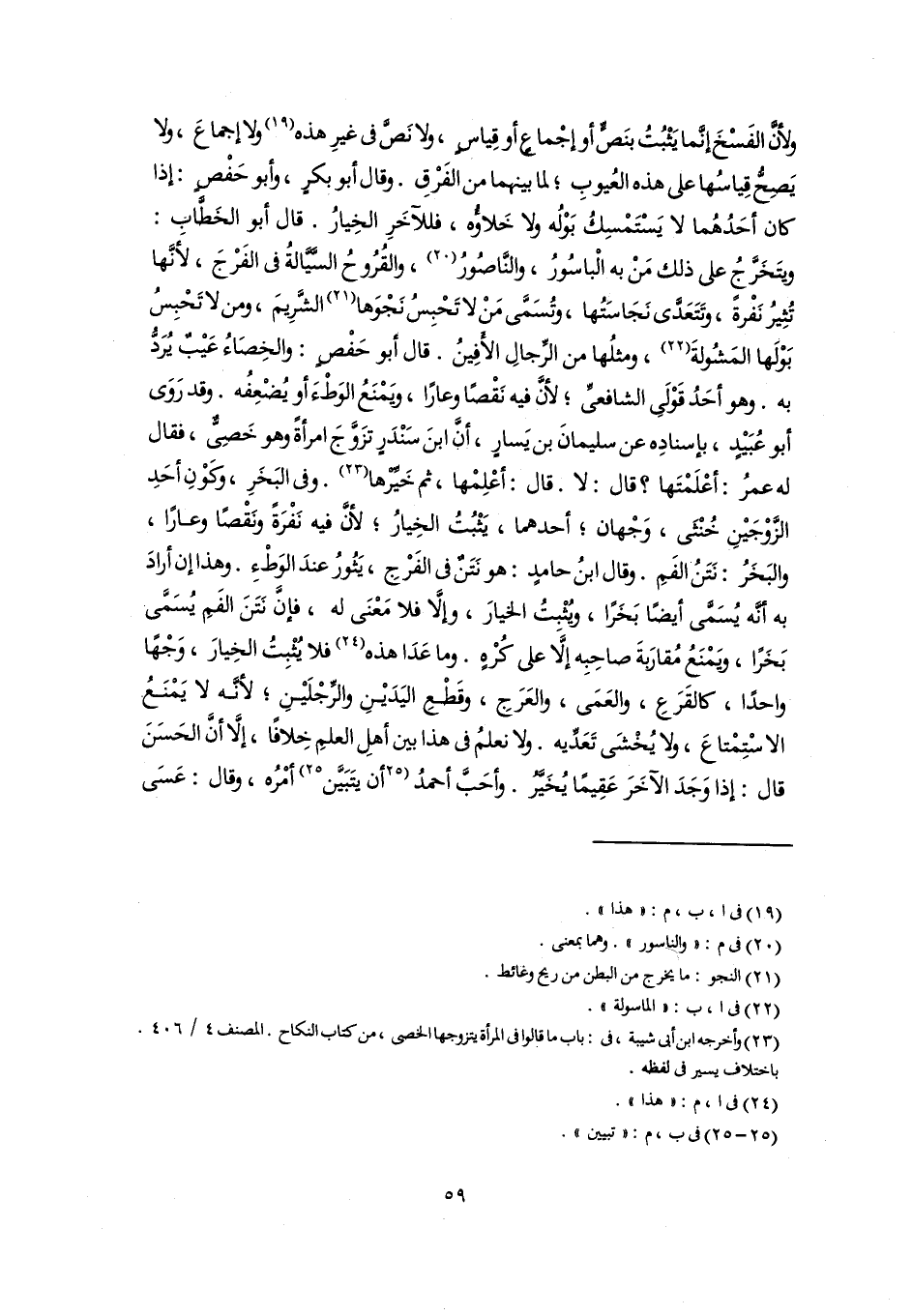 ولأنَّ الفَسْخَ إنَّما يَثْبُتُ بنَصٍّ أو إجْماعٍ أو قِياسٍ، ولا نَصَّ فى غيرِ هذه (١٩) ولا إجماعَ، ولا يَصِحُّ قِياسُها على هذه العُيوبِ؛ لما بينهما من الفَرْقِ. وقال أبو بكرٍ، وأبو حَفْصٍ: إذا كان أحَدُهُما لا يَسْتَمْسِكُ بَوْلُه ولا خَلاؤُه، فللآخَرِ الخِيارُ. قال أبو الخَطَّابِ: ويتَخَرَّجُ على ذلك مَنْ به الْباسُورُ، والنَّاصُورُ (٢٠)، والقُرُوحُ السَّيَّالةُ فى الفَرْجَ، لأنَّها تُثِيرُ نَفْرةً، وتَتَعَدَّى نَجَاسَتُها، وتُسَمَّى مَنْ لا تَحْبِسُ نَجْوَها (٢١) الشَّرِيمَ، ومن لا تَحْبِسُ بَوْلَها المَشُولةَ (٢٢)، ومثلُها من الرِّجالِ الأَفِينُ. قال أبو حَفْصٍ: والخِصَاءُ عَيْبٌ يُرَدُّ به. وهو أحَدُ قَوْلَى الشافعىِّ؛ لأنَّ فيه نَقْصًا وعارًا، ويَمْنَعُ الوَطْءَ أو يُضْعِفُه. وقد رَوَى أبو عُبَيْدٍ، بإسنادِه عن سليمانَ بن يَسارٍ، أَنَّ ابنَ سَنْدَرٍ تزَوَّجَ امرأةً وهو خَصِىٌّ، فقال له عمرُ: أعْلَمْتَها؟ قال: لا. قال: أعْلِمْها، ثم خَيِّرْها (٢٣). وفى البَخَرِ، وكَوْنِ أحَدِ الزَّوْجَيْنِ خُنْثَى، وَجْهان؛ أحدهما، يَثْبُتُ الخِيارُ؛ لأنَّ فيه نَفْرَةً ونَقْصًا وعارًا، والبَخَرُ: نَتَنُ الفَمِ. وقال ابنُ حامدٍ: هو نَتَنٌ فى الفَرْجِ، يَثُورُ عندَ الوَطْءِ. وهذا إن أرادَ به أنَّه يُسَمَّى أيضًا بَخَرًا، ويثبتُ الخيارَ، وإلَّا فلا مَعْنَى له، فإنَّ نَتَنَ الفَمِ يُسَمَّى بَخَرًا، ويَمْنَعُ مُقارَبةَ صاحِبِه إلًّا على كُرْهٍ. وما عَدَا هذه (٢٤) فلا يُثْبِتُ الخِيارَ، وَجْهًا واحدًا، كالقَرَعِ، والعَمَى، والعَرَجِ، وقَطْعِ اليَدَيْنِ والرِّجْلَيْنِ؛ لأنَّه لا يَمْنَعُ الاسْتِمْتاعَ، ولا يُخْشَى تَعَدِّيه. ولا نعلمُ فى هذا بين أهلِ العلمِ خِلافًا، إلَّا أنَّ الحَسَنَ قال: إذا وَجَدَ الآخَرَ عَقِيمًا يُخَيَّرُ. وأحَبَّ أحمدُ [أن يتَبَيَّنْ] (٢٥) أمْرُه، وقال: عَسَى