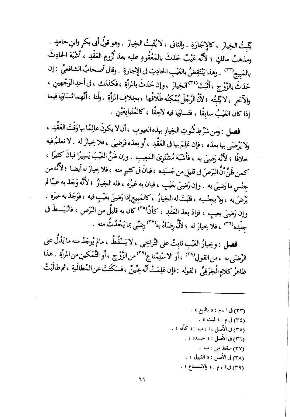 فصل: ومن شَرْطِ ثُبُوتِ الخِيارِ بهذه العيوبِ، أن لا يكونَ عالِمًا بها وَقْتَ العَقْدِ، ولا يَرْضَى بها بعدَه، فإن عَلِمَ بها فى العَقْدِ، أو بعدَه فرَضِىَ، فلا خِيارَ له. لا نعلمُ فيه خلافًا؛ لأنَّه رَضِىَ به، فأشْبَهَ مُشْتَرِىَ المَعِيبِ. وإن ظَنَّ العَيْبَ يَسِيرًا فبانَ كثيرًا، كمن ظَنَّ أن البَرَصَ فى قليلٍ من جَسَدِه، فبانَ فى كثيرٍ منه، فلا خِيارَ له أيضًا؛ لأنَّه من جِنْس ما رَضِىَ به. وإن رَضِىَ بعَيْبٍ، فبان به غيرُه، فله الخِيارُ؛ لأنَّه وَجَدَ به عيبًا لم يَرْضَ به، ولا بجِنْسِه، فثَبَتَ له الخِيارُ، كالمَبِيعِ إذا رَضِىَ بعَيْبٍ فيه، فوَجَدَ به غيرَه. وإن رَضِىَ بعيبٍ، فزادَ بعدَ العَقْدِ، كأنْ (٣٥) كان به قليلٌ من البَرَصِ، فانْبَسطَ فى جِلْدِه (٣٦)، فلا خِيارَ له؛ لأنَّ رِضَاهُ به (٣٧) رِضًى بما يَحْدُثُ منه.