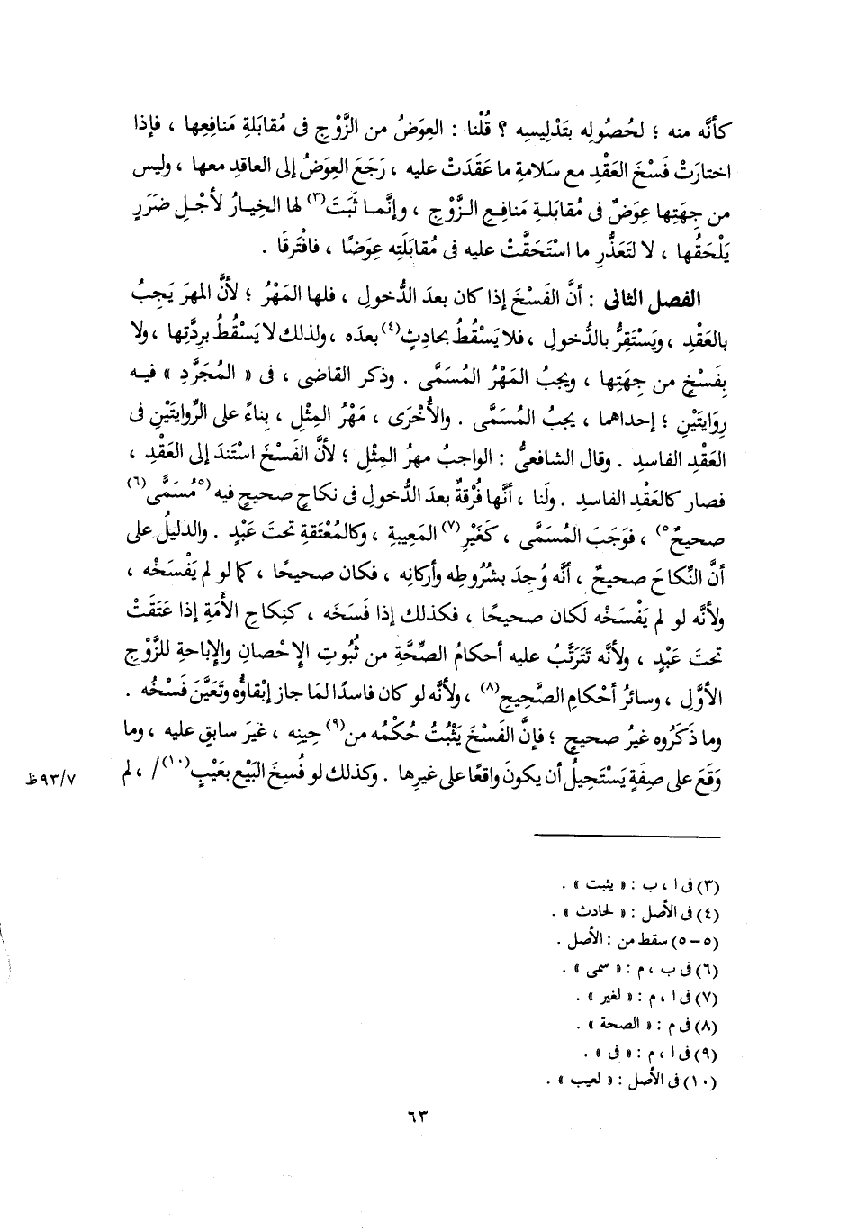 الفصل الثانى: أَنَّ الفَسْخَ إذا كان بعدَ الدُّخولِ، فلها المَهْرُ؛ لأنَّ المهرَ يَجِبُ بالعَقْدِ، ويَسْتَقِرُّ بالدُّخولِ، فلا يَسْقُطُ بحادِثٍ (٤) بعدَه، ولذلك لا يَسْقُطُ برِدَّتِها، ولا بِفَسْخٍ من جِهَتِها، ويجبُ المَهْرُ المُسَمَّى. وذكر القاضى، فى "المُجَردِ" فيه رِوَايتَيْنِ؛ إحداهما، يجبُ المُسَمَّى. والأُخْرَى، مَهْرُ المِثْلِ، بِناءً على الرِّوايتَيْنِ فى العَقْدِ الفاسدِ. وقال الشافعىُّ: الواجبُ مهرُ المِثْلِ؛ لأنَّ الفَسْخَ اسْتَندَ إلى العَقْدِ، فصار كالعَقْدِ الفاسدِ. ولَنا، أنَّها فُرْقة بعدَ الدُّخولِ فى نكاحٍ صحيحٍ فيه [مُسَمًّى (٥) صحيحٌ] (٦)، فوَجَبَ المُسَمَّى، كَغَيْرِ (٧) المَعِيبةِ، وكالمُعْتَقةِ تحتَ عَبْدٍ. والدليلُ على أَنَّ النِّكاحَ صحيحٌ، أنَّه وُجِدَ بشُرُوطِه وأركانِه، فكان صحيحًا، كما لو لم يَفْسَخْه، ولأنَّه لو لم يَفْسَخْه لَكان صحيحًا، فكذلك إذا فَسَخَه، كنِكاحِ الأَمَةِ إذا عَتَقَتْ تحتَ عَبْدٍ، ولأنَّه تَتَرَتَّبُ عليه أحكامُ الصِّحَّةِ من ثُبُوتِ الإحْصانِ والإباحةِ للزَّوْجِ الأوَّلِ، وسائرُ أحْكامِ الصَّحِيحِ (٨)، ولأنَّه لو كان فاسدًا لمَا جاز إبْقاؤُه وتَعَيَّنَ فَسْخُه. وما ذَكَرُوه غيرُ صحيحٍ؛ فإن الفَسْخَ يَثْبُتُ حُكْمُه من (٩) حِينِه، غيرَ سابقٍ عليه، وما وَقَعَ على صِفَةٍ يَسْتَحِيلُ أن يكونَ واقعًا على غيرِها. وكذلك لو فُسِخَ البَيْع بعَيْبٍ (١٠)، لم