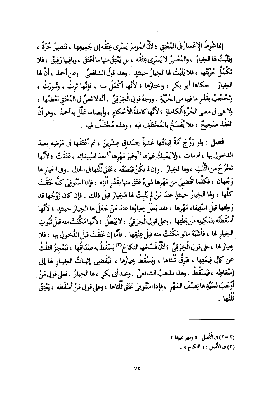 إنما شُرِطَ الإِعْسارُ فى المُعْتِقِ؛ لأنَّ المُوسرَ يَسْرِى عِتْقُه إلى جَمِيعِها، فتَصِيرُ حُرّةً، ويَثْبُتُ لها الخِيارُ، والمُعْسِرُ لا يَسْرِى عِتْقُه، بل يَعْتِقُ منها ما أعْتَقَ، وباقِيها رَقِيقٌ، فلا تَكْمُلُ حُرِّيَتُها، فلا يَثْبُتُ لها الخِيارُ حينئذٍ. وهذا قولُ الشافعىِّ. وعن أحمدَ، أَنَّ لها الخِيارَ. حكاها أبو بكرٍ، واختارَها؛ لأنَّها أكْمَلُ منه، فإنَّها تَرِثُ، وتُورَثُ، وتَحْجُبُ بقَدْرِ ما فيها من الحُرِّيَّةِ. ووجهُ قولِ الْخِرَقِىِّ، أنَّه لا نَصَّ فى المُعْتَقِ بَعْضُها، ولا هى فى معنى الحُرَّةِ الكاملةِ؛ لأنَّها كاملةُ الأحْكامِ، وأيضا ما عَلَّلَ به أحمدُ، وهو أَنَّ العَقْدَ صَحِيحٌ، فلا يُفْسَخُ بالمُخْتَلَفِ فيه، وهذه مُخْتَلَفٌ فيها.