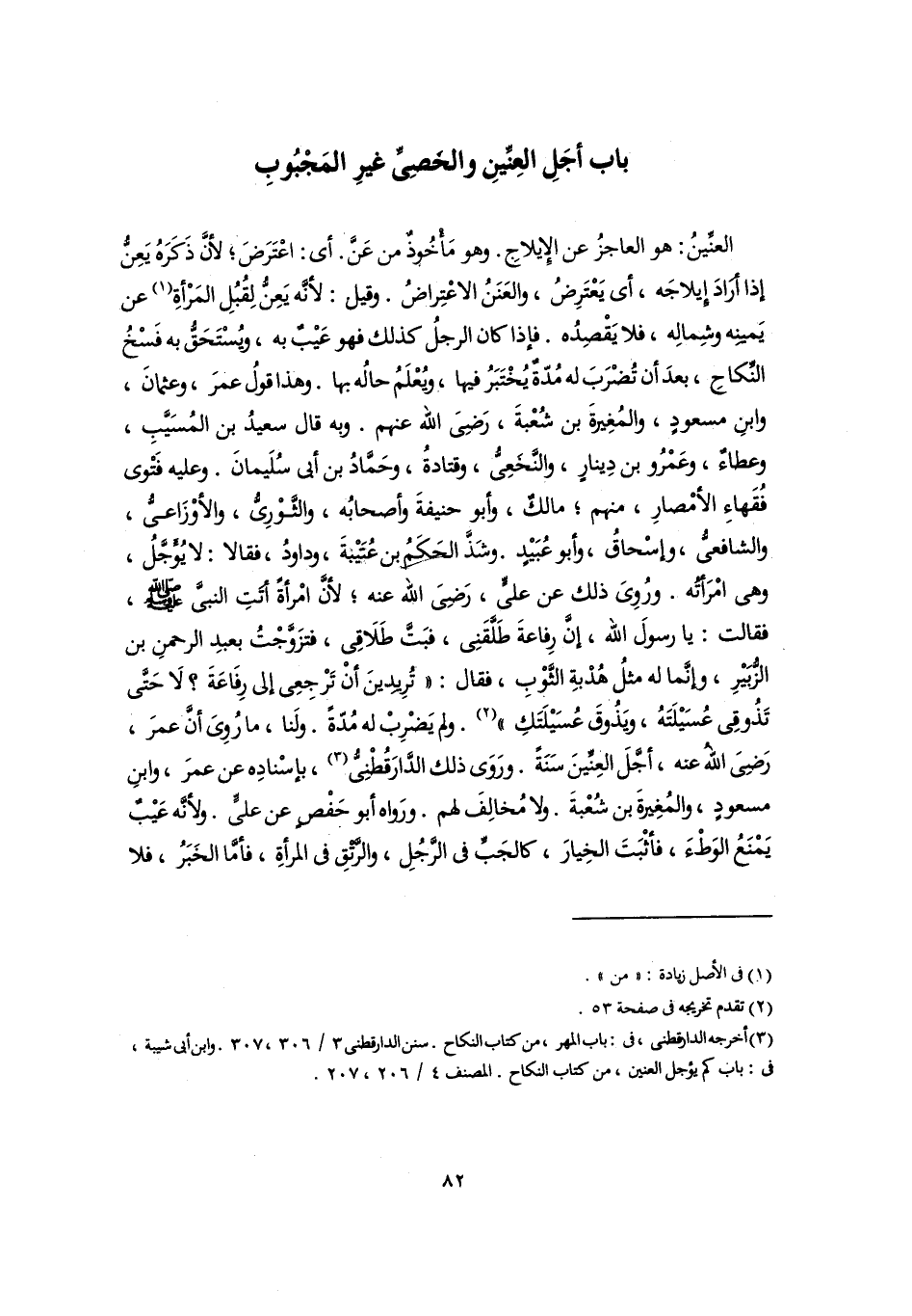 (٣) أخرجه الدارقطنى، فى: باب المهر، من كتاب النكاح. سنن الدارقطنى ٣/ ٣٠٦، ٣٠٧. وابن أبى شيبة، فى: باب كم يؤجل العنين، من كتاب النكاح. المصنف ٤/ ٢٠٦، ٢٠٧.