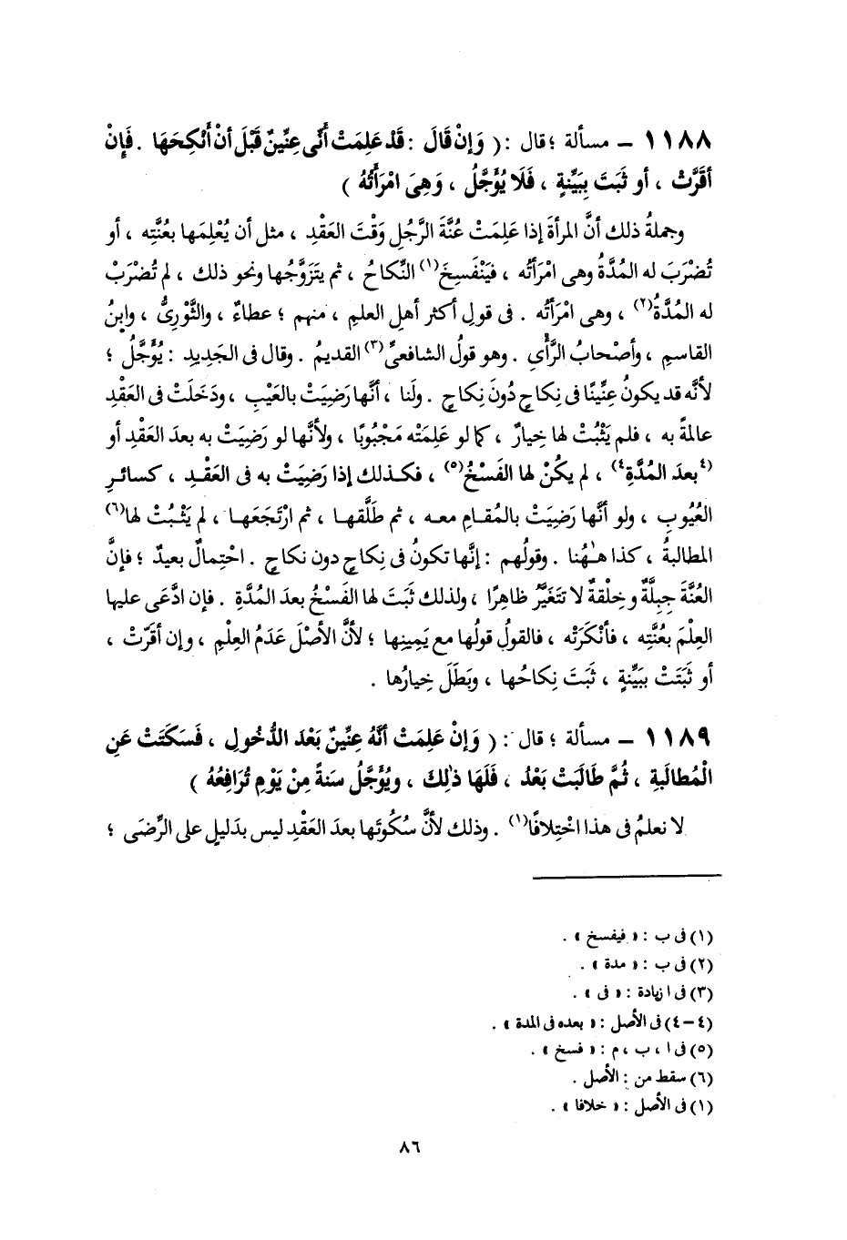 وجملةُ ذلك أَنَّ المرأةَ إذا عَلِمَتْ عُنَّةَ الرَّجُلِ وَقْتَ العَقْدِ، مثل أن يُعْلِمَها بعُنَّتِه، أو تُضْرَبَ له المُدَّةُ وهى امْرَأتُه، فيَنْفَسِخَ (١) النِّكاحُ، ثم يتَزَوَّجُها ونحو ذلك، لم تُضْرَبْ له المُدَّةُ (٢)، وهى امْرَأتُه. فى قولِ أكثر أهلِ العلمِ، منهم؛ عطاءٌ، والثَّوْرِىُّ، وابنُ القاسمِ، وأصْحابُ الرَّأْىِ. وهو قولُ الشافعىِّ (٣) القديمُ. وقال فى الجَدِيد: يُؤَجَّلُ؛ لأنَّه قد يكونُ عِنِّينًا فى نِكاحٍ دُونَ نِكاحٍ. ولَنا، أنَّها رَضِيَتْ بالعَيْبِ، ودَخَلَتْ فى العَقْدِ عالمةً به، فلم يَثْبُتْ لها خِيارٌ، كما لو عَلِمَتْه مَجْبُوبًا، ولأنَّها لو رَضِيَتْ به بعدَ العَقْدِ أو [بعدَ المُدَّةِ] (٤)، لم يكُنْ لها الفَسْخُ (٥)، فكذلك إذا رَضِيَتْ به فى العَقْدِ، كسائرِ العُيُوبِ، ولو أنَّها رَضِيَتْ بالمُقامِ معه، ثم طَلَّقها، ثم ارْتَجَعَها، لم يَثْبُتْ لها (٦) المطالبةُ، كذا ههُنا. وقولُهم: إنَّها تكونُ فى نِكاحٍ دون نكاحٍ. احْتِمالٌ بعيدٌ؛ فإنَّ العُنَّةَ جِبلَّةٌ وخِلْقةٌ لا تتَغَيَّرُ ظاهِرًا، ولذلك ثَبَتَ لها الفَسْخُ بعدَ المُدَّةِ. فإن ادَّعَى عليها العِلْمَ بعُنَّتِه، فأنْكَرَتْه، فالقولُ قولُها مع يَمِينِها؛ لأنَّ الأصْلَ عَدَمُ العِلْمِ، وإن أقَرّتْ، أو ثَبَتَتْ ببَيِّنةٍ، ثَبَتَ نِكاحُها، وبَطلَ خِيارُها.