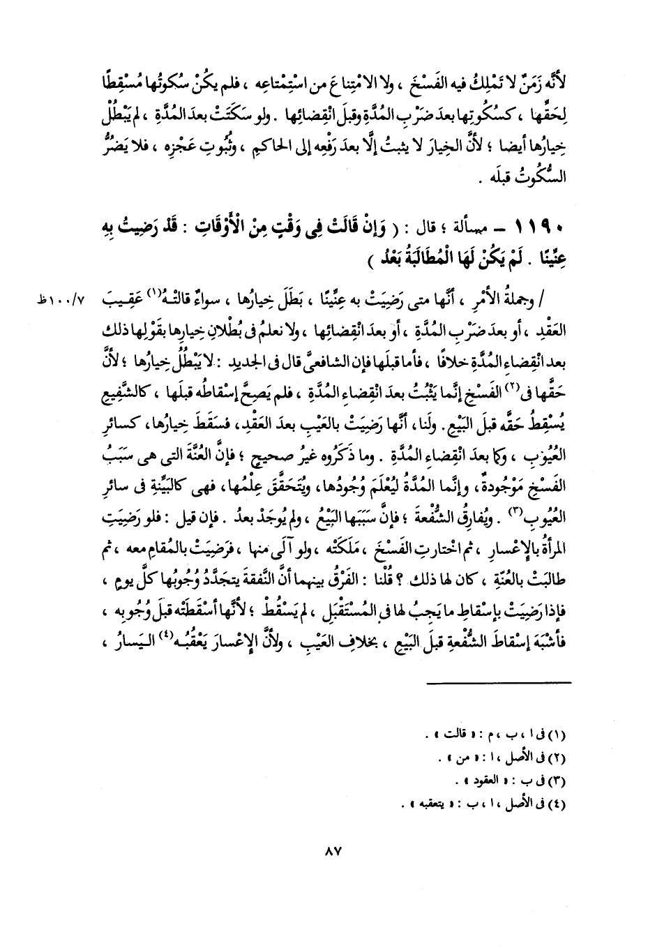 وجملةُ الأمْرِ، أنَّها متى رَضِيَتْ به عِنِّينًا، بَطَلَ خِيارُها، سواءٌ قالتْهُ (١) عَقِيبَ العَقْدِ، أو بعدَ ضَرْبِ المُدَّةِ، أو بعدَ انْقِضائِها، ولا نعلمُ فى بُطلانِ خِيارِها بقَوْلِها ذلك بعد انْقِضاءِ المُدَّةِ خلافًا، فأما قبلَها فإن الشافعىَّ قال فى الجديدِ: لا يَبْطُلُ خِيارُها؛ لأنَّ حَقَّها فى (٢) الفَسْخِ إنَّما يَثْبُتُ بعدَ انْقِضاءِ المُدَّةِ، فلم يَصِحَّ إسْقاطُه قبلَها، كالشَّفِيعِ يُسْقِطُ حَقَّه قبلَ البَيْعِ. ولَنا، أنَّها رَضِيَتْ بالعَيْبِ بعدَ العَقْدِ، فسَقَطَ خِيارُها، كسائرِ العُيُوبِ، وكما بعدَ انْقِضاءِ المُدَّةِ. وما ذَكَرُوه غيرُ صحيحٍ، فإنَّ العُنَّةَ التى هى سَبَبُ الفَسْخِ مَوْجُودةٌ، وإنَّما المُدَّةُ ليُعْلَمَ وُجُودُها، ويُتَحَقَّقَ عِلْمُها، فهى كالبَيِّنةِ فى سائرِ العُيُوبِ (٣). ويُفارِقُ الشُّفْعةَ؛ فإنَّ سَبَبَها البَيْعُ، ولم يُوجَدْ بعدُ. فإن قيل: فلو رَضِيَتِ المرأةُ بالإِعْسارِ، ثم اخْتارتِ الفَسْخَ، مَلَكَتْه، ولو آلَى منها، فرَضِيَتْ بالمُقامِ معه، ثم طالبَتْ بالعُنّةِ، كان لها ذلك؟ قُلْنا: الفَرْقُ بينهما أَنَّ النَّفقةَ يتجَدَّدُ وُجُوبُها كلَّ يومٍ, فإذا رَضِيَتْ بإسْقاطِ ما يَجِبُ لها فى المُسْتَقْبَلِ، لم يَسْقُطْ؛ لأنَّها أسْقَطَتْه قبلَ وُجُوبِه، فأشْبَهَ إسْقاطَ الشُّفْعةِ قبلَ البَيْعِ، بخلافِ العَيْبِ، ولأنَّ الإِعْسارَ يَعْقُبُه (٤) اليَسارُ،