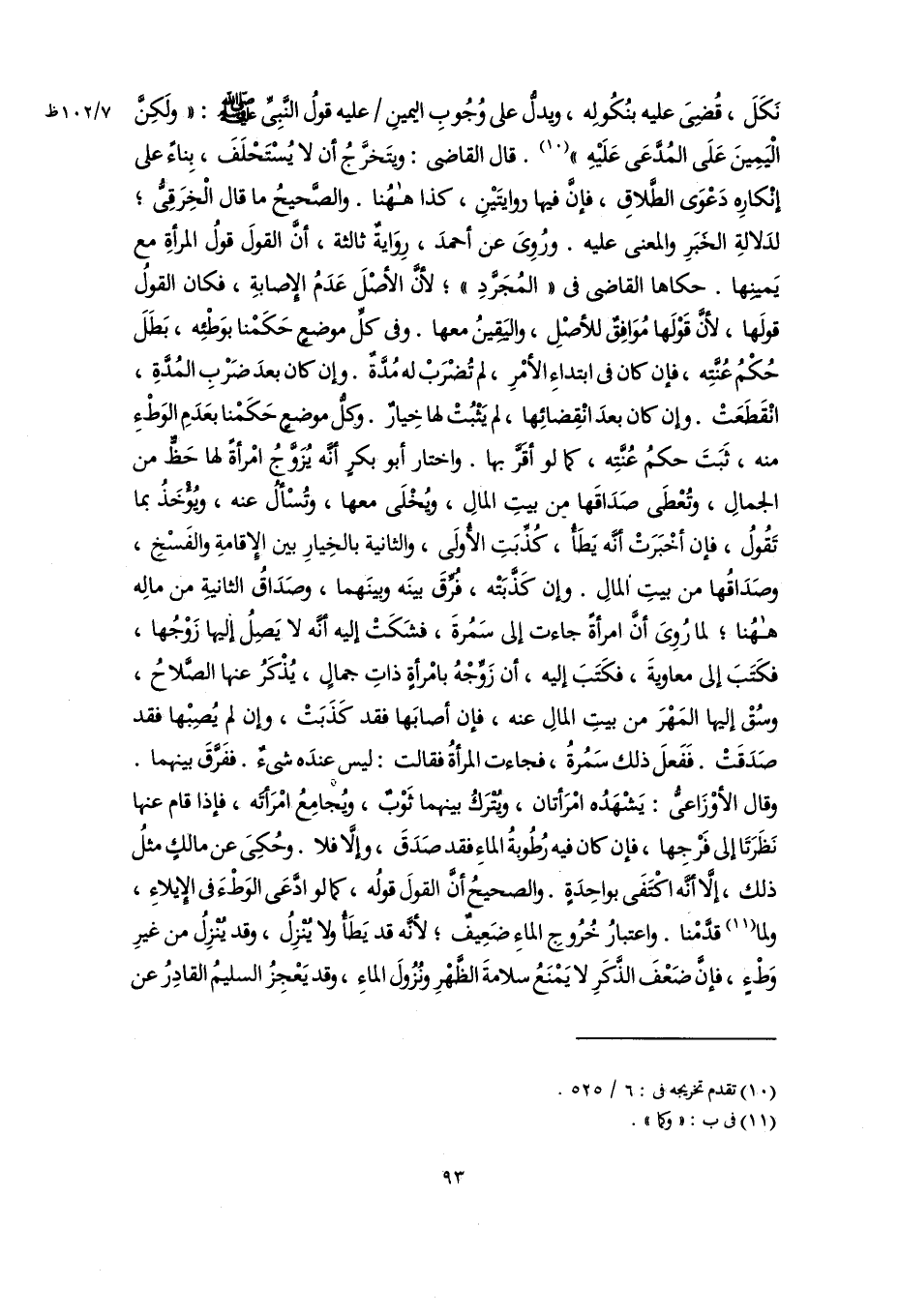 نَكَلَ، قُضِىَ عليه بنُكُولِه، ويدلُّ على وُجُوبِ اليمينِ عليه قولُ النَّبِىِّ -صلى اللَّه عليه وسلم-: "ولَكِنَّ الْيَمِينَ عَلَى المُدَّعَى عَلَيْهِ" (١٠). قال القاضى: ويتَخرَّجُ أن لا يُسْتَحْلَفَ، بِناءً على إنْكارِه دَعْوَى الطَّلاقِ، فإنَّ فيها روايتَيْنِ، كذا ههُنا. والصَّحيحُ ما قال الْخِرَقِىُّ؛ لدَلالةِ الخبَرِ والمعنى عليه. ورُوِىَ عن أحمدَ، رِوَايةٌ ثالثة، أَنَّ القولَ قولُ المرأةِ مع يَمينِها. حكاها القاضى فى "المُجَرَّدِ" لأنَّ الأصْلَ عَدَمُ الإِصابةِ، فكان القولُ قولَها؛ لأنَّ قَوْلَها مُوَافِقٌ للأَصْلِ، واليَقِينُ معها. وفى كلِّ موضعٍ حَكَمْنا بوَطْئِه، بَطَلَ حُكْمُ عُنَّتِه، فإن كان فى ابتداءِ الأمْرِ، لم تُضْرَبْ له مُدَّةٌ. وإن كان بعدَ ضَرْبِ المُدَّةِ، انْقَطَعَتْ. وإن كان بعدَ انْقِضائِها، لم يَثْبُتْ لها خِيارٌ. وكلُّ موضعٍ حَكَمْنا بعَدَمِ الوَطْءِ منه، ثَبَتَ حكمُ عُنَّتِه، كما لو أقَرَّ بها. واختار أبو بكرٍ أنَّه يُزَوَّجُ امْرأةً لها حَظٌّ من الجمالِ، وتُعْطَى صَدَاقَها ين بيتِ المالِ، ويُخْلَى معها، وتُسْألُ عنه، ويُؤْخَذُ بما تَقُولُ، فإن أخْبَرَتْ أنَّه يَطَأُ، كُذِّبَتِ الأُولَى، والثانية بالخِيارِ بين الإِقامةِ والفَسْخِ، وصَدَاقُها من بيتِ المالِ. وإن كَذَّبَتْه، فُرِّقَ بينَه وبينَهما، وصَدَاقُ الثانيةِ من مالِه ههُنا؛ لما رُوِىَ أَنَّ امرأةً جاءت إلى سَمُرةَ، فشَكَتْ إليه أنَّه لا يَصِلُ إليها زَوْجُها، فكَتَبَ إلى معاويةَ، فكَتَبَ إليه، أن زَوِّجْهُ بامْرأةٍ ذاتِ جمالٍ، يُذْكَرُ عنها الصَّلاحُ، وسُقْ إليها المَهْرَ من بيتِ المالِ عنه، فإن أصابَها فقد كَذَبَتْ، وإن لم يُصِبْها فقد صَدَقَتْ. فَفَعلَ ذلك سَمُرةُ، فجاءت المرأةُ فقالت: ليس عندَه شىءٌ. ففَرَّقَ بينهما. وقال الأوْزَاعىُّ: يَشْهَدُه امْرَأتان، ويُتْرَكُ بينهما ثَوْبٌ، ويُجامِعُ امْرَأتَه، فإذا قام عنها نَظَرَتَا إلى فَرْجِها، فإن كان فيه رُطُوبةُ الماءِ فقد صَدَقَ، وإلَّا فلا. وحُكِىَ عن مالكٍ مثلُ ذلك، إلَّا أنَّه اكْتَفَى بواحِدَةٍ. والصحيحُ أَنَّ القولَ قولُه، كما لو ادَّعَى الوَطْءَ فى الإِيلاءِ، ولما (١١) قدَّمْنا. واعتبارُ خُرُوجِ الماءِ ضَعِيفٌ؛ لأنَّه قد يَطَأُ ولا يُنْزِلُ، وقد يُنْزِلُ من غيرِ وَطْءٍ، فإنَّ ضَعْفَ الذَّكَرِ لا يَمْنَعُ سلامةَ الظَّهْرِ ونُزُولَ الماءِ، وقد يَعْجِزُ السليمُ القادِرُ عن