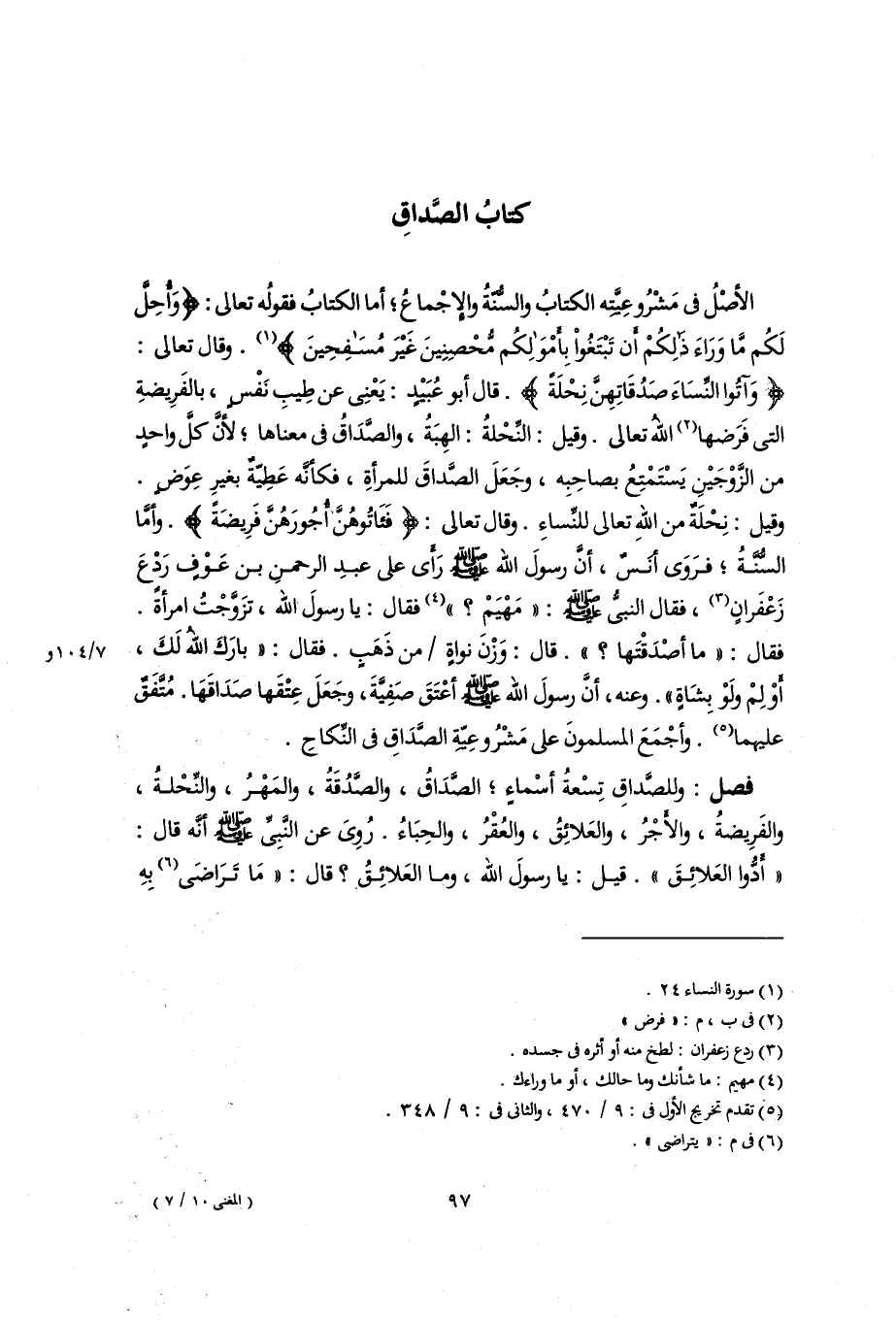 الأصْلُ فى مَشْرُوعِيَّتِه الكتابُ والسُّنّةُ والإِجْماعُ؛ أما الكتابُ فقولُه تعالى: {وَأُحِلَّ لَكُمْ مَا وَرَاءَ ذَلِكُمْ أَنْ تَبْتَغُوا بِأَمْوَالِكُمْ مُحْصِنِينَ غَيْرَ مُسَافِحِينَ} (١). وقال تعالى: {وَآتُوا النِّسَاءَ صَدُقَاتِهِنَّ نِحْلَةً}. قال أبو عُبَيْدٍ: يَعْنِى عن طِيبِ نَفْسٍ، بالفَرِيضةِ التى فَرَضها (٢) اللَّهُ تعالى. وقيل: النِّحْلةُ: الهِبَةُ، والصَّدَاقُ فى معناها؛ لأنَّ كلَّ واحدٍ من الزَّوْجَيْنِ يَسْتَمْتِعُ بصاحِبِه، وجَعَلَ الصَّداقَ للمرأةِ، فكأنَّه عَطِيّةٌ بغيرِ عِوَضٍ. وقيل: نِحْلَةٌ من اللَّهِ تعالى للنِّساءِ. وقال تعالى: {فَآتُوهُنَّ أُجُورَهُنَّ فَرِيضَةً}. وأمَّا السُّنَّةُ؛ فرَوَى أنَسٌ، أن رسولَ اللَّه -صلى اللَّه عليه وسلم- رَأَى على عبدِ الرحمنِ بن عَوْفٍ رَدْعَ زَعْفَرانٍ (٣)، فقال النبىُّ -صلى اللَّه عليه وسلم-: "مَهْيَمْ؟ " (٤) فقال: يا رسولَ اللَّه، تزَوَّجْتُ امرأةً. فقال: "ما أصْدَقْتَها؟ ". قال: وَزْنَ نواةٍ من ذَهَبٍ. فقال: "بارَكَ اللَّهُ لَكَ، أوْلِمْ ولَوْ بِشَاةٍ". وعنه، أَنَّ رسولَ اللَّه -صلى اللَّه عليه وسلم- أعْتَقَ صَفِيَّةَ، وجَعَلَ عِتْقَها صَدَاقَهَا. مُتَّفَقٌ عليهما (٥). وأجْمَعَ المسلمونَ على مَشْرُوعِيّةِ الصَّدَاقِ فى النِّكاحِ.
