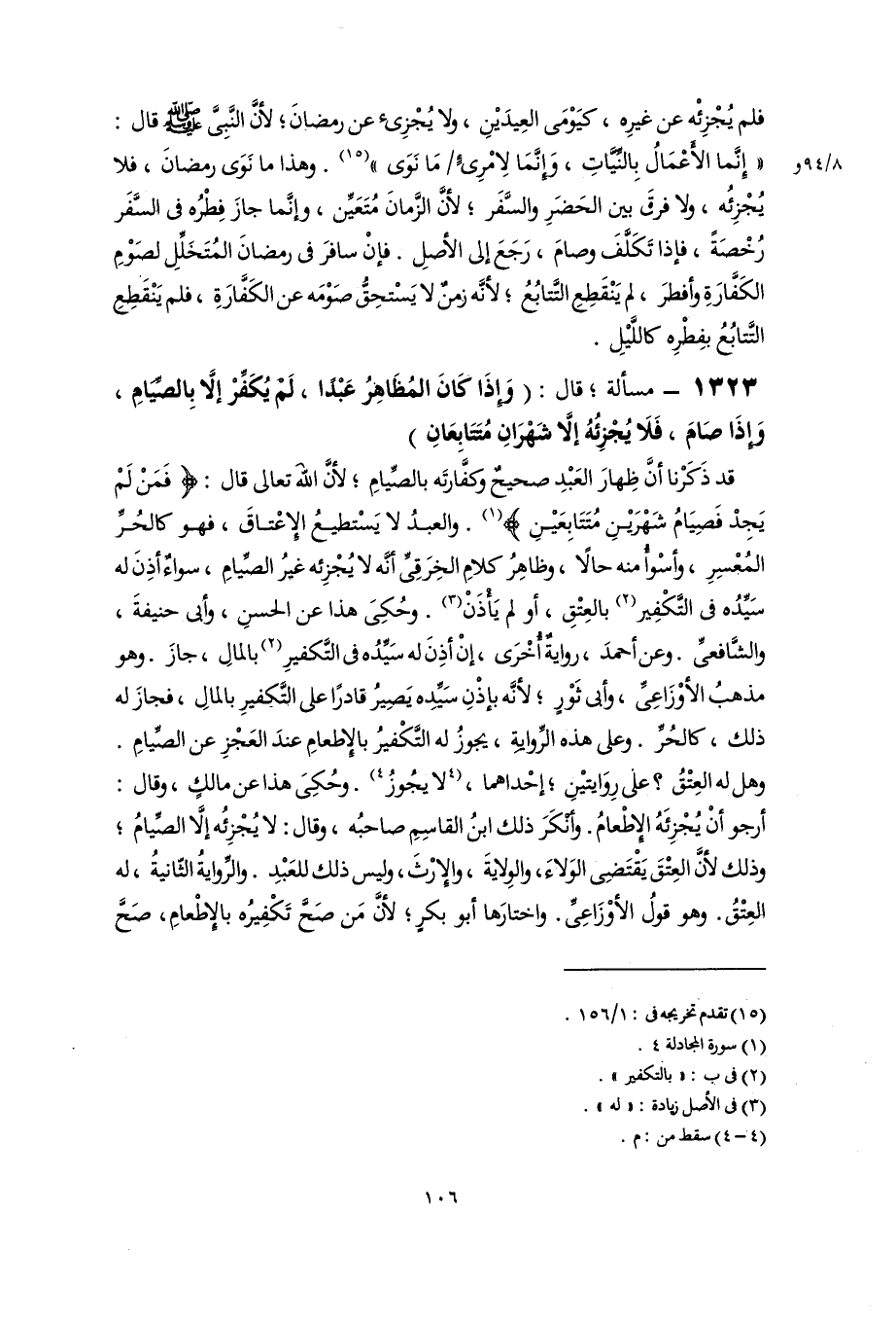 ١٣٢٣ - مسألة؛ قال: (وَإِذَا كَانَ المُظَاهِرُ عَبْدًا، لَمْ يُكَفِّرْ إِلَّا بِالصِّيَامِ، وَإِذَا صَامَ، فَلَا يُجْزِئُهُ إِلَّا شَهْرَانِ مُتَتَابِعَانِ)