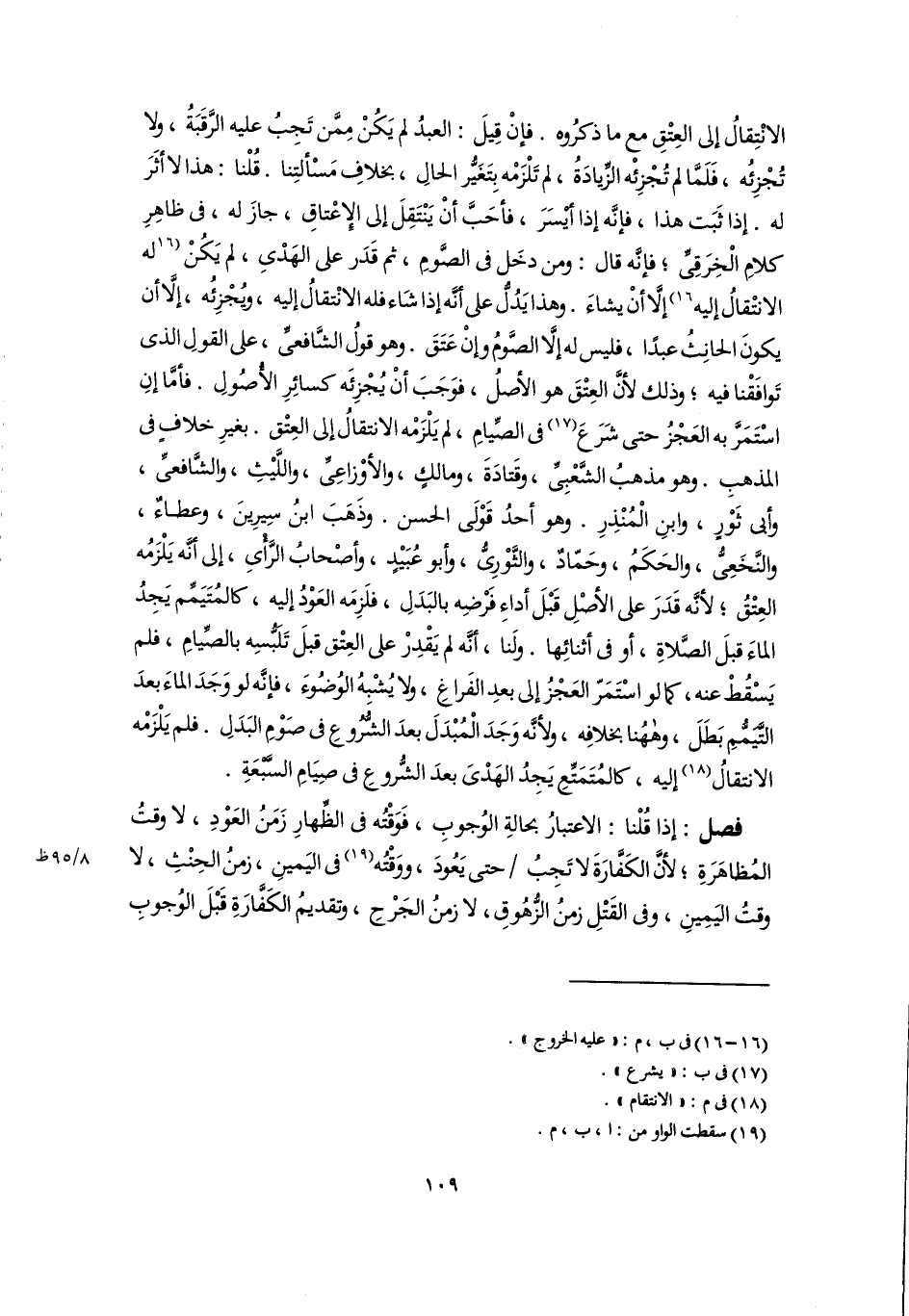 فصل: إذا قُلْنا: الاعتبارُ بحالةِ الوُجوبِ، فَوَقْتُه فى الظِّهارِ زَمَنُ العَوْدِ، لا وقتُ المُظاهَرَةِ؛ لأنَّ الكَفَّارَةَ لا تَجِبُ حتى يَعُودَ، ووَقْتُه (١٩) فى اليَمينِ، زمنُ الحِنْثِ، لا وقتُ اليَمِينِ، وفى القَتْلِ زمنُ الزُّهُوقِ، لا زمنُ الجَرْحِ، وتقديمُ الكَفَّارَةِ قَبْلَ الوُجوبِ