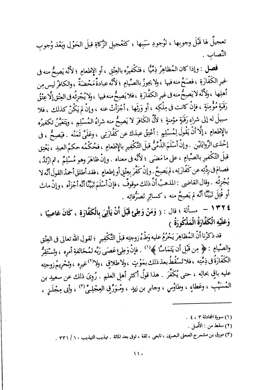 فصل: وإذا كان المُظاهِرُ ذِمِّيًّا، فتَكْفيرُه بالعِتْقِ، أو الإِطعامِ؛ لأنَّه يَصِحُّ منه فى غيرِ الكَفّارَةِ، فصَحَّ منه فيها، ولا يجوزُ بالصِّيامِ؛ لأنَّه عبادةٌ مَحْضَةٌ، والكافرُ ليس مِن أهلِها، ولأنَّه لا يَصِحُّ منه فى غيرِ الكفَّارَةِ، فلا يَصِحُّ منه فيها، ولا يُجْزِئُه فى العِتْق إلَّا عِتْقُ رَقَبَةٍ مُؤْمِنَةٍ، فإنْ كانت فى مِلْكِه، أو وَرثها، أجْزَأتْ عنه، وإِنْ لم يَكُنْ كذلك، فلا سبيلَ له إلى شراءِ رَقَبَةٍ مؤمنةٍ؛ لأنَّ الكَافرَ لا يَصِحُّ منه شراءُ المُسْلِمِ، ويَتَعَيَّنُ تكفيرُه بالإِطعامِ، إلّا أَنْ يَقُولَ لِمُسْلِمٍ: أعْتِقْ عبدَك عن كَفَّارَتِى، وعَلَىَّ ثَمَنُه. فيَصِحُّ، فى إحْدَى الرِّوايَتَيْنِ. وإِنْ أسْلَمَ الذِّمِّىُّ قبلَ التَّكْفِيرِ بالإطعامِ، فحُكْمُه حكمُ العبدِ، يَعْتِق قبلَ التّكْفيرِ بالصِّيامِ، على ما مَضَى؛ لأنَّه فى معناه. وإِنْ ظاهَرَ وهو مُسْلِمٌ، ثم ارْتَدَّ، فصامَ فى رِدَّتِه عن كَفّارَتِه، لم يَصِحَّ. وأنْ كَفرَ بِعِتْقٍ أو إطعامٍ، فقد أطلقَ أحمدُ القولَ أنَّه لا يُجْزِئُه. وقال القاضى: المذهبُ أَنَّ ذلك موقوفٌ، فإنْ أسْلَمَ تَبَيَّنَّا أنَّه أجْزَأه، وإِنْ ماتَ أو قُتِلَ تَبَيَّنَّا أنَّه لم يَصِحَّ منه، كسائِرِ تَصَرُّفاتِه.