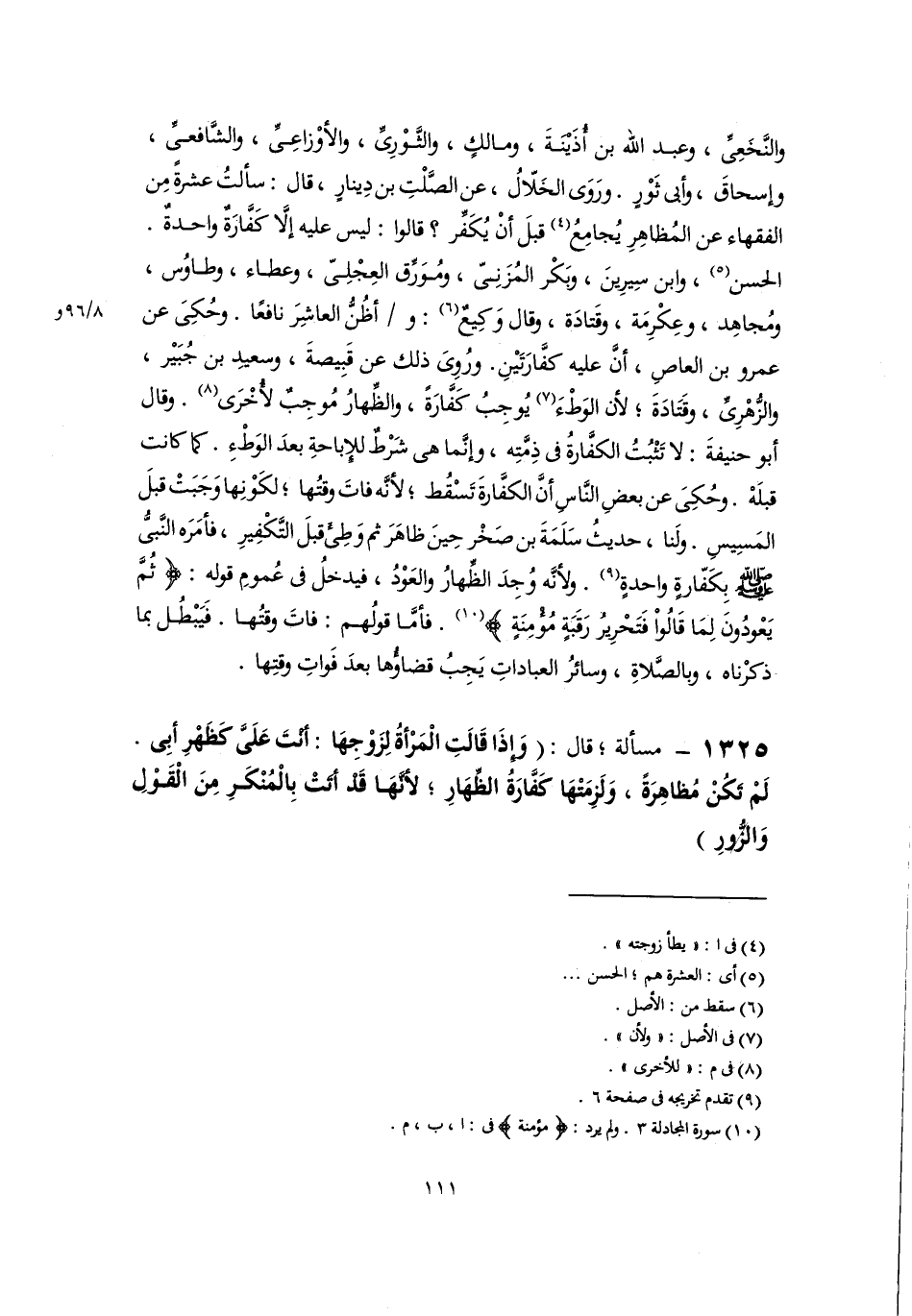 والنَّخَعِىِّ، وعبد اللَّه بن أُذَيْنَةَ، ومالكٍ، والثَّوْرِىِّ، والأَوْزاعِىِّ، والشَّافعىِّ، وإسحاقَ، وأبى ثَوْرٍ. ورَوَى الخَلّالُ، عن الصَّلْتِ بن دِينارٍ، قال: سألتُ عشرةً مِن الفقهاء عن المُظاهِرِ يُجامِعُ (٤) قبلَ أَنْ يُكَفِّر؟ قالوا: ليس عليه إلَّا كَفَّارَةٌ واحدةٌ. الحسن (٥)، وابن سِيرِينَ، وبَكْر المُزَنِىّ، ومُوَرَّق العِجْلِىّ، وعطاء، وطاوُس، ومُجاهِد، وعِكْرِمَة، وقَتادَة، وقال وَكِيعٌ (٦): وأظُنُّ العاشِرَ نافعًا. وحُكِىَ عن عمرو بن العاصِ، أَنَّ عليه كفَّارَتَيْنِ. ورُوِىَ ذلك عن قَبِيصةَ، وسعيدِ بن جُبَيْر، والزُّهْرِىِّ، وقَتَادَةَ؛ لأنَّ الوَطْءَ (٧) يُوجِبُ كَفَّارَةً، والظِّهارُ مُوجِبٌ لأُخْرَى (٨). وقال أبو حنيفةَ: لا تَثْبُتُ الكفارةُ فى ذِمَّتِه، وإنَّما هى شَرْطٌ للإِباحةِ بعدَ الوَطْءِ. كما كانت قبلَهْ. وحُكِىَ عن بعضِ النَّاسِ أَنَّ الكفَّارةَ تَسْقُط؛ لأنَّه فاتَ وقتُها؛ لكَوْنِها وَجَبَتْ قبلَ المَسِيسِ. ولَنا، حديثُ سَلَمَةَ بن صَخْر حِينَ ظاهَرَ ثم وَطِئَ قبلَ التَّكْفِيرِ، فأمَرَه النَّبىُّ -صلى اللَّه عليه وسلم- بِكَفّارةٍ واحدةٍ (٩). ولأنَّه وُجِدَ الظِّهارُ والعَوْدُ، فيدخلُ فى عُمومِ قوله: {وَالَّذِينَ يُظَاهِرُونَ مِنْ نِسَائِهِمْ ثُمَّ يَعُودُونَ لِمَا قَالُوا فَتَحْرِيرُ رَقَبَةٍ مُؤْمِنَةٍ} (١٠). فأمَّا قولُهم: فاتَ وقتُها. فَيَبْطُل بما ذكرْناه، وبالصَّلاةِ، وسائرُ العباداتِ يَجِبُ قضاؤُها بعدَ فَواتِ وقتِها.