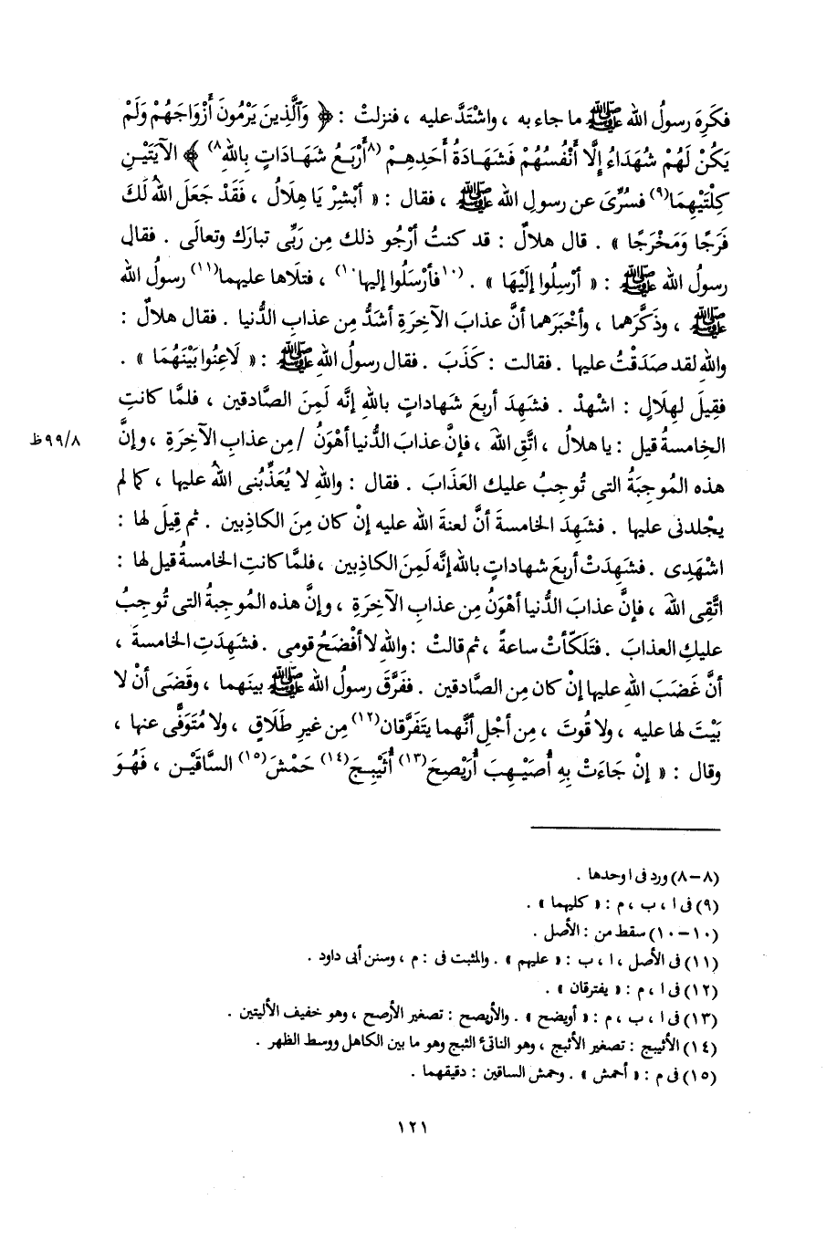 فكَرِهَ رسولُ اللَّه -صلى اللَّه عليه وسلم- ما جاء به، واشْتَدَّ عليه، فنزلتْ: {وَالَّذِينَ يَرْمُونَ أَزْوَاجَهُمْ وَلَمْ يَكُنْ لَهُمْ شُهَدَاءُ إِلَّا أَنْفُسُهُمْ فَشَهَادَةُ أَحَدِهِمْ [أَرْبَعُ شَهَادَاتٍ بِاللَّهِ] (٨)} الآيَتَيْنِ كِلْتَيْهِمَا (٩) فسُرِّىَ عن رسولِ اللَّه -صلى اللَّه عليه وسلم-، فقال: "أبْشِرْ يَا هِلَالُ، فَقَدْ جَعَلَ اللَّهُ لَكَ فَرَجًا وَمَخْرَجًا". قال هلالٌ: قد كنتُ أرْجُو ذلك مِن رَبِّى تبارَك وتعالَى. فقال رسولُ اللَّه -صلى اللَّه عليه وسلم-: "أرْسِلُوا إلَيْهَا". [فأرْسَلُوا إليها] (١٠)، فتلَاها عليهما (١١) رسولُ اللَّه -صلى اللَّه عليه وسلم-، وذَكَّرَهما، وأخْبَرَهما أَنَّ عذابَ الآخِرَةِ أشَدُّ مِن عذابِ الدُّنيا. فقال هلالٌ: واللَّهِ لقد صَدَقْتُ عليها. فقالت: كَذَبَ. فقال رسولُ اللَّهِ -صلى اللَّه عليه وسلم-: "لَاعِنُوا بَيْنَهُمَا". فقِيلَ لهِلَالٍ: اشْهدْ. فشَهِدَ أربعَ شَهاداتٍ باللَّهِ إنَّه لَمِنَ الصَّادقين، فلمَّا كانتِ الخِامسةُ قيل: يا هلالُ، اتَّقِ اللَّه، فإنَّ عذابَ الدُّنيا أهْوَنُ مِن عذابِ الآخِرَةِ، وإنَّ هذه المُوجِبَةُ التى تُوجِبُ عليك العَذَابَ. فقال: واللَّهِ لا يُعَذِّبُنى اللَّهُ عليها، كما لم يجْلدنى عليها. فشَهِدَ الخامسةَ أن لعنةَ اللَّه عليه إنْ كان مِنَ الكاذِبين. ثم قِيلَ لها: اشْهَدِى. فشَهدَتْ أربعَ شهاداتٍ باللَّه إنَّه لَمِنَ الكاذِبين، فلمَّا كانتِ الخامسةُ قيل لها: اتَّقِى اللَّهَ، فإنَّ عذابَ الدُّنيا أهْوَنُ مِن عذابِ الآخِرَةِ، وإنَّ هذه المُوجِبةُ التى تُوجِبُ عليكِ العذابَ. فتَلَكّأتْ ساعةً، ثم قالتْ: واللَّهِ لا أفْضَحُ قومى. فشَهِدَتِ الخامسةَ، أَنَّ غَضَبَ اللَّهِ عليها إنْ كان مِن الصَّادقين. ففَرَّقَ رسولُ اللَّه -صلى اللَّه عليه وسلم- بينَهما، وقَضَى أَنْ لا بَيْتَ لها عليه، ولا قُوتَ، مِن أجْلِ أنَّهما يتَفَرَّقان (١٢) مِن غيرِ طَلَاقٍ، ولا مُتَوَفًّى عنها، وقال: "إنْ جَاءَتْ بِهِ أُصَيْهِبَ أُرَيْصِحَ (١٣) أُثَيْبِجَ (١٤) حَمْشَ (١٥) السَّاقَيْن، فَهُوَ