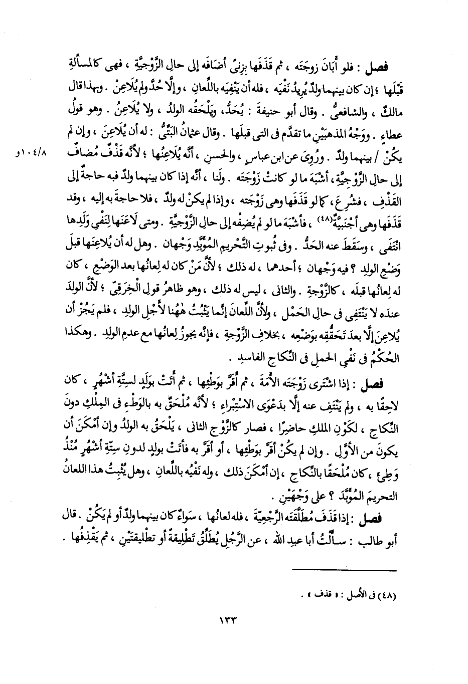 فصل: فلو أَبَانَ زوجَتَه، ثم قَذَفَها بِزِنًى أضَافَه إلى حالِ الزَّوْجيَّةِ، فهى كالمسألةِ قَبْلَها؛ إن كان بينهما ولدٌ يُرِيدُ نَفْيَه، فله أَنَّ يَنْفِيَه باللِّعانِ، وإلَّا حُدَّ ولم يُلَاعِنْ. وبهذا قال مالكٌ، والشافعىُّ. وقال أبو حنيفةَ: يُحَدُّ، ويَلْحَقُه الولدُ، ولا يُلَاعِنُ. وهو قولُ عطاءٍ. ووَجْهُ المذهبَيْنِ ما تقدَّم فى التى قبلَها. وقال عثمانُ البَتِّىُّ: له أَنَّ يُلَاعِنَ، وإن لم يكُنْ بينهما ولدٌ. ورُوِىَ عن ابن عباسٍ، والحسنِ، أنَّه يُلَاعِنُها؛ لأنَّه قَذْفٌ مُضافٌ إلى حالَ الزَّوْجِيَّةِ، أشْبَهَ ما لو كانتْ زَوْجَتَه. ولَنا، أنَّه إذا كان بينهما ولدٌ فبه حاجةٌ إلى القَذْفِ، فشُرِعَ، كما لو قَذَفَها وهى زَوْجَته، وإذا لم يكنْ له ولدٌ، فلا حاجةَ به إليه، وقد قَذَفَها وهى أجْنَبيَّةٌ (٤٨)، فأشْبَهَ ما لو لم يُضِفْه إلى حالِ الزَّوجيَّةِ. ومتى لَاعَنَها لِنَفْىِ وَلَدِها انْتَفَى، وسَقَطَ عنه الحَدُّ. وفى ثُبوتِ التَّحْريمِ المُؤَبَّدِ وَجْهان. وهل له أَن يُلاعِنَها قبلَ وَضْعِ الولدِ؟ فيه وَجْهان؛ أحدهما، له ذلك؛ لأنَّ مَنْ كان له لِعانُها بعد الوَضْعِ، كان له لِعانُها قبلَه، كالزَّوجةِ. والثانى، ليس له ذلك، وهو ظاهرُ قولِ الْخِرَقِىّ؛ لأنَّ الولدَ عندَه لا يَنْتَفِى فى حالِ الحَمْل، ولأنَّ اللِّعانَ إنَّما يَثْبُتُ ههُنا لأَجْلِ الولدِ، فلم يَجُزْ أَنَّ يُلاعِنَ إلَّا بعدَ تَحَقُّقِه بوَضْعِه، بخلافِ الزَّوْجةِ، فإنَّه يجوزُ لِعانُها مع عدمِ الولدِ. وهكذا الحُكْمُ فى نَفْىِ الحملِ فى النِّكاحِ الفاسدِ.