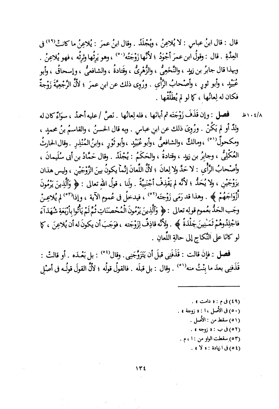 فصل: وإن قَذَفَ زَوْجَتَه ثم أبانَها، فله لِعانُها. نَصَّ عليه أحمدُ، سوَاءٌ كان له ولدٌ أو لم يَكُنْ. ورُوِىَ ذلك عن ابنِ عباسٍ. وبه قال الحسنُ، والقاسمُ بنُ محمدٍ، ومكحولٌ (٥١)، ومالكٌ، والشافعىُّ، وأبو عُبَيْدٍ، وأبو ثَوْرٍ، وابنُ المُنْذِرِ. وقال الحارثُ العُكْلِىُّ، وجابِرُ بن زَيْدٍ، وقتادةُ، والحَكَمُ: يُجْلَدُ. وقال حَمَّادُ بن أبى سُلَيمانَ، وأصْحابُ الرَّأْىِ: لا حَدَّ ولا لِعانَ؛ لأنَّ اللِّعانَ إنَّما يكونُ بينَ الزَّوْجَيْنِ، وليس هذان بزَوْجَيْنِ، ولا يُحَدُّ؛ لأنَّه لم يَقْذِفْ أجْنَبِيَّةً. ولَنا، قولُ اللَّهِ تعالى: {وَالَّذِينَ يَرْمُونَ أَزْوَاجَهُمْ}. وهذا قد رَمَى زَوْجتَه (٥٢)، فيدخلُ فى عُموم الآية، وإذا (٥٣) لم يُلاعِنْ وجَب الجَدُّ بعُموم قولِه تعالى: {وَالَّذِينَ يَرْمُونَ الْمُحْصَنَاتِ ثُمَّ لَمْ يَأْتُوا بِأَرْبَعَةِ شُهَدَاءَ فَاجْلِدُوهُمْ ثَمَانِينَ جَلْدَةً و}. ولأنَّه قاذِفٌ لِزَوْجَته، فوَجَبَ أَن يكونَ له أَن يُلاعِنَ، كما لو كانَا على النِّكاحِ إلى حالةِ اللِّعانِ.