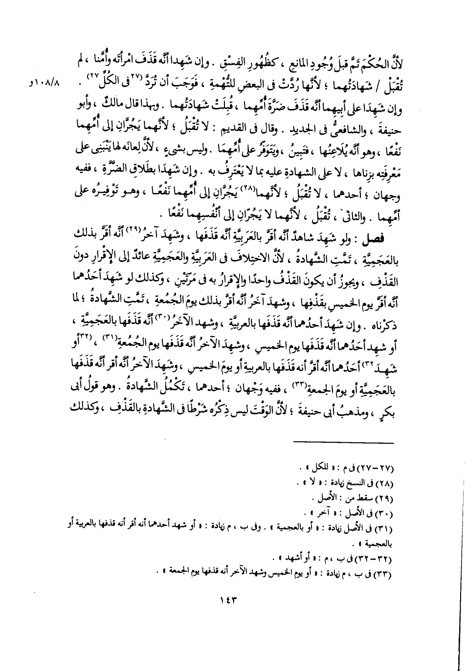 (٣١) فى الأصل زيادة: "أو بالعجمية". وفى ب، م زيادة: "أو شهد أحدهما أنه أقر أنه قذفها بالعربية أو بالعجمية".