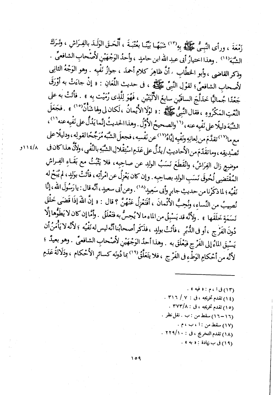 زَمْعَةَ، ورأى النَّبِىُّ -صلى اللَّه عليه وسلم- بِهِ (١٣) شَبَهًا بَيِّنًا بعُتْبَةَ، أَلْحَقَ الوَلدَ بالفِرَاشِ، وَتَرَكَ الشَّبَهَ (١٤). وهذا اختيارُ أبى عبدِ اللَّه ابن حامد، وأحدُ الوَجْهَيْنِ لأصْحابِ الشافعىِّ. وذكر القاضى، وأبو الخطَّابِ أَنَّ ظاهِرَ كلامِ أحمدَ، جوازُ نَفْيِه. وهو الوَجْهُ الثانِى لأصحابِ الشافعىِّ، لقوْلِ النَّبِىِّ -صلى اللَّه عليه وسلم-، فى حديث اللِّعَانِ: "إنْ جاءَتْ به أوْرَقَ جَعْدًا جُماليًّا خَدَلَّجَ الساقَيْنِ سابغَ الألْيَتَيْنِ، فَهُوَ لِلَّذِى رُمَيْت بِه". فأتَتْ به على النَّعْتِ المَكْرُوهِ، فقال النَّبِىُّ -صلى اللَّه عليه وسلم-: "لوْلا الأَيْمانُ، لَكان لى ولها شَأْنٌ (١٥) ". فجَعَلَ الشَّبَهَ دليلًا على نَفْيِه عنه، [والصحيحُ الأَوَّلُ. وهذا الحديثُ إنَّما يَدُلُّ على نَفْيِه عنه] (١٦)، مع ما (١٧) تقدَّمَ من لِعانِهِ ونَفْيِه إيَّاهُ (١٧) عن نَفْسِه، فجعلَ الشَّبَه مُرَجِّحًا لقولِه، ودليلًا على تَصْدِيِقِه، وما تقَدّمَ من الأحاديثِ يدُلُّ على عَدَمِ اسْتِقْلالِ الشَّبَهِ بالنَّفْىِ، ولأنَّ هذا كان فى موضِع زال الفِرَاشُ، وانْقَطَعَ نَسَبُ الولدِ عن صاحِبِه، فلا يَثْبُتُ مع بَقَاءِ الفِراشِ المُقْتَضِى لُحُوقَ نَسَبِ الولدِ بصاحِبِه. وإن كان يَعْزِلُ عن امْرأتِه، فأتَتْ بوَلدٍ، لم يُبَحْ له نَفْيُه؛ لما ذكَرْنا من حديثِ جابرٍ وأبى سَعِيدٍ (١٨). وعن أبى سعيدٍ، أنَّه قال: يا رَسُولَ اللَّه، إنَّا نُصِيبُ من النِّساءِ، ونُحِبُّ الأثْمانَ، أفَنَعْزِلُ عَنْهُنَّ؟ قال: "إِنَّ اللَّه إذَا قَضَى خَلْقَ نَسَمَةٍ خَلَقَها". ولأنَّه قد يَسْبِقُ من الماء ما لا يُحِسُّ به فتَعْلَقُ. وأمَّا إن كان لا يَطَؤُها إلَّا دُونَ الفَرْجِ، أو فى الدُّبُرِ، فأتَتْ بولدٍ، فذَكَر أصحابُنا أنَّه ليس له نَفْيُه؛ لأنَّه لا يَأْمَنُ أَنَّ يَسْبِقَ الماءُ إلى الفَرْجِ فيَعْلَقَ به. وهذا أحدُ الوَجْهَيْنِ لأصْحابِ الشافعىِّ. وهو بعيدٌ، لأنَّه من أحْكامِ الوَطْءِ فى الفَرْجِ، فلا يتَعَلَّقُ (١٩) بما دُونَه كسائرِ الأحْكام، ودَلَالةُ عَدَمِ