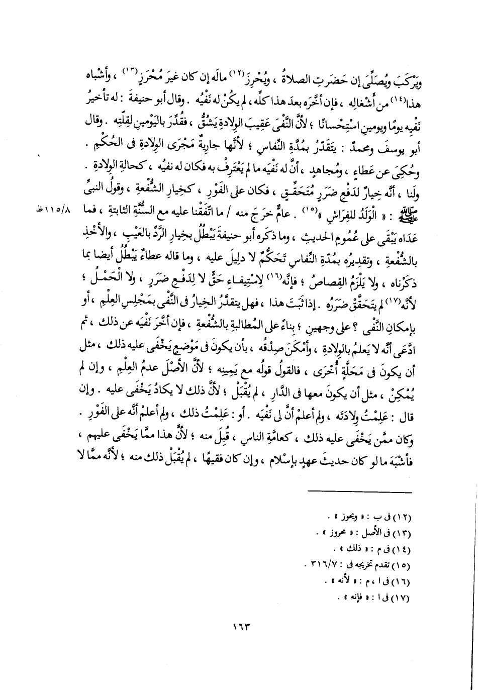 ويَرْكَبَ ويُصَلِّىَ إن حَضَرتِ الصلاةُ، ويُحْرِزَ (١٢) مالَه إن كان غيرَ مُحْرَزٍ (١٣)، وأشْباه هذا (١٤) من أَشْغالِه، فإن أخَّرَه بعدَ هذا كلِّه، لم يكُنْ له نَفْيُه. وقال أبو حنيفةَ: له تأخيرُ نَفْيِه يومًا ويومينِ اسْتِحْسانًا؛ لأنَّ النَّفْىَ عَقِيبَ الوِلادةِ يَشُقُّ، فقُدِّرَ باليَوْمينِ لقِلّتِه. وقال أبو يوسفَ ومحمدٌ: يتَقَدّرُ بمُدَّةِ النِّفاسِ؛ لأنَّها جارِيةٌ مَجْرَى الوِلادةِ فى الحُكْمِ. وحُكِىَ عن عَطاء، ومُجاهدٍ، أَنَّ له نَفْيَه ما لم يَعْتَرِفْ به فكان له نفيُه، كحالةِ الوِلادةِ. ولَنا، أنَّه خِيارٌ لدَفْعِ ضَرَرٍ مُتَحَقِّقٍ، فكان على الفَوْرِ، كخِيارِ الشُّفْعةِ، وقولُ النبىِّ -صلى اللَّه عليه وسلم-: "الْوَلَدُ للفِرَاشِ" (١٥). عامٌّ خرَج منه ما اتّفَقْنا عليه مع السُّنَّةِ الثابتةِ، فما عَدَاه يَبْقَى على عُمُومِ الحديثِ، وما ذكَره أبو حنيفةَ يَبْطُلُ بخِيارِ الرَّدِّ بالعَيْبِ، والأخْذِ بالشُّفْعةِ، وتقدِيرُه بمُدّةِ النِّفاس تَحَكُّمٌ لا دلِيلَ عليه، وما قاله عطاءٌ يَبْطُلُ أيضًا بما ذكَرْناه، ولا يَلْزَمُ القِصاصُ؛ فإنَّه (١٦) لِاسْتِيفاءِ حَقٍّ لا لِدَفْعِ ضَرَرٍ، ولا الْحَمْلُ؛ لأنَّه (١٧) لم يتَحَقَّقْ ضَرَرُه. إذا ثَبَتَ هذا، فهل يتقدَّرُ الخِيارُ فى النَّفْى بمَجْلِسِ العِلْمِ، أو بإمكانِ النَّفْى؟ على وجهينِ؛ بِناءً على المُطالبةِ بالشُّفْعةِ، فإن أخَّرَ نَفْيَه عن ذلك، ثم ادَّعَى أنَّه لا يَعلمُ بالوِلادةِ، وأمْكَنَ صِدْقُه، بأن يكونَ فى مَوْضعٍ يَخْفَى عليه ذلك، مثل أن يكونَ فى مَحَلَّةٍ أُخْرَى، فالقولُ قولُه مع يَمِينِه؛ لأنَّ الأصْلَ عدمُ العِلْمِ، وإن لم يُمْكِنْ، مثل أن يكونَ معها فى الدَّارِ، لم يُقْبَلْ؛ لأنَّ ذلك لا يكادُ يَخْفَى عليه. وإن قال: عَلِمْتُ وِلادَتَه، ولم أعلمْ أَنَّ لى نَفْيَه. أو: عَلِمْتُ ذلك، ولم أعلمْ أنَّه على الفَوْرِ. وكان ممَّن يَخْفَى عليه ذلك، كعامَّةِ الناسِ، قُبِلَ منه؛ لأنّ هذا ممَّا يَخْفَى عليهم، فأشْبَهَ ما لو كان حديثَ عهدٍ بإسْلام، وإن كان فقيهًا، لم يُقْبَلْ ذلك منه؛ لأنَّه ممَّا لا