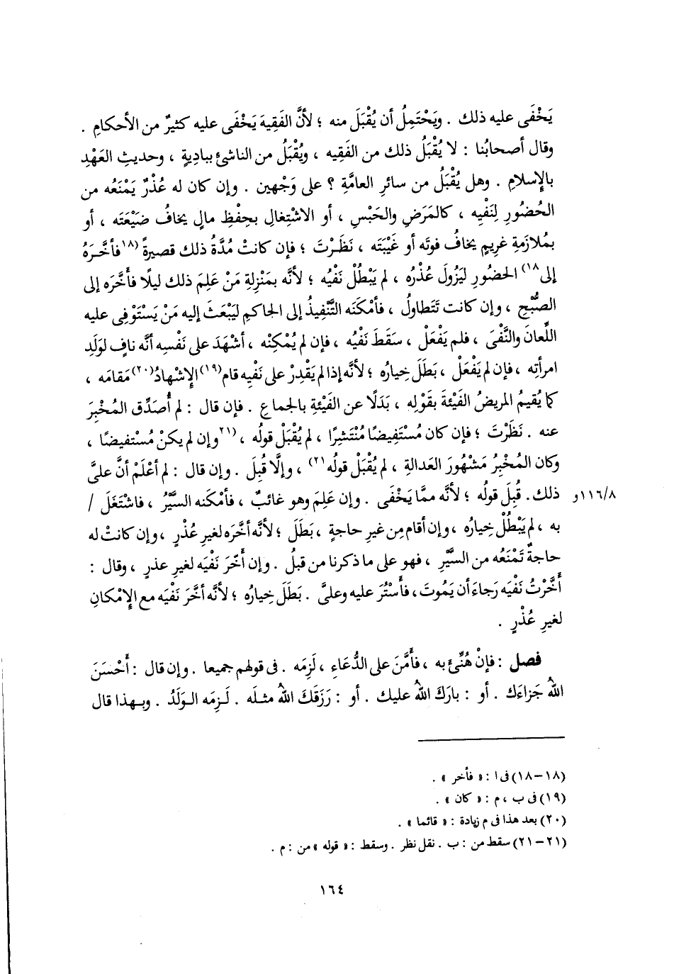 يَخْفَى عليه ذلك. ويَحْتَمِلُ أن يُقْبَلَ منه؛ لأنَّ الفَقِيهَ يَخْفَى عليه كثيرٌ من الأحكامِ. وقال أصحابُنا: لا يُقْبَلُ ذلك من الفَقِيه، ويُقْبَلُ من الناشئ ببادِيةٍ، وحديثِ العَهْدِ بالإِسلامِ. وهل يُقْبَلُ من سائرِ العامَّةِ؟ على وَجْهين. وإن كان له عُذْرٌ يَمْنَعُه من الحُضُورِ لِنَفْيِه، كالمَرَض والحَبْسِ، أو الاشْتِغالِ بحِفْظِ مالٍ يخافُ ضَيْعَتَه، أو بمُلازَمةِ غرِيمٍ يخافُ فوتَه أو غَيْبَتَه، نَظَرْتَ؛ فإن كانتْ مُدَّةُ ذلك قصيرةً [فأخَّرَهُ إلى] (١٨) الحضُورِ ليَزُولَ عُذْرُه، لم يَبْطُلْ نَفْيُه؛ لأنَّه بمَنْزِلةِ مَنْ عَلِمَ ذلك ليلًا فأخَّرَه إلى الصُّبْحِ، وإن كانت تَتَطاولُ، فأمْكَنَه التنفِيذُ إلى الحاكمِ ليَبْعَثَ إليه مَنْ يَسْتَوْفِى عليه اللِّعان والنَّفْىَ، فلم يَفْعَلْ، سَقَطَ نَفْيُه، فإن لم يُمْكِنْه، أشْهَدَ على نَفْسِه أنَّه نافٍ لوَلَدِ امرأتِه، فإن لم يَفْعَلْ، بَطَلَ خِيارُه؛ لأنَّه إذا لم يَقْدِرْ على نَفْيِه قام (١٩) الإِشْهادُ (٢٠) مَقامَه، كما يُقيمُ المريضُ الفَيْئةَ بقَوْلِه، بَدَلًا عن الفَيْئةِ بالجماعِ. فإن قال: لم أُصَدِّق المُخْبِرَ عنه. نَظَرْتَ؛ فإن كان مُسْتَفِيضًا مُنْتَشِرًا، لم يُقْبَلْ قولُه، [وإن لم يكنْ مُستفيضًا، وكان المُخْبِرُ مَشْهُورَ العَدالةِ، لم يُقْبَلْ قولُه] (٢١)، وإلَّا قُبِلَ. وإن قال: لم أعْلَمْ أَنَّ علىَّ ذلك. قُبِلَ قولُه؛ لأنَّه ممَّا يَخْفَى. وإن عَلِمَ وهو غائبٌ، فأمْكَنه السَّيرُ، فاشْتَغَلَ به، لم يَبْطُلْ خِيارُه، وإن أقام مِن غيرِ حاجةٍ، بَطَلَ؛ لأنَّه أخَّرَه لغيرِ عُذْرٍ، وإن كانتْ له حاجةٌ تَمْنَعُه من السَّيْرِ، فهو على ما ذكرنا من قبلُ. وإن أخَّرَ نَفْيَه لغيرِ عذرٍ، وقال: أَخَّرْتُ نَفْيَه رَجاءَ أن يَمُوتَ، فأَسْتُرَ عليه وعلىَّ. بَطَلَ خِيارُه؛ لأنَّه أخَّرَ نَفْيَه مع الإِمْكانِ لغيرِ عُذْرٍ.