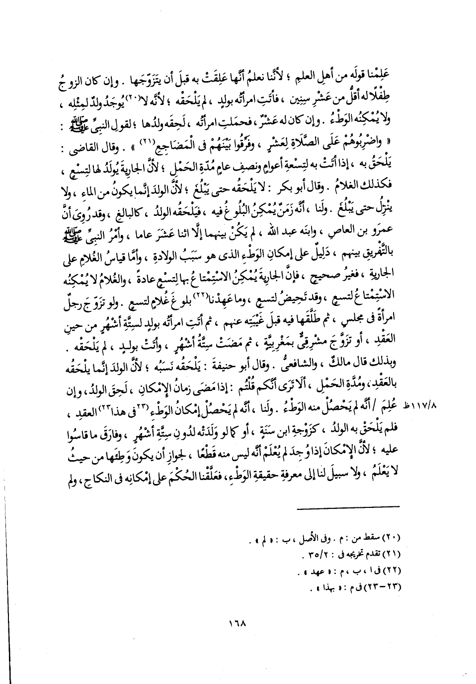 عَلِمْنا قولَه من أهلِ العلمِ؛ لأنَّنا نعلمُ أنَّها عَلِقَتْ به قبلَ أن يتَزَوّجَها. وإن كان الزوجُ طِفْلًا له أقلُّ من عَشْرِ سِنِين، فأتَتِ امرأتُه بولدٍ، لم يَلْحَقْه؛ لأنَّه لا (٢٠) يُوجَدُ ولدٌ لمِثْلِه، ولا يُمْكِنُه الوَطْءُ. وإن كان له عَشْرٌ، فحمَلتِ امرأتُه، لَحِقَه ولدُها؛ لقولِ النبِىِّ -صلى اللَّه عليه وسلم-: "واضْرِبُوهُمْ عَلَى الصَّلَاةِ لِعَشْرٍ، وفرقُوا بَيْنَهُمْ فى الْمَضَاجِعِ (٢١) ". وقال القاضى: يَلْحَقُ به، إذا أتَتْ به لتِسْعةِ أعوامٍ ونصفِ عامٍ مُدّةِ الحَمْلِ؛ لأنَّ الجارِيةَ يُولَدُ لها لتِسْعٍ، فكذلك الغلامُ. وقال أبو بكر: لا يَلْحَقُه حتى يَبْلُغ؛ لأنَّ الولدَ إنَّما يكونُ من الماءِ، ولا ينْزِلُ حتى يَبْلُغَ. ولَنا، أنَّه زَمَنٌ يُمْكِنُ البُلُوغُ فيه، فيَلْحَقُه الولدُ، كالبالغِ، وقد رُوِىَ أَنَّ عمرَو بن العاص، وابنَه عبد اللَّه، لم يَكُنْ بينهما إلَّا اثنا عَشَرَ عاما، وأمْرُ النبِىِّ -صلى اللَّه عليه وسلم- بالتَّفْريقِ بينهم، دَلِيلٌ على إمكانِ الوَطْءِ الذى هو سَبَبُ الولادةِ، وأمَّا قياسُ الغُلامِ على الجاريةِ، فغيرُ صحيحٍ، فإنَّ الجارِيةَ يُمْكِنُ الاسْتِمْتاعُ بها لِتسْع عادةً، والغُلامُ لا يُمْكِنُه الاسْتِمْتاعُ لتسعٍ، وقد تَحِيضُ لتسعٍ، وما عَهِدْنا (٢٢) بلوغَ غُلامٍ لتسعٍ. ولو تزَوَّجَ رجلٌ امرأةً فى مجلسٍ، ثم طَلَّقَها فيه قبلَ غيْبَتِه عنهم، ثم أتَتِ امرأتُه بولدٍ لسِتَّةِ أشْهُرٍ من حينِ العَقْدِ، أو تزَوَّجَ مشْرِقىٌّ بمَغْرِبِيَّة، ثم مَضَتْ سِتَّةُ أشْهُرٍ، وأتَتْ بولدٍ، لم يَلْحَقْه. وبذلك قال مالكٌ، والشافعىُّ. وقال أبو حنيفةَ: يَلْحَقُه نَسَبُه؛ لأنَّ الولدَ إنَّما يلْحَقُه بالعَقْدِ، ومُدَّةِ الحَمْلِ، ألَا تَرَى أنَّكم قُلْتُم: إذا مَضَى زمانُ الإِمْكانِ، لَحِقَ الولدُ، وإن عُلِمَ أنَّه لم يَحْصُلْ منه الوَطْءُ. ولَنا، أنَّه لم يَحْصُلْ إمْكانُ الوَطْءِ [فى هذا] (٢٣) العقدِ، فلم يَلْحَقْ به الولدُ، كزَوْجةِ ابن سَنَةٍ، أو كما لو وَلَدَتْه لدُونِ سِتَّةِ أشْهُرٍ، وفارَقَ ما قاسُوا عليه؛ لأنَّ الإِمْكانَ إذا وُجِدَ لم يُعْلَمْ أنَّه ليس منه قَطْعًا، لجوازِ أن يكونَ وَطِئَها من حيثُ لا يَعْلَمُ، ولا سبيلَ لنا إلى معرفةِ حقيقةِ الوَطْءِ، فعَلَّقْنا الحُكْمَ على إمْكانِه فى النِّكاحِ، ولم