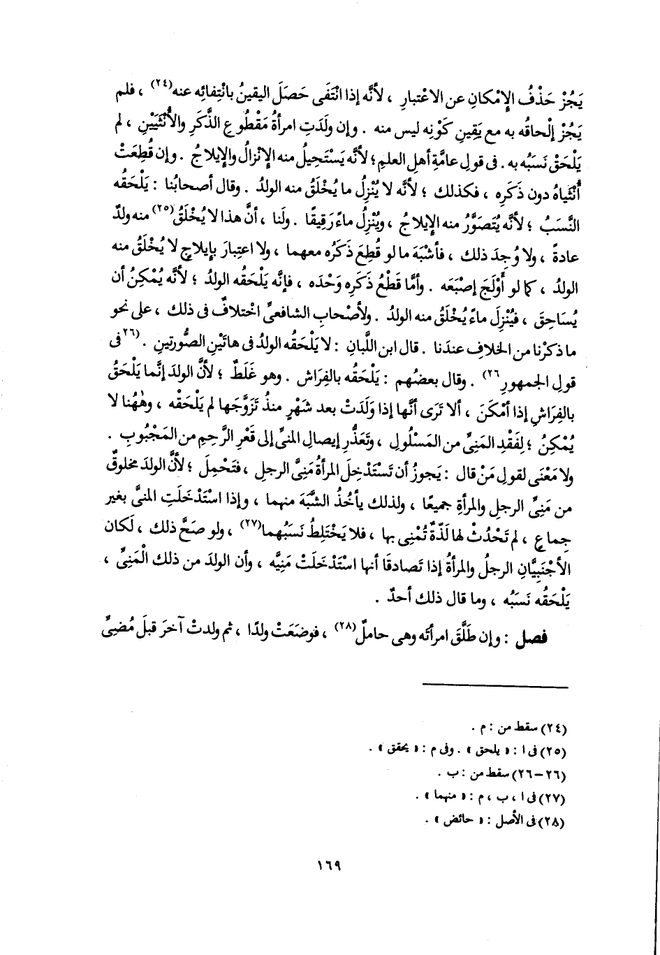 يَجُزْ حَذْفُ الإِمْكانِ عن الاعْتبارِ؛ لأنَّه إذا انْتَفَى حَصَلَ اليقينُ بانْتِفائِه عنه (٢٤)، فلم يَجُزْ إلْحاقُه به مع يَقينِ كَوْنِه ليس منه. وإن ولَدَتِ امرأةُ مَقْطُوعِ الذَّكَرِ والأُنْثَيَيْنِ، لم يَلْحَق نَسَبُه به. فى قولِ عامَّةِ أهلِ العلمِ؛ لأنَّه يَسْتَحِيلُ منه الإِنْزالُ والإِيلاجُ. وإن قُطِعَتْ أُنْثَياهُ دون ذَكَرِه، فكذلك؛ لأنَّه لا يُنْزِلُ ما يُخْلَقُ منه الولدُ. وقال أصحابُنا: يَلْحَقُه النَّسَبُ؛ لأنَّه يُتَصَوَّرُ منه الإِيلاجُ، ويُنْزِلُ ماءً رَقِيقًا. ولَنا، أَنَّ هذا لا يُخْلَقْ (٢٥) منه ولدٌ عادةً، ولا وُجدَ ذلك، فأشْبَهَ ما لو قُطِعَ ذَكَرُه معهما، ولا اعتِبارَ بإِيلاجٍ لا يُخْلَقُ منه الولدُ، كما لو أَوْلَجَ إصْبَعَه. وأمَّا قَطْعُ ذَكَرِه وَحْدَه، فإنَّه يَلْحَقُه الولدُ؛ لأنَّه يُمْكِنُ أن يُسَاحِقَ، فيُنْزِلَ ماءً يُخْلَقُ منه الولدُ. ولأصْحابِ الشافعىِّ اخْتلافٌ فى ذلك، على نحو ما ذكرْنا من الخلافِ عندَنا. قال ابن اللَّبانِ: لا يَلْحَقُه الولدُ فى هاتَيْنِ الصُّورتينِ. [فى قولِ الجمهورِ] (٢٦). وقال بعضُهم: يَلْحَقُه بالفِرَاش. وهو غَلَطٌ؛ لأنَّ الولدَ إنَّما يَلْحَقُ بالفِرَاش إذا أمْكَنَ، ألا تَرَى أنَّها إذا وَلَدَتْ بعد شَهْرٍ منذُ تَزَوَّجَها لم يَلْحَقْه، وههُنا لا يُمْكِنُ؛ لِفَقدِ المَنِىِّ من المَسْلُولِ، وَتَعَذُّرِ إيصالِ المنىِّ إلى قَعْرِ الرَّحِمِ من المَجْبُوبِ. ولا مَعْنَى لقولِ مَنْ قال: يَجوزُ أن تَسْتَدْخِلَ المرأةُ مَنِىَّ الرجلِ، فتَحْمِلَ؛ لأنَّ الولدَ مخلوقٌ من مَنِىِّ الرجلِ والمرأةِ جميعًا، ولذلك يأخُذُ الشَّبَهَ منهما، وإذا اسْتَدْخَلَتِ المنىَّ بغير جِماعٍ، لم تَحْدُثْ لها لَذّةٌ تُمْنِى بها، فلا يَخْتَلِطُ نَسَبُهما (٢٧)، ولو صَحَّ ذلك، لَكان الأجْنَبِيَّانِ الرجلُ والمرأةُ إذا تَصادقَا أنها اسْتَدْخَلَتْ مَنِيَّه، وأن الولدَ من ذلك الْمَنِىِّ، يَلْحَقُه نَسَبُه، وما قال ذلك أحدٌ.