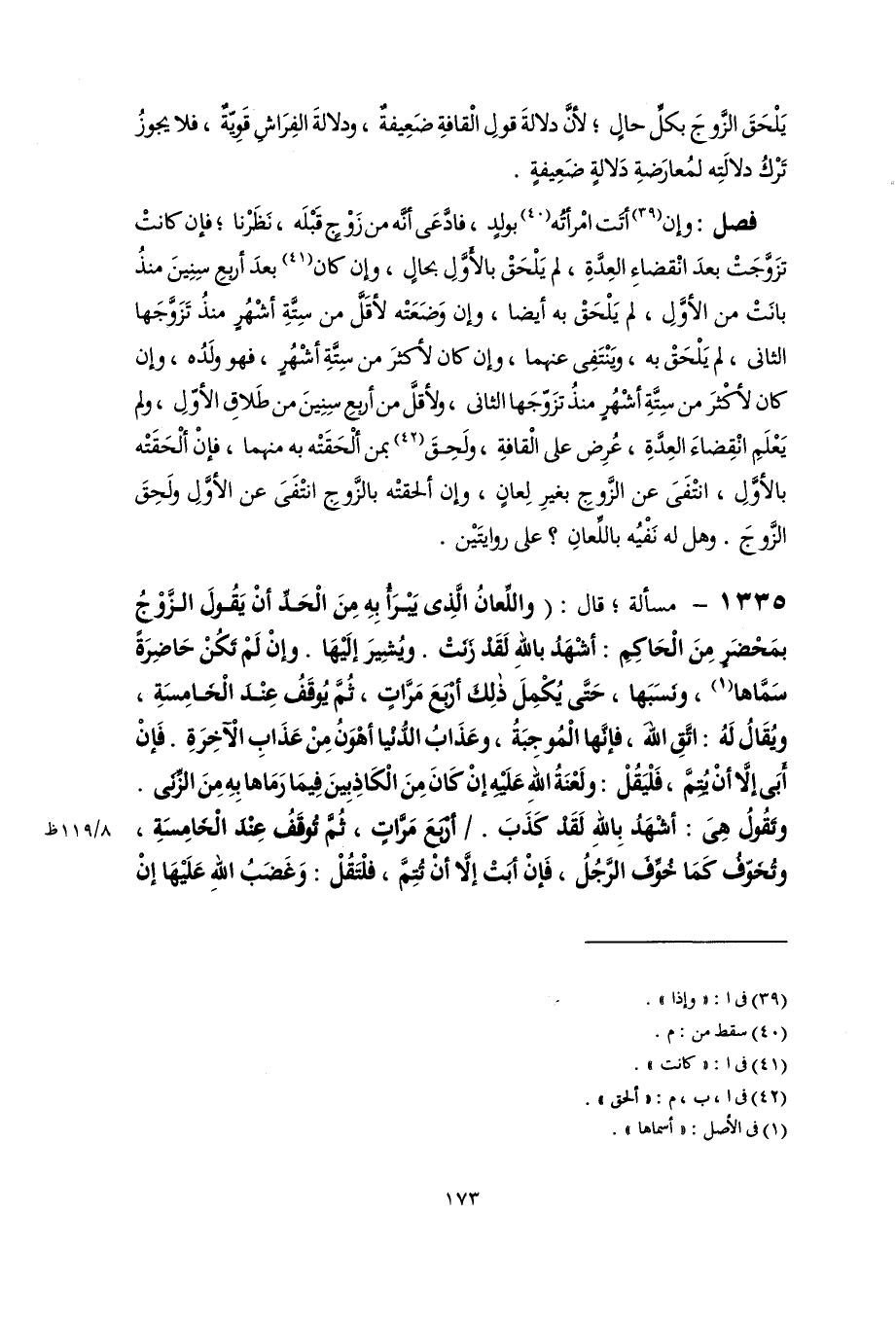 فصل: وإن (٣٩) أتت امْرأتُه (٤٠) بولدٍ، فادَّعَى أنَّه من زَوْجٍ قَبْلَه، نَظَرْنا؛ فإن كانتْ تزَوَّجَتْ بعدَ انْقضاءِ العِدَّةِ، لم يَلْحَقْ بالأوَّلِ بحالٍ، وإن كان (٤١) بعدَ أربعِ سِنِينَ منذُ بانَتْ من الأوَّلِ، لم يَلْحَقْ به أيضًا، وإن وَضَعَتْه لأقَلَّ من سِتَّةِ أشْهُرٍ منذُ تَزَوَّجَها الثانى، لم يَلْحَقْ به، ويَنْتَفِى عنهما، وإن كان لأكثرَ من سِتَّةِ أشْهُرٍ، فهو ولَدُه، وإن كان لأكْثرَ من سِتَّةِ أشْهُرٍ منذُ تزَوّجَها الثانى، ولأقلَّ من أربعِ سِنِينَ من طَلاقِ الأوَّلِ، ولم يَعْلَمِ انْقِضاءَ العِدَّةِ، عُرِض على الْقافةِ، ولَحِقَ (٤٢) بمن ألْحَقَتْه به منهما، فإنْ ألْحَقَتْه بالأوَّلِ، انتْفَىَ عن الزَّوجِ بغيرِ لِعانٍ، وإن ألحقتْه بالزَّوجِ انتْفَىَ عن الأوَّلِ ولَحِقَ الزَّوجَ. وهل له نَفْيُه باللِّعانِ؟ على روايتَيْن.
