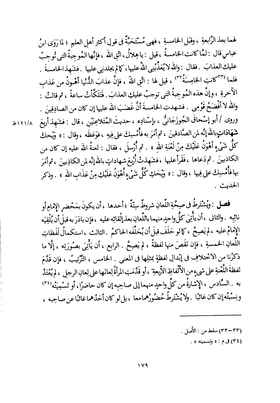 فصل: ويُشْتَرطُ فى صِحَّةِ اللِّعانِ شروطٌ سِتّةٌ؛ أحدها، أن يكونَ بمَحْضرِ الإِمامِ أو نائِبِه. والثانى، أن يأْتِىَ كلُّ واحدٍ منهما بللِّعانِ بعدَ إلْقائِه عليه، فإن بادَرَ به قبلَ أن يُلْقِيَه الإِمامُ عليه، لم يَصِحَّ، كما لو حَلَفَ قبلَ أن يُحَلِّفَه الحاكمُ. الثالث، استكمالُ لَفَظاتِ اللِّعانِ الخمسةِ، فإن نَقَصَ منها لفظةً، لم يَصِحَّ. الرابع، أن يَأْتِىَ بصُورَتِه، إلَّا ما ذكرْنا من الاخْتلافِ فى إبْدالِ لفظةٍ بمثلِها فى المعنى. الخامس، التَّرْتيبُ، فإن قَدَّمَ لفظةَ اللَّعْنةِ على شىءٍ من الألْفاظِ الأربعةِ، أو قَدَّمَتِ المرأةُ لِعانَها على لِعانِ الرجلِ، لم يُعْتَدَّ به. السَّادس، الإِشارةُ من كلِّ واحدٍ منهما إلى صاحِبِه إن كان حاضرًا، أو تَسْمِيَتُه (٣٤) ونِسْبتُه إن كان غائبًا. ولا يُشْتَرطُ حُضُورُهما معا، بل لو كان أحَدُهما غائبًا عن صاحِبه،