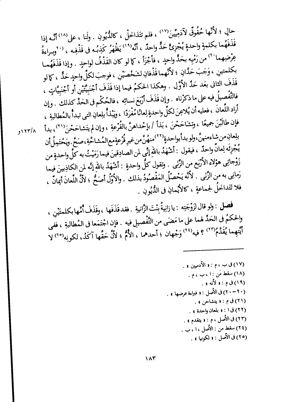 حالٍ؛ لأنَّها حُقُوقٌ لآدَمِيِّينَ (١٧)، فلم تتَدَاخَلْ، كالدُّيُونِ. ولَنا، على (١٨) أنَّه إذا قَذَفَهُما بكلمةٍ واحدةٍ يُجْزِئُ حَدٌّ واحدٌ، أنَّه (١٩) يَظْهَرُ كَذِبُه فى قَذْفِه، [وبراءةُ عِرْضِهما] (٢٠) من رَمْيِه بحَدٍّ واحدٍ، فأجْزَأ، كما لو كان القَذْفُ لواحدٍ. وإذا قَذَفَهُما بكلمتينِ، وَجَبَ حَدَّانِ؛ لأنَّهما قَذْفانِ لشَخْصَيْنِ، فوجبَ لكلِّ واحدٍ حَدٌّ، كما لو قَذَفَ الثانى بعَد حَدِّ الأوَّلِ. وهكذا الحكمُ فيما إذا قَذَفَ أجْنَبِيَّتَيْنِ أو أجْنَبِيَّاتٍ، فالتَّفْصيلُ فيه على ما ذكرْناه. وإن قَذَفَ أرْبَعَ نسائِه، فالحُكْم فى الحَدِّ كذلك. وإن أراد اللِّعانَ، فعليه أن يُلاعِنَ لكلِّ واحدةٍ لِعانًا مُفْرَدًا، ويَبْدَأُ بلِعانِ التى تبدأُ بالمُطالبةِ، فإن طالَبْنَ جميعًا، وتشَاحَحْنَ، بَدَأ بإحْداهنَّ بالقُرْعةِ، وإن لم يتَشاحَحْنَ (٢١)، بدأ بلِعانِ من شاء منهنَّ، ولو بدأ بواحدةٍ (٢٢) منهُنَّ من غيرِ قُرْعةٍ مع المُشاحَّةِ، صَحَّ. ويَحْتَمِلُ أن يُجْزِئَه لِعانٌ واحدٌ، فيقول: أشْهَدُ باللَّهِ إنِّى لمن الصادِقينَ فيما رَمَيْتُ به كلَّ واحدةٍ من زَوْجاتِى هؤلاء الأرْبَع من الزِّنَى. وتقول كلُّ واحدةٍ: أشْهَدُ باللَّهِ إنَّه لمن الكاذِبينَ فيما رَمانِى به من الزِّنَى. لأنَّه يَحْصُلُ المَقْصُودُ بذلك. والأوّلُ أصَحُّ؛ لأنَّ اللِّعانَ أيمانٌ، فلا تَتَداخَلُ لجماعةٍ، كالأيْمانِ فى الدُّيُونِ.