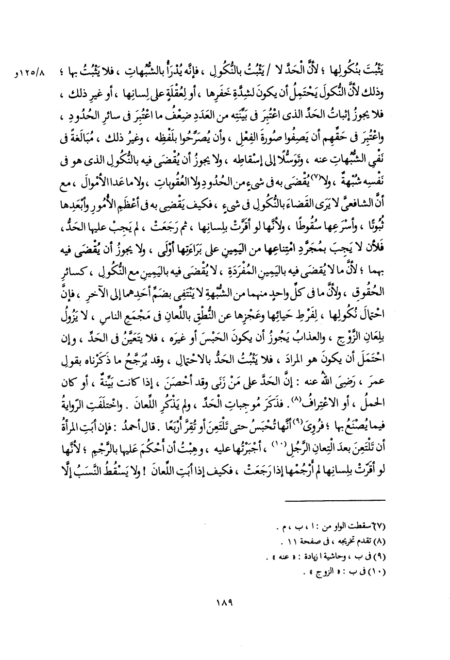 يَثْبُتَ بنُكُولِها؛ لأنَّ الْحَدَّ لا يَثْبُتُ بالنُّكُولِ، فإنَّه يُدْرَأُ بالشُّبُهاتِ، فلا يَثْبُتُ بها؛ وذلك لأنَّ النُّكولَ يَحْتَمِلُ أن يكونَ لشِدَّةِ خَفَرِها، أو لِعُقْلَةٍ على لِسانِها، أو غيرِ ذلك، فلا يجوزُ إثباتُ الحَدِّ الذى اعْتُبِرَ فى بَيِّنَتِه من العَدَدِ ضِعْفُ ما اعْتُبِرَ فى سائرِ الحُدُودِ، واعْتُبِرَ فى حَقِّهِم أن يَصِفُوا صُورةَ الفِعْلِ، وأن يُصَرِّحُوا بلَفْظِه، وغيرُ ذلك، مُبَالَغةً فى نَفْىِ الشُّبُهاتِ عنه، وتَوَسُّلًا إلى إسْقاطِه، ولا يجوزُ أن يُقْضَى فيه بالنُّكُولِ الذى هو فى نَفْسِه شُبْهةٌ، ولا (٧) يُقْضَى به فى شىءٍ من الحُدُودِ ولا العُقُوباتِ، ولا ما عَدا الأمْوالَ، مع أَنَّ الشافعىَّ لا يَرَى القَضاءَ بالنُّكُولِ فى شىءٍ، فكيف يَقْضِى به فى أعْظَمِ الأُمُورِ وأبْعَدِها ثُبُوتًا، وأسْرَعِها سُقوطًا، ولأنَّها لو أقَرَّتْ بلِسانِها، ثم رَجَعَتْ، لم يَجِبْ عليها الحَدُّ، فَلأن لا يَجِبَ بمُجَرَّدِ امْتِناعِها من اليَمِينِ على بَرَاءَتِها أوْلَى، ولا يجوزُ أن يُقْضَى فيه بهما؛ لأنَّ ما لا يُقضَى فيه باليَمِينِ المُفْرَدَةِ، لا يُقْضَى فيه باليَمِينِ مع النُّكُولِ، كسائرِ الحُقُوقِ، ولأنَّ ما فى كلِّ واحدٍ منهما من الشُّبْهةِ لا يَنْتَفِى بضَمِّ أحَدِهما إلى الآخرِ، فإنَّ احْتمالَ نُكُولِها، لِفَرْطِ حَيائِها وعَجْزِها عن النُّطْقِ باللِّعانِ فى مَجْمَعِ الناسِ، لا يَزُولُ بلِعَانِ الزَّوْجِ، والعذابُ يَجُوزُ أن يكونَ الحَبْسَ أو غيرَه، فلا يتَعَيَّنُ فى الحَدِّ، وإن احْتَمَلَ أن يكونَ هو المرادَ، فلا يَثْبُتُ الحَدُّ بالاحْتمالِ، وقد يُرَجَّحُ ما ذَكَرْناه بقولِ عمرَ، رَضِىَ اللَّهُ عنه: إنَّ الحَدَّ على مَنْ زَنَى وقد أحْصَنَ، إذا كانت بَيِّنةٌ، أو كان الحملُ، أو الاعْتِرافُ (٨). فذَكَرَ مُوجِباتِ الْحَدِّ، ولم يَذْكُرِ اللِّعانَ. واخْتلَفَتِ الرّوايةُ فيما يُصْنَعُ بها؛ فرُوِىَ (٩) أنَّها تُحْبَسُ حتى تَلْتَعِنَ أو تُقِرَّ أَرْبَعًا. قال أحمدُ: فإن أبَتِ المرأةُ أن تلْتَعِنَ بعدَ الْتِعانِ الرَّجُلِ (١٠)، أجْبَرْتُها عليه، وهِبْتُ أن أَحْكُمَ عَليها بالرَّجْمِ؛ لأنَّها لو أقَرّتْ بلِسانِها لم أَرْجُمْها إِذا رَجَعَتْ، فكيف إذا أبَتِ اللِّعانَ! ولا يَسْقُطُ النَّسَبُ إلَّا