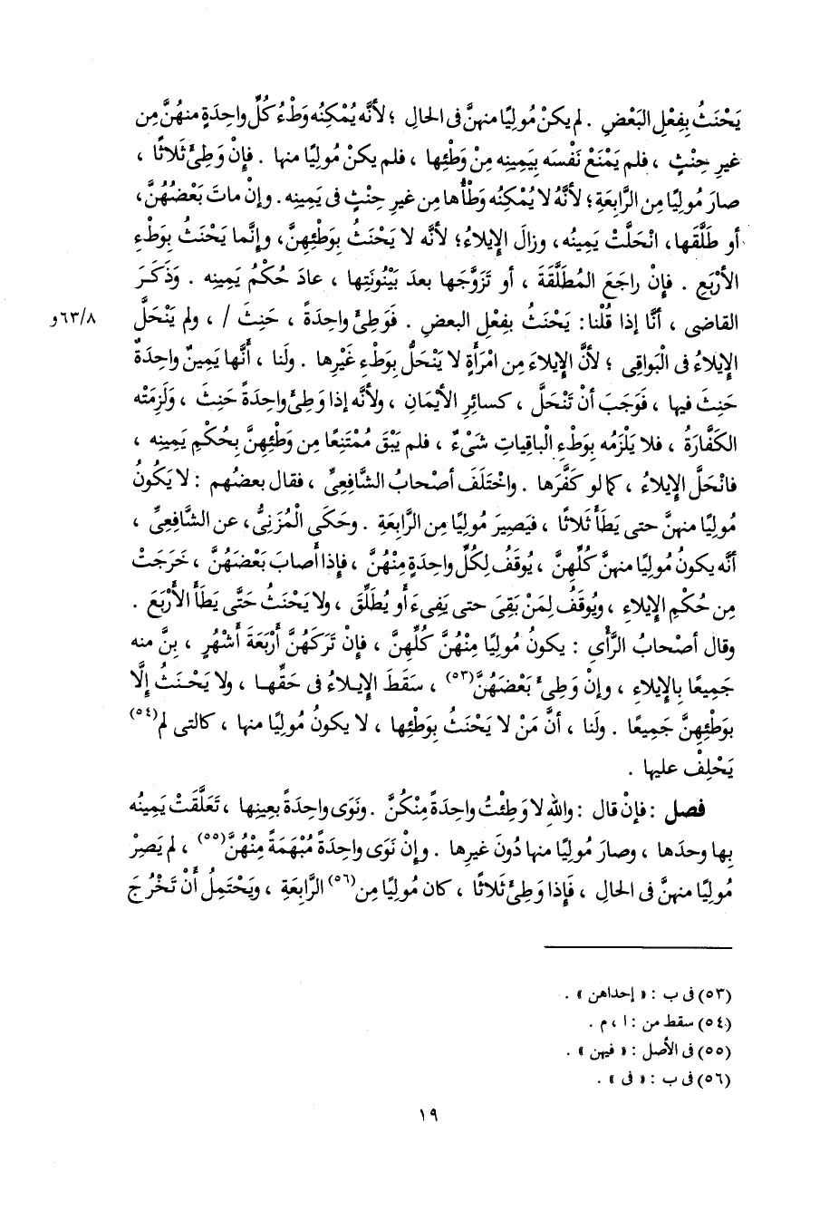 يَحْنَثُ بِفِعْلِ البَعْضِ. لم يكنْ مُولِيًا منهنَّ فى الحالِ؛ لأنَّه يُمْكِنُه وَطْءُ كُلِّ واحِدَةٍ منهُنَّ مِن غيرِ حِنْثٍ، فلم يَمْنَعْ نَفْسَه بِيَمِينِه مِنْ وَطْئِها، فلم يكنْ مُولِيًا منها. فإِنْ وَطِئَ ثَلاثًا، صارَ مُولِيًا مِن الرَّابِعَةِ؛ لأنَّهُ لا يُمْكِنُه وَطْأُها مِن غيرِ حِنْثٍ فى يَمِينِه. وإِنْ ماتَ بَعْضُهُنَّ، أو طَلَّقَها، انْحَلَّتْ يَمِينُه، وزالَ الإِيلاءُ؛ لأنَّه لا يَحْنَثُ بِوَطْئِهِنَّ، وإِنَّما يَحْنَثُ بِوَطْءِ الأَرْبَعِ. فإِنْ راجَعَ المُطَلَّقَةَ، أو تَزَوَّجَها بعدَ بَيْنُونَتِها، عادَ حُكْمُ يَمِينِه. وَذَكَرَ القاضى، أنَّا إذا قُلْنا: يَحْنَثُ بفِعْلِ البعضِ. فَوَطِئَ واحِدَةً، حَنِثَ، ولم يَنْحَلَّ الإِيلاءُ فى الْبَواقِى؛ لأنَّ الإِيلاءَ مِن امْرأَةٍ لا يَنْحَلُّ بِوَطْءِ غَيْرِها. ولَنا، أَنَّها يَمِينٌ واحِدَةٌ حَنِثَ فيها، فَوَجَبَ أَنْ تَنْحَلَّ، كسائِرِ الأيْمَانِ، ولأنَّه إذا وَطِئَ واحِدَةً حَنِثَ، وَلَزِمَتْه الكَفَّارَةُ، فلا يَلْزَمُه بِوَطْءِ الْباقِياتِ شَىْءٌ، فلم يَبْقَ مُمْتَنِعًا مِن وَطْئِهِنَّ بِحُكْمِ يَمِينِه، فانْحَلَّ الإِيلاءُ، كما لو كَفَّرَها. واخْتَلَفَ أصْحابُ الشَّافِعِىِّ، فقال بعضُهم: لا يَكُونُ مُولِيًا منهنَّ حتى يَطَأَ ثَلاثًا، فيَصِيرَ مُولِيًا مِن الرَّابِعَةِ. وحَكَى الْمُزَنِىُّ، عن الشَّافِعِىِّ، أنَّه يكونُ مُولِيًا منهنَّ كُلِّهِنَّ، يُوقَفُ لِكُلِّ واحِدَةٍ مِنْهُنَّ، فإِذا أَصابَ بَعْضَهُنَّ، خَرَجَتْ مِن حُكْمِ الإِيلاءِ، ويُوقَفُ لِمَنْ بَقِىَ حتى يَفِىءَ أَو يُطَلِّقَ، ولا يَحْنَثُ حَتَّى يَطَأَ الأَرْبَعَ. وقال أصْحابُ الرَّأْىِ: يكونُ مُولِيًا مِنْهُنَّ كُلِّهِنَّ، فإِنْ تَرَكَهُنَّ أَرْبَعَةَ أَشْهُرٍ، بِنَّ منه جَمِيعًا بِالإِيلاءِ، وإِنْ وَطِئَ بَعْضَهُنَّ (٥٣)، سَقَطَ الإِيلاءُ فى حَقِّها، ولا يَحْنَثُ إِلَّا بوَطْئِهِنَّ جَمِيعًا. ولَنا، أَنَّ مَنْ لا يَحْنَثُ بِوَطْئِها، لا يكونُ مُولِيًا منها، كالتى لم (٥٤) يَحْلِفْ عليها.