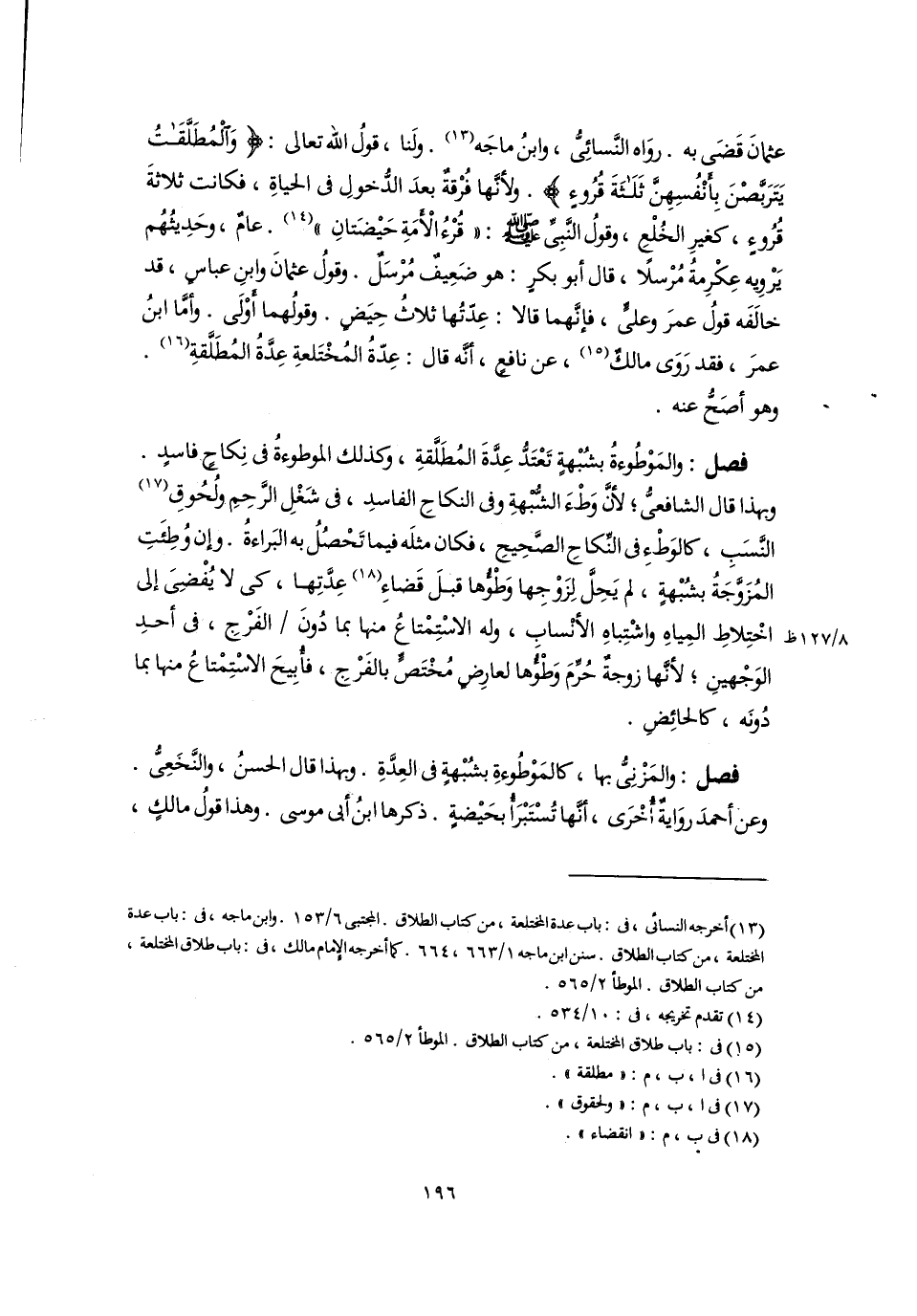 فصل: والمَوْطُوءةُ بشُبْهةٍ تَعْتَدُّ عِدَّةَ المُطَلَّقةِ، وكذلك الموطوءةُ فى نِكاحٍ فاسدٍ. وبهذا قال الشافعىُّ؛ لأنَّ وَطْءَ الشُّبْهةِ وفى النِّكاحِ الفاسدِ، فى شَغْلِ الرَّحِمِ ولُحُوقِ (١٧) النَّسَبِ، كالوَطْءِ فى النِّكاحِ الصَّحِيحِ، فكان مثلَه فيما تَحْصُلُ به البَراءةُ. وإن وُطِئَتِ المُزَوَّجَةُ بشُبْهةٍ، لم يَحِلَّ لِزَوْجِها وَطْؤُها قبلَ قَضاءِ (١٨) عِدَّتِها، كى لا يُفْضِىَ إلى اخْتِلاطِ المِياهِ واشْتِباهِ الأنْساب، وله الاسْتِمْتاعُ منها بما دُونَ الفَرْجِ، فى أحدِ الوَجْهينِ؛ لأنَّها زوجةٌ حُرِّمَ وَطْؤُها لعارِضٍ مُخْتَصٍّ بالفَرْجِ، فأُبِيحَ الاسْتِمْتاعُ منها بما دُونَه، كالحائِضِ.