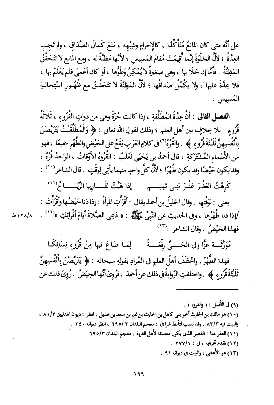 الفصل الثانى: أَنَّ عِدَّةَ المُطَلَّقةِ، إذا كانت حُرّةً وهى من ذواتِ القُرُوءِ، ثَلَاثَةُ قُرُوءٍ. بلا خِلافٍ بين أهل العلمِ؛ وذلك لقولِ اللَّه تعالى: {وَالْمُطَلَّقَاتُ يَتَرَبَّصْنَ بِأَنْفُسِهِنَّ ثَلَاثَةَ قُرُوءٍ}. والقُرْءُ (٩) فى كلامِ العَرَبِ يَقَعُ على الحَيْضِ والطُّهْرِ جميعًا، فهو من الأسْماءِ المُشْتَرَكةِ، قال أحمدُ بن يَحْيَى ثَعْلَبٌ: القُرُوءُ الأوْقاتُ، الواحدُ قُرْءٌ، وقد يكون حَيْضًا وقد يكون طُهْرًا؛ لأنَّ كلَّ واحدٍ منهما يأتِى لِوَقْتٍ. قال الشاعر (١٠):