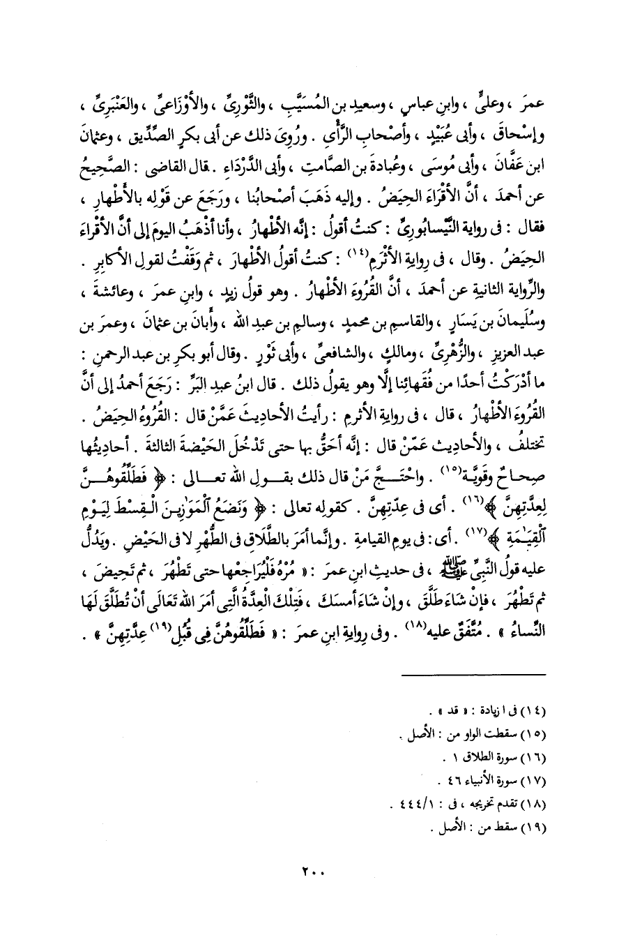 عمرَ، وعلىٍّ، وابنِ عباسٍ، وسعيد بن المُسَيَّبِ، والثَّوْرِىِّ، والأوْزَاعىِّ، والعَنْبَرِىِّ، وإسْحاقَ، وأبى عُبَيْدٍ، وأصْحابِ الرَّأْىِ. ورُوِىَ ذلك عن أبى بكرٍ الصِّدِّيق، وعثمانَ ابن عَفَّانَ، وأبى مُوسَى، وعُبادةَ بن الصَّامتِ، وأبى الدَّرْدَاءِ. قال القاضى: الصَّحِيحُ عن أحمدَ، أَنَّ الأقْرَاءَ الحِيَضُ. وإليه ذَهَبَ أصْحابُنا، ورَجَعَ عن قَوْلِه بالأَطْهارِ، فقال: فى رواية النَّيْسابُورِىِّ: كنتُ أقولُ: إنَّه الأطْهارُ، وأنا أذْهَبُ اليومَ إلى أَنَّ الأقْراءَ الحِيَضُ. وقال، فى رِوايةِ الأثْرَمِ (١٤): كنتُ أقولُ الأطْهارَ، ثم وَقَفْتُ لقولِ الأكابِرِ. والرِّواية الثانيةِ عن أحمدَ، أَنَّ القُرُوءَ الأطْهارُ. وهو قولُ زيدٍ، وابنِ عمرَ، وعائشةَ، وسُلَيمانَ بن يَسَارٍ، والقاسمِ بن محمدٍ، وسالمِ بن عبدِ اللَّه، وأَبانَ بن عثمانَ، وعمرَ بن عبد العزيزِ، والزُّهْرِىِّ، ومالكٍ، والشافعىِّ، وأبى ثَوْرٍ. وقال أبو بكرِ بن عبد الرحمنِ: ما أدْرَكْتُ أحدًا من فُقَهائِنا إلَّا وهو يقولُ ذلك. قال ابنُ عبدِ البَرِّ: رَجَعَ أحمدُ إلى أَنَّ القُرُوءَ الأطْهارُ، قال، فى روايةِ الأثرمِ: رأيتُ الأحادِيثَ عَمَّنْ قال: القُرُوءُ الحِيَضُ. تختلفُ، والأحادِيث عَمّنْ قال: إنَّه أحَقُّ بها حتى تَدْخُلَ الحَيْضةَ الثالثةَ. أحادِيثُها صِحاحٌ وقَويَّة (١٥). واحْتَجَّ مَنْ قال ذلك بقولِ اللَّه تعالى: {فَطَلِّقُوهُنَّ لِعِدَّتِهِنَّ} (١٦). أى فى عِدّتِهِنَّ. كقولِه تعالى: {وَنَضَعُ الْمَوَازِينَ الْقِسْطَ لِيَوْمِ الْقِيَامَةِ} (١٧). أى: فى يومِ القيامةِ. وإنَّما أمَرَ بالطَّلَاقِ فى الطُّهْرِ لا فى الحَيْضِ. ويَدُلُّ عليه قولُ النَّبِىِّ -صلى اللَّه عليه وسلم-، فى حديثِ ابنِ عمرَ: "مُرْهُ فَلْيُرَاجِعْها حتى تَطْهُرَ، ثم تَحِيضَ، ثم تَطْهُرَ، فإنْ شَاءَ طَلَّقَ، وإِنْ شَاءَ أمسَكَ، فَتِلْكَ الْعِدَّةُ الَّتِى أمَرَ اللَّه تَعَالَى أَنْ تُطَلَّقَ لَهَا النِّساءُ". مُتَّفَقٌ عليه (١٨). وفى رِوايةِ ابنِ عمرَ: "فَطَلِّقُوهُنَّ فِى قُبُلِ (١٩) عِدَّتِهِنَّ".