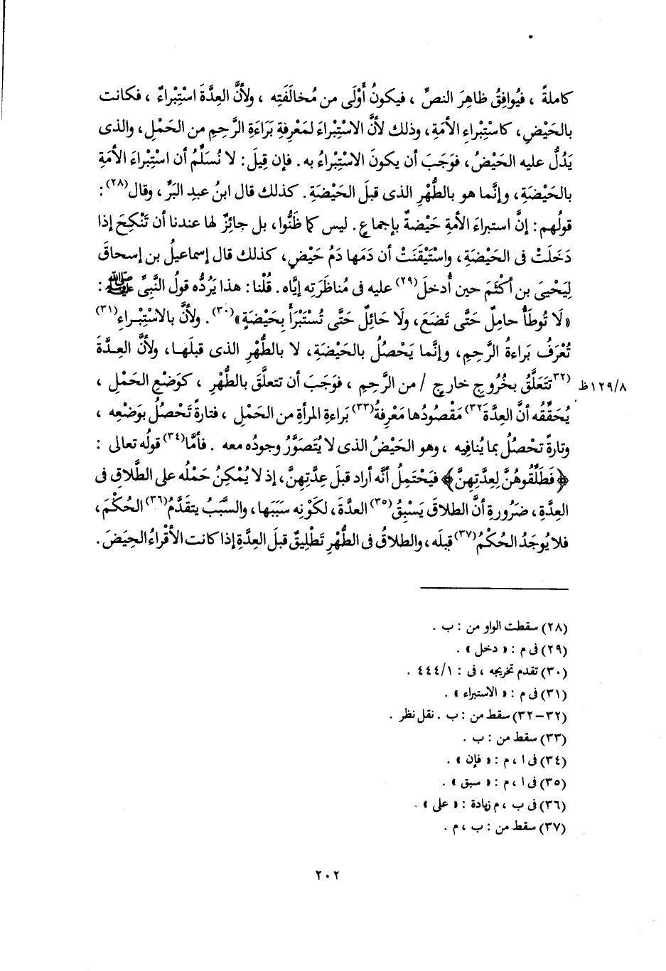 كاملةً، فيُوافِقُ ظاهِرَ النصِّ، فيكونُ أَوْلَى من مُخالَفَتِه، ولأنَّ العِدَّةَ اسْتِبْراءٌ، فكانت بالحَيْضِ، كاسْتِبْراءِ الأَمَةِ، وذلك لأنَّ الاسْتِبْراءَ لمَعْرِفةِ بَرَاءَةِ الرَّحِمِ من الحَمْلِ، والذى يَدُلُّ عليه الحَيْضُ، فوَجَبَ أن يكونَ الاسْتِبْراءُ به. فإن قِيلَ: لا نُسَلِّمُ أن اسْتِبْراءَ الأَمَةِ بالحَيْضَةِ، وإنَّما هو بالطُّهْرِ الذى قبلَ الحَيْضَةِ. كذلك قال ابنُ عبدِ البَرِّ، وقال (٢٨): قولُهم: إنَّ استبراءَ الأمةِ حَيْضةٌ بإجماعٍ. ليس كما ظَنُّوا، بل جائِزٌ لها عندنا أن تَنْكِحَ إذا دَخَلَتْ فى الحَيْضَةِ، واسْتَيْقَنَتْ أن دَمَها دَمُ حَيْضٍ، كذلك قال إسماعيلُ بن إسحاقَ لِيَحْيىَ بن أكْثَمَ حين أُدخل (٢٩) عليه فى مُناظَرَتِه إيَّاه. قُلْنا: هذا يَرُدُّه قولُ النَّبِىِّ -صلى اللَّه عليه وسلم-: "لَا تُوطَأُ حامِلٌ حَتَّى تَضَعَ، ولَا حَائِلٌ حَتَّى تُسْتَبْرَأَ بِحَيْضَةٍ" (٣٠). ولأنَّ بالاسْتِبْراءِ (٣١) تُعْرَفُ بَراءةُ الرَّحِمِ، وإنَّما يَحْصُلُ بالحَيْضَةِ، لا بالطُّهْرِ الذى قبلَها، ولأنَّ العِدَّةَ [تتَعَلَّقُ بخُرُوجِ خارج من الرَّحِمِ، فوَجَبَ أن تتعلَّقَ بالطُّهْرِ، كوَضْعِ الحَمْلِ، يُحَقِّقُه أَنَّ العِدَّةَ] (٣٢) مَقْصُودُها مَعْرِفةُ (٣٣) بَراءةِ المرأةِ من الحَمْلِ، فتارةً تَحْصُلُ بوَضْعِه، وتارةً تحْصُلُ بما يُنافِيه، وهو الحَيْضُ الذى لا يُتَصَوَّرُ وجودُه معه. فأمَّا (٣٤) قولُه تعالى: {فَطَلِّقُوهُنَّ لِعِدَّتِهِنَّ} فيَحْتَمِلُ أنَّه أراد قبلَ عِدَّتِهِنَّ، إذ لا يُمْكِنُ حَمْلُه على الطَّلاقِ فى العِدَّةِ، ضَرُورةِ أَنَّ الطَّلاقَ يَسْبِقُ (٣٥) العدَّةَ، لكَوْنِه سَبَبَها، والسبَّبَ يتقَدَّمُ (٣٦) الحُكْمَ، فلا يُوجَدُ الحُكْمُ (٣٧) قبلَه، والطلاقُ فى الطُّهْرِ تَطْلِيقٌ قبلَ العِدَّةِ إذا كانت الأقْراءُ الحِيَضَ.