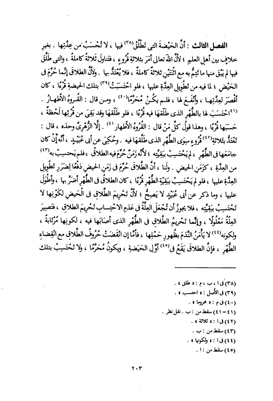 الفصل الثالث: أَنَّ الحَيْضةَ التى تَطْلُقُ (٣٨) فيها، لا تُحْسَبُ من عِدَّتِها. بغيرِ خلافٍ بين أهلِ العلمِ؛ لأنَّ اللَّه تعالى اُمرَ بثلاثةِ قُرُوءٍ، فتَناولَ ثَلاثةً كاملةً، والتى طَلَّقَ فيها لم يَبْقَ منها ما تَتِمُّ به مع اثْنَتَيْنِ ثلاثةٌ كاملةٌ، فلا يُعْتَدُّ بها. ولأنَّ الطَّلاقَ إنَّما حُرِّمَ فى الحَيْضِ؛ لما فيه من تَطْوِيلِ العِدَّةِ عليها، فلو احْتَسَبَتْ (٣٩) بتلك الحيضةِ قُرْءًا، كان أقْصَرَ لعِدَّتِها، وأنْفَعَ لها، فلم يكُنْ مُحَرَّمًا (٤٠)، ومن قال: القُروءُ الأطهارُ. [احْتَسَبَ لها بالطُّهْرِ الذى طَلّقهَا فيه قُرْءًا، فلو طَلّقهَا وقد بَقِىَ من قُرْئِها لَحْظةٌ، حَسَبَها قُرْءًا، وهذا قولُ كلِّ مَنْ قال: القُرُوءُ الأطهار] (٤١). إلَّا الزُّهْرِىَّ وحدَه، قال: تَعْتَدُّ بثَلاثةِ (٤٢) قُرُوءٍ سِوَى الطُّهْرِ الذى طَلَّقهَا فيه. وحُكِىَ عن أبى عُبَيْدٍ، أنَّه إنْ كان جامَعَها فى الطُّهْرِ، لم يَحْتَسِبْ ببَقِيَّتِه؛ لأنَّه زَمَنٌ حُرِّمَ فيه الطَّلاقُ، فلم يَحتسِبْ به (٤٣) من العِدَّةِ، كزَمَنِ الحيضِ. ولَنا، أَنَّ الطَّلاقَ حُرِّمَ فى زَمَنِ الحيضِ دَفْعًا لِضَرَرِ تَطْوِيلِ العِدَّةِ عليها، فلو لم يَحْتَسِبْ ببَقِيّةِ الطُّهْرِ قُرْءًا، كان الطَّلاقُ فى الطُّهْرِ أضَرَّ بها، وأطْوَلَ عليها، وما ذكر عن أبى عُبَيْدٍ لا يَصِحُّ؛ لأنَّ تَحْرِيمَ الطَّلاقِ فى الْحَيضِ لكَوْنِها لا تَحْتَسِبُ ببَقِيَّتِه، فلا يجوزُ أن تُجْعَلَ العِلَّةُ فى عَدَمِ الاحْتِسابِ تَحْرِيمَ الطَّلاقِ، فتَصِيرَ العِلّةُ مَعْلُولًا، وانَّما تَحْريمُ الطَّلاقِ فى الطُّهْرِ الذى أصَابَها فيه، لكونِها مُرْتَابةً، ولكونه (٤٤) لا يَأمَنُ النَّدَمَ بظُهورِ حَمْلِها، فأمَّا إن انْقَضَتْ حُرُوفُ الطَّلاقِ مع انْقِضاءِ الطَّهْرِ، فإنَّ الطَّلاقَ يَقَعُ فى (٤٥) أوَّلِ الحَيضَةِ، ويكونُ مُحَرَّمًا، ولا تَحْتَسِبُ بتلك