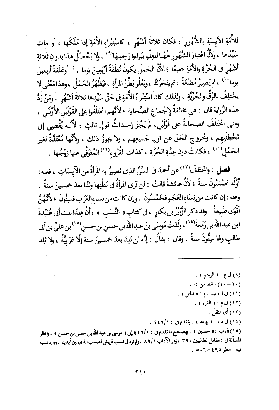 فصل: واخْتَلفَ (١٣) عن أحمد فى السِّنِّ الذى تَصِيرُ به المرأةُ من الآيِسَاتِ، فعنه: أوَّلُه خَمْسُونَ سنةً؛ لأنَّ عائشةً قالتْ: لن تَرَى المرأةُ فى بَطْنِها ولدًا بعدَ خمسينَ سنةً. وعنه: إن كانت من نِسَاءِالعَجَمِ فخَمْسُونَ، وإن كانت من نساءِ الغَرَبِ فسِتُّونَ؛ لأنَّهُنَّ أقْوَى طَبِيعةً. وقد ذكر الزُّبَيْرُ بن بكارٍ، فى كتابِ "النَّسَبِ"، أَنَّ هِندًا بنتَ أبى عُبَيْدةَ ابن عبد اللَّه بن زَمْعةَ (١٤)، ولَدَتْ مُوسَى بنَ عبدِ اللَّه بن حسنِ بن حسنِ (١٥) بن علىِّ بن أبى طالبٍ ولها سِتُّونَ سنةً. وقال: يقالُ: إنَّه لن تَلِدَ بعدَ خمسينَ سنة إلَّا عَرَبِيَّةٌ، ولا تَلِد