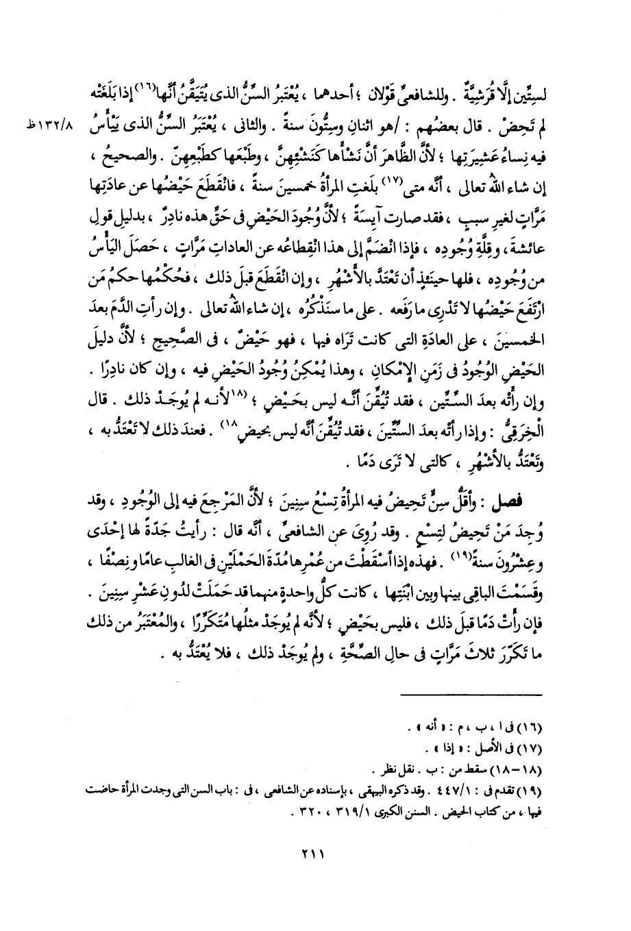 فصل: وأقَلُّ سِنٍّ تَحِيضُ فيه المرأةُ تِسْعُ سِنِينَ؛ لأنَّ المَرْجِعَ فيه إلى الوُجُودِ، وقد وُجِدَ مَنْ تَحِيضُ لتِسْعٍ. وقد رُوِىَ عن الشافعىِّ، أنَّه قال: رأيتُ جَدّةً لها إحْدَى وعِشْرُونَ سنةً (١٩). فهذه إذا أسْقَطْتَ من عُمْرِها مُدّةَ الحَمْلَيْنِ فى الغالبِ عامًا ونِصْفًا، وقَسَمْتَ الباقِى بينها وبين ابْنَتِها، كانت كلُّ واحدةٍ منهما قد حَمَلَتْ لدُونِ عَشْرِ سِنِينَ. فإن رأَتْ دَمًا قبلَ ذلك، فليس بحَيْضٍ؛ لأنَّه لم يُوجَدْ مثلُها مُتَكَرِّرًا، والمُعْتَبَرُ من ذلك ما تَكَرّرَ ثلاثَ مَرَّاتٍ فى حالِ الصِّحَّةِ، ولم يُوجَدْ ذلك، فلا يُعْتَدُّ به.