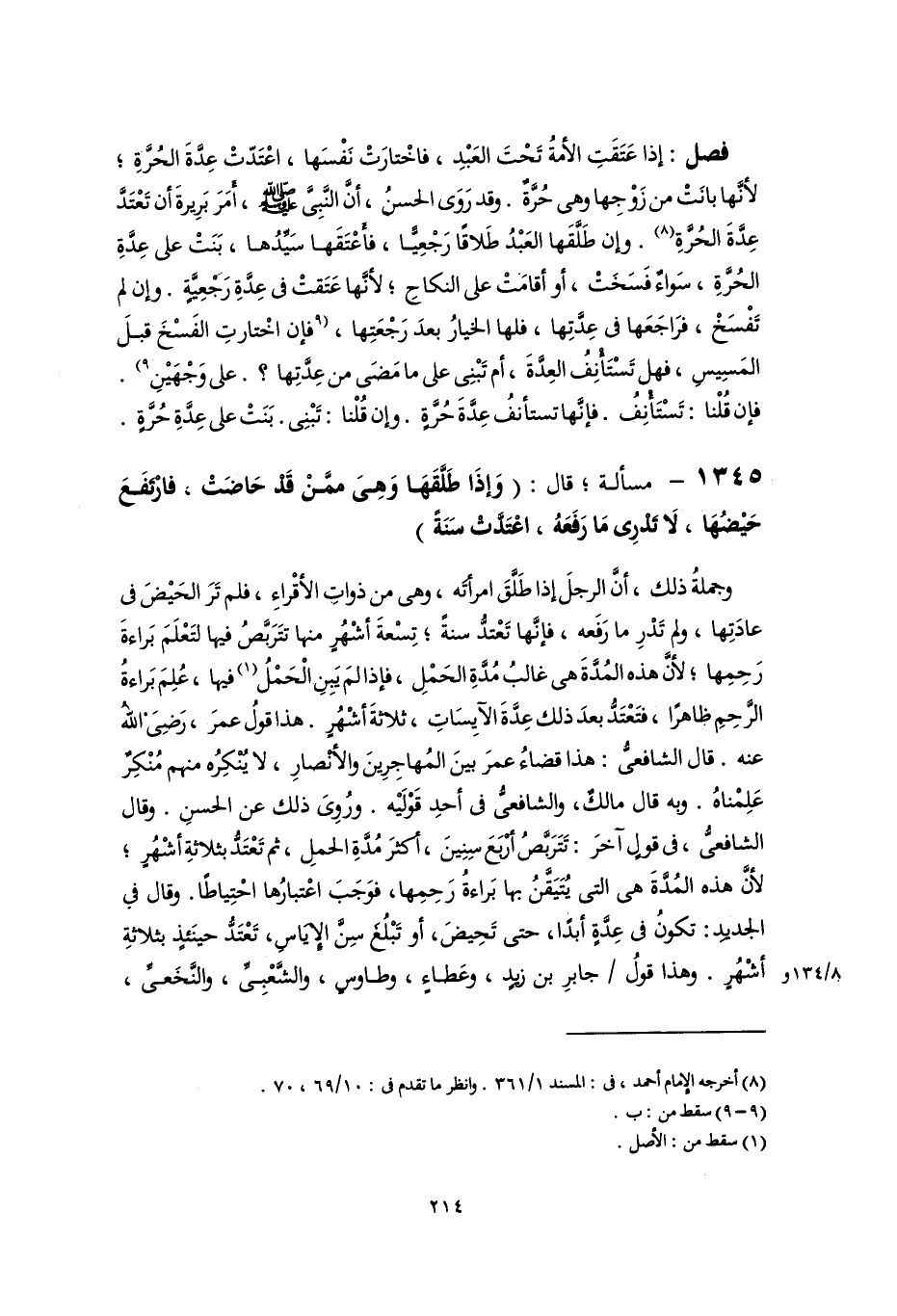 وجملةُ ذلك، أنَّ الرجلَ إذا طَلَّقَ امرأتَه، وهى من ذواتِ الأقْراءِ، فلم تَرَ الحَيْضَ فى عادَتِها، ولم تَدْرِ ما رَفَعه، فإنَّها تَعْتدُّ سنةً؛ تِسْعةَ أشْهُرٍ منها تتَرَبَّصُ فيها لتَعْلَمَ بَراءةَ رَحِمِها؛ لأنَّ هذه المُدَّةَ هى غالبُ مُدَّةِ الحَمْلِ، فإذا لمَ يَبِنِ الْحَمْلُ (١) فيها، عُلِمَ بَراءةُ الرَّحِمِ ظاهرًا، فتَعْتَدُّ بعدَ ذلك عِدَّةَ الآيِسَاتِ، ثلاثةَ أشْهُرٍ. هذا قولُ عمرَ، رَضِىَ اللهُ عنه. قال الشافعىُّ: هذا قضاءُ عمرَ بينَ المُهاجِرِينَ والأنْصارِ، لا يُنْكِرُه منهم مُنْكِرٌ عَلِمْناهُ. وبه قال مالكٌ، والشافعىُّ فى أحدِ قَوْلَيْه. ورُوِىَ ذلك عن الحسنِ. وقال الشافعىُّ، فى قولٍ آخرَ: تَتَرَبَّصُ أرْبَعَ سِنِينَ، أكثرَ مُدَّةِ الحملِ، ثم تَعْتَدُّ بثلاثةِ أشْهُرٍ؛ لأنَّ هذه المُدَّةَ هى التى يُتَيَقَّنُ بها بَراءةُ رَحِمِها، فوَجَبَ اعْتبارُها احْتِياطًا. وقال في الجديدِ: تكونُ فى عِدَّةٍ أبدًا، حتى تَحِيضَ، أو تَبْلُغَ سِنَّ الإِيَاسِ، تَعْتَدُّ حينَئذٍ بثلاثةِ أشهُرٍ. وهذا قولُ جابرِ بن زيدٍ، وعَطاءٍ، وطاوسٍ، والشَّعْبِىِّ، والنَّخَعىِّ،
