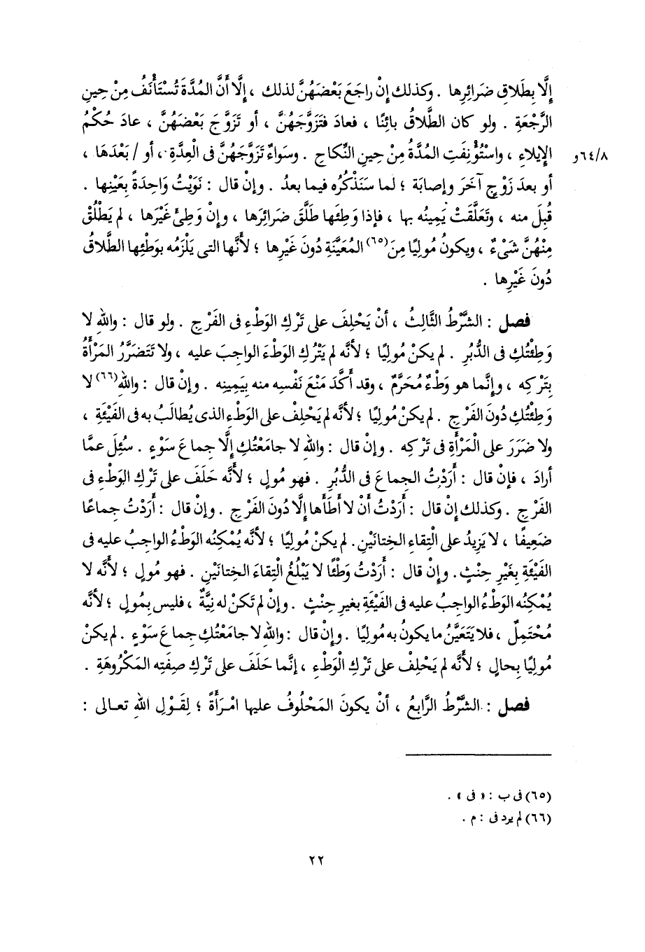 فصل: الشَّرْطُ الرَّابِعُ، أَنْ يكونَ المَحْلُوفُ عليها امْرَأَةً؛ لِقَوْلِ اللَّهِ تعالى: