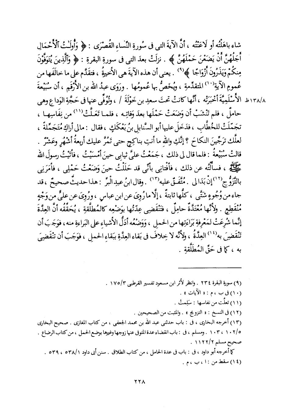 شاء باهَلْتُه أو لَاعَنْتُه، أنَّ الآيةَ التى فى سُورةِ النِّساءِ القُصْرَى: {وَأُولَاتُ الْأَحْمَالِ أَجَلُهُنَّ أَنْ يَضَعْنَ حَمْلَهُنَّ}. نزلَتْ بعدَ التى فى سورةِ البقرةِ: {وَالَّذِينَ يُتَوَفَّوْنَ مِنْكُمْ وَيَذَرُونَ أَزْوَاجًا} (٩). يعنى أن هذه الآيةَ هى الأخيرةُ، فتقَدَّم على ما خالَفَها من عُمومِ الآيَةِ (١٠) المتقدِّمةِ، ويُخَصُّ بها عُمومُها. ورَوَى عبدُ اللَّه بن الأَرْقَمِ، أن سُبَيْعةَ الأَسْلَمِيَّةَ أخْبَرَتْه، أنَّها كانتْ تحتَ سعدِ بن خَوْلَةَ، وتُوُفِّى عنها فى حَجَّةِ الوَداعِ وهى حاملٌ، فلم تَنْشَبْ أن وَضَعَتْ حَمْلَها بعدَ وَفاتِه، فلما تَعَلَّتْ (١١) من نِفَاسِها، تجَمّلَتْ للخُطَّابِ، فدَخَلَ عليها أبو السَّنَابلِ بنُ بَعْكَكٍ، فقال: مالى أراكِ مُتَجَمِّلةً، لعلَّك ترَجِّينَ النِّكاحَ؟ إنَّكِ واللهِ ما أنتِ بناكِحٍ حتَّى تَمُرَّ عليك أربعةُ أشْهُرٍ وعَشْرٌ. قالتْ سُبَيْعةُ: فلما قال لى ذلك، جَمَعْتُ علىَّ ثيابِى حينَ أمْسَيْتُ، فأتَيْتُ رسولَ اللَّه -صلى اللَّه عليه وسلم-، فسأَلْتُه عن ذلك، فأفْتانِى بأنِّى قد حَلَلْتُ حينَ وَضَعْتُ حَمْلِى، فأمَرَنِى بالتَّزَوُّجِ (١٢) إنْ بَدَا لى. مُتَّفَقٌ عليه (١٣). وقال ابنُ عبدِ الْبرِّ: هذا حديثٌ صحيحٌ، قد جاء من وُجُوهٍ شَتَّى، كلُّها ثابتةٌ، إلَّا ما رُوِىَ عن ابن عباسٍ، ورُوِىَ عن عليٍّ من وَجْهٍ مُنْقَطِعٍ. ولأنَّها مُعْتَدَّةٌ حامِلٌ، فتَنْقَضِى عِدّتُها بوَضْعِه كالمُطلَّقةِ، يُحَقِّقُه أنَّ العِدَّةَ إنَّما شُرِعَتْ لمَعْرِفةِ بَرَاءَتِها من الحملِ، وَوَضْعُه أدَلُّ الأشياءِ على البَراءةِ منه، فوَجَبَ أن تَنْقَضِىَ به (١٤) العِدَّةُ، ولأنَّه لا خِلافَ فى بَقاء العِدَّةِ ببَقاءِ الحملِ، فوَجَبَ أن تنْقَضِىَ به، كما فى حَقِّ المُطَلَّقةِ.