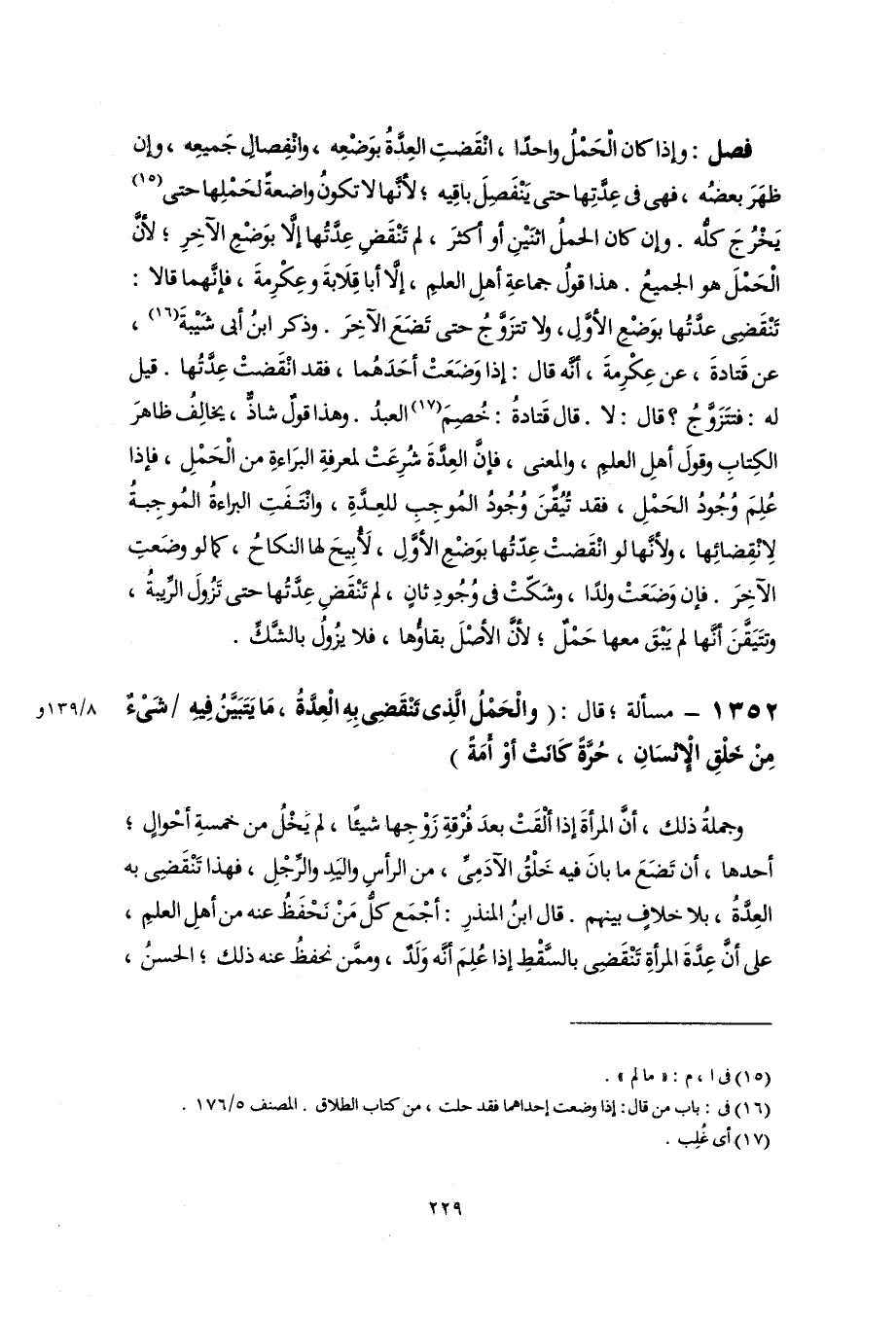 فصل: وإذا كان الْحَمْلُ واحدًا، انْقَضتِ العِدَّةُ بوَضْعِه، وانْفِصالِ جَميعِه، وإن ظهَرَ بعضُه، فهى فى عِدَّتِها حتَّى يَنْفَصِلَ باقِيه؛ لأنَّها لا تكونُ واضعةً لحَمْلِها حتى (١٥) يَخْرُجَ كلُّه. وإن كان الحملُ اثنَيْنِ أو أكثرَ، لم تَنْقَضِ عِدَّتُها إلَّا بوَضْعِ الآخِرِ؛ لأنَّ الْحَمْلَ هو الجميعُ. هذا قولُ جماعةِ أهلِ العلمِ، إلَّا أبا قِلَابةَ وعِكْرِمةَ، فإنَّهما قالا: تَنْقَضِى عدَّتُها بوَضْعِ الأوَّلِ، ولا تتزَوَّجُ حتَّى تَضَعَ الآخِرَ. وذكر ابنُ أبي شَيْبةَ (١٦)، عن قَتَادةَ، عن عِكْرِمةَ، أنَّه قال: إذا وَضَعَتْ أحَدَهُما، فقد انْقَضتْ عِدَّتُها. قيل له: فتتَزَوَّجُ؟ قال: لا. قال قَتادةُ: خُصِمَ (١٧) العبدُ. وهذا قولٌ شاذٌ، يخالِفُ ظاهرَ الكِتابِ وقولَ أهلِ العلمِ، والمعنى، فإنَّ العِدَّةَ شُرِعَتْ لمعرفةِ البرَاءةِ من الْحَمْلِ، فإذا عُلِمَ وُجُودُ الحَمْلِ، فقد تُيُقِّنَ وُجُودُ المُوجِب للعِدَّةِ، وانْتَفَتِ البراءةُ المُوجِبةُ لِانْقِضائِها، ولأنَّها لو انْقَضتْ عِدّتُها بوَضْعِ الأوَّلِ، لَأُبِيحَ لها النِّكاحُ، كما لو وضَعتِ الآخِرَ. فإن وَضَعَتْ ولدًا، وشَكّتْ فى وُجُودِ ثانٍ، لم تَنْقَضِ عِدَّتُها حتَّى تَزُولَ الرِّيبةُ، وتتَيَقَّنَ أنَّها لم يَبْقَ معها حَمْلٌ؛ لأنَّ الأصْلَ بقاؤُها، فلا يزُولُ بالشَّكِّ.