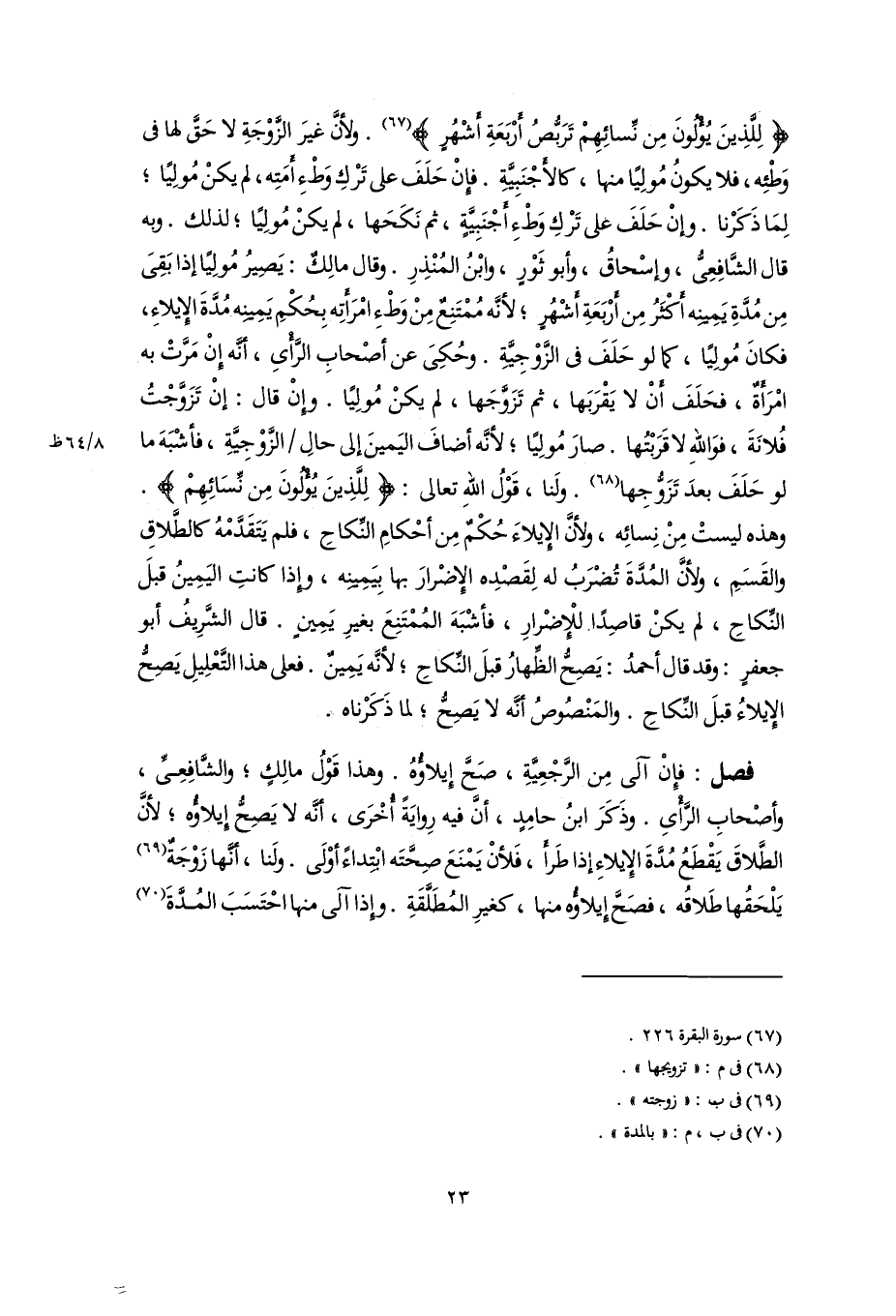 {لِلَّذِينَ يُؤْلُونَ مِنْ نِسَائِهِمْ تَرَبُّصُ أَرْبَعَةِ أَشْهُرٍ} (٦٧). ولأنَّ غيرَ الزَّوْجَةِ لا حَقَّ لها فى وَطْئِه، فلا يكونُ مُولِيًا منها، كالأَجْنَبِيَّةِ. فإِنْ حَلَفَ على تَرْكِ وَطْءِ أَمَتِه، لم يكنْ مُولِيًا؛ لِمَا ذَكَرْنا. وإِنْ حَلَفَ على تَرْكِ وَطْءِ أَجْنَبِيَّةٍ، ثم نَكَحَها، لم يكنْ مُولِيًا؛ لذلك. وبه قال الشَّافِعِىُّ، وإسْحاقُ، وأبو ثَوْرٍ، وابْنُ المُنْذِرِ. وقال مالِكٌ: يَصِيرُ مُولِيًا إذا بَقِىَ مِن مُدَّةِ يَمِينِه أَكْثَرُ مِن أَرْبَعَةِ أَشْهُرٍ؛ لأنَّه مُمْتَنِعٌ مِنْ وَطْءِ امْرَأَتِه بِحُكْمِ يَمِينِه مُدَّةَ الإِيلاءِ، فكانَ مُولِيًا، كما لو حَلَفَ فى الزَّوْجِيَّةِ. وحُكِىَ عن أصْحابِ الرَّأْىِ، أنَّه إِنْ مَرَّتْ به امْرَأَةٌ، فحَلَفَ أَنْ لا يَقْرَبَها، ثم تَزَوَّجَها، لم يكنْ مُولِيًا. وإِنْ قال: إنْ تَزَوَّجْتُ فُلانَةَ، فوَاللَّهِ لا قَرَبْتُها. صارَ مُولِيًا؛ لأنَّه أضافَ اليَمينَ إلى حالِ الزَّوْجِيَّةِ، فأشْبَهَ ما لو حَلَفَ بعدَ تَزَوُّجِها (٦٨). ولَنا، قَوْلُ اللَّهِ تعالى: {لِلَّذِينَ يُؤْلُونَ مِنْ نِسَائِهِمْ}. وهذه ليستْ مِنْ نِسائِه، ولأنَّ الإِيلاءَ حُكْمٌ مِن أحْكامِ النِّكاحِ، فلم يَتَقَدَّمْهُ كالطَّلاقِ والقَسَمِ، ولأنَّ المُدَّةَ تُضْرَبُ له لِقَصْدِه الإِضْرارَ بها بِيَمِينِه، وإِذا كانتِ اليَمِينُ قبلَ النِّكاحِ، لم يكنْ قاصِدًا. للْإِضْرارِ، فأشْبَهَ المُمْتَنِعَ بغيرِ يَمِينٍ. قال الشَّرِيفُ أبو جعفرٍ: وقد قال أحمدُ: يَصِحُّ الظِّهارُ قبلَ النِّكاحِ؛ لأنَّه يَمِينٌ. فعلى هذا التَّعْلِيلِ يَصِحُّ الإِيلاءُ قبلَ النِّكاحِ. والمَنْصُوصُ أنَّه لا يَصِحُّ؛ لما ذَكَرْناه.