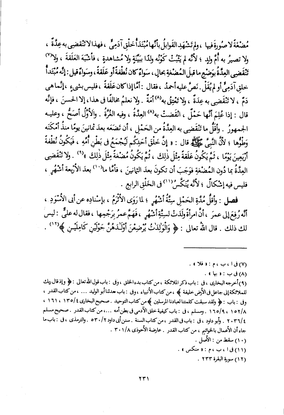 مُضْغَةً لا صُورةَ فيها، ولم تَشْهَدِ القَوابلُ بأنَّها مُبْتَدَأُ خَلْقِ آدَمِىٍّ، فهذا لا تَنْقَضِى به عِدَّةٌ، ولا تصيرُ به أُمَّ ولدٍ؛ لأنَّه لم يَثْبُتْ كَوْنُه ولدًا ببَيِّنَةٍ ولا مُشاهدةٍ، فأشْبَهَ العَلَقةَ، ولا (٧) تَنْقَضِى العِدَّةُ بوَضْعِ ما قبلَ المُضْغةِ بحالٍ، سَواءٌ كان نُطْفةً أو عَلَقةً، وسَواءٌ قيل: أنَّه مُبْتَدأُ خلقِ آدَمِىٍّ أو لم يُقَلْ. نَصَّ عليه أحمدُ، فقال: أمَّا اذا كان عَلَقةً، فليس بشىءٍ، إنَّما هى دَمٌ، لا تَنْقَضِى به عِدَةٌ، ولا تَعْتِقُ به (٨) أمَةٌ. ولا نعلمُ مخالفًا فى هذا، إلا الحسنَ، فإنَّه قال: إذا عُلِمَ أنَّها حَمْلٌ، انْقَضتْ به (٨) العِدَّةُ، وفيه الغُرَّةُ. والأوَّلُ أصَحُّ، وعليه الجمهورُ. وأقَلُّ ما تَنْقَضِى به العِدَّةُ من الحَمْلِ، أن تَضَعَه بعدَ ثمانينَ يومًا منذُ أمْكَنَه وَطْؤُها؛ لأنَّ النَّبِىَّ -صلى اللَّه عليه وسلم- قال: "إِنَّ خَلْقَ أحَدِكُم لَيُجْمَعُ فى بَطْنِ أُمِّهِ، فَيَكُونُ نُطْفةً أرْبَعِينَ يَوْمًا، ثُمَّ يَكُونُ عَلَقةً مِثْلَ ذلِكَ، ثُمَّ يَكُونُ مُضْغةً مِثْلَ ذلِكَ" (٩). ولا تَنْقَضِى العِدَّةُ بما دُون المُضْغةِ فوَجَبَ أن تكونَ بعدَ الثمانينَ، فأمَّا ما (١٠) بعدَ الأرْبعة أشْهُرٍ، فليس فيه إشْكالٌ؛ لأنَّه يُنَكَّسُ (١١) فى الخَلْقِ الرابعِ.