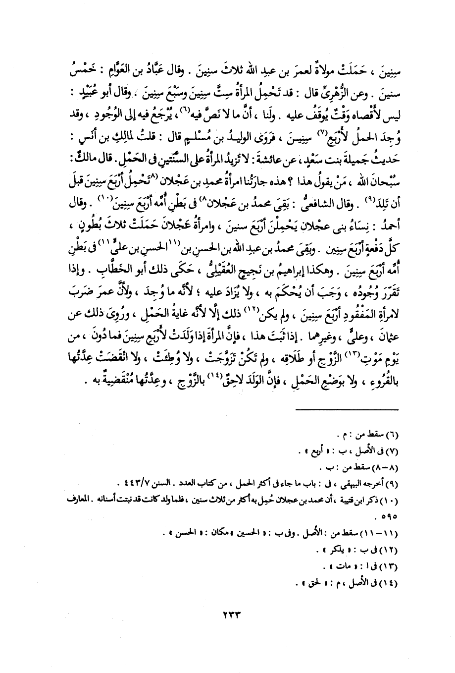 سِنِينَ، حَمَلَتْ مولاةٌ لعمرَ بن عبدِ اللَّه ثلاثَ سنِينَ. وقال عَبَّادُ بن العَوَّامِ: خَمْسُ سنينَ. وعن الزُّهْرِيِّ قال: قد تَحْمِلُ المرأةُ سِتَّ سِنِينَ وسَبْعَ سِنِينَ. وقال أبو عُبَيْدٍ: ليس لأَقْصاه وَقْتٌ يُوقَفُ عليه. ولَنا، أنَّ ما لا نَصَّ فيه (٦)، يُرْجَعُ فيه إلى الوُجُودِ، وقد وُجِدَ الحملُ لأَرْبَعِ (٧) سِنِينَ، فرَوَى الوليدُ بن مُسْلمٍ قال: قلتُ لمالِكِ بن أنَسٍ: حَديثُ جَميلةَ بنت سَعْدٍ، عن عائشةَ: لا تَزيدُ المرأةُ على السَّنَتينِ فى الحَمْلِ. قال مالكٌ: سُبْحانَ اللَّه، مَنْ يقولُ هذا؟ هذه جارَتُنا امرأةُ محمدِ بن عَجْلان [تَحْمِلُ أرْبَعَ سِنِينَ قبلَ أن تَلِدَ (٨). وقال الشافعىُّ: بَقِىَ محمدُ بن عَجْلان] (٩) فى بَطْنِ أُمِّه أرْبَعَ سِنِينَ (١٠). وقال أحمدُ: نِسَاءُ بنى عجْلان يَحْمِلْنَ أرْبَعَ سنينَ، وامرأةُ عَجْلانَ حَمَلَتْ ثلاثَ بُطُونٍ، كلَّ دَفْعةٍ أرْبَعَ سِنِين. وبَقِىَ محمدُ بن عبدِ اللَّه بن الحسنِ بن [الحسنِ بن عليٍّ] (١١) فى بَطْنِ أُمِّه أَرْبَعَ سِنِينَ. وهكذا إبراهيمُ بن نَجِيحٍ العُقَيْلِىُّ، حَكَى ذلك أبو الخَطَّابِ. وإذا تَقَرّرَ وُجُودُه، وَجَبَ أن يُحْكَمَ به، ولا يُزَادَ عليه؛ لأنَّه ما وُجِدَ، ولأنَّ عمرَ ضَربَ لامرأةِ المَفْقُودِ أرْبَعَ سِنِينَ، ولم يكن (١٢) ذلك إلَّا لأنَّه غايةُ الحَمْلِ، ورُوِىَ ذلك عن عثمانَ، وعليٍّ، وغيرِهما. إذا ثَبَتَ هذا، فإنَّ المرأةَ إذا وَلَدَتْ لأَرْبَعِ سِنِينَ فما دُونَ، من يَوْمِ مَوْتِ (١٣) الزَّوْجِ أو طَلَاقِه، ولم تَكُنْ تَزَوَّجَتْ، ولا وُطِئَتْ، ولا انْقَضَتْ عِدَّتُها بالقُرُوءِ، ولا بوَضْعِ الحَمْلِ، فإنَّ الوَلَدَ لاحِقٌ (١٤) بالزَّوجِ، وعِدَّتُها مُنْقَضِيةٌ به.