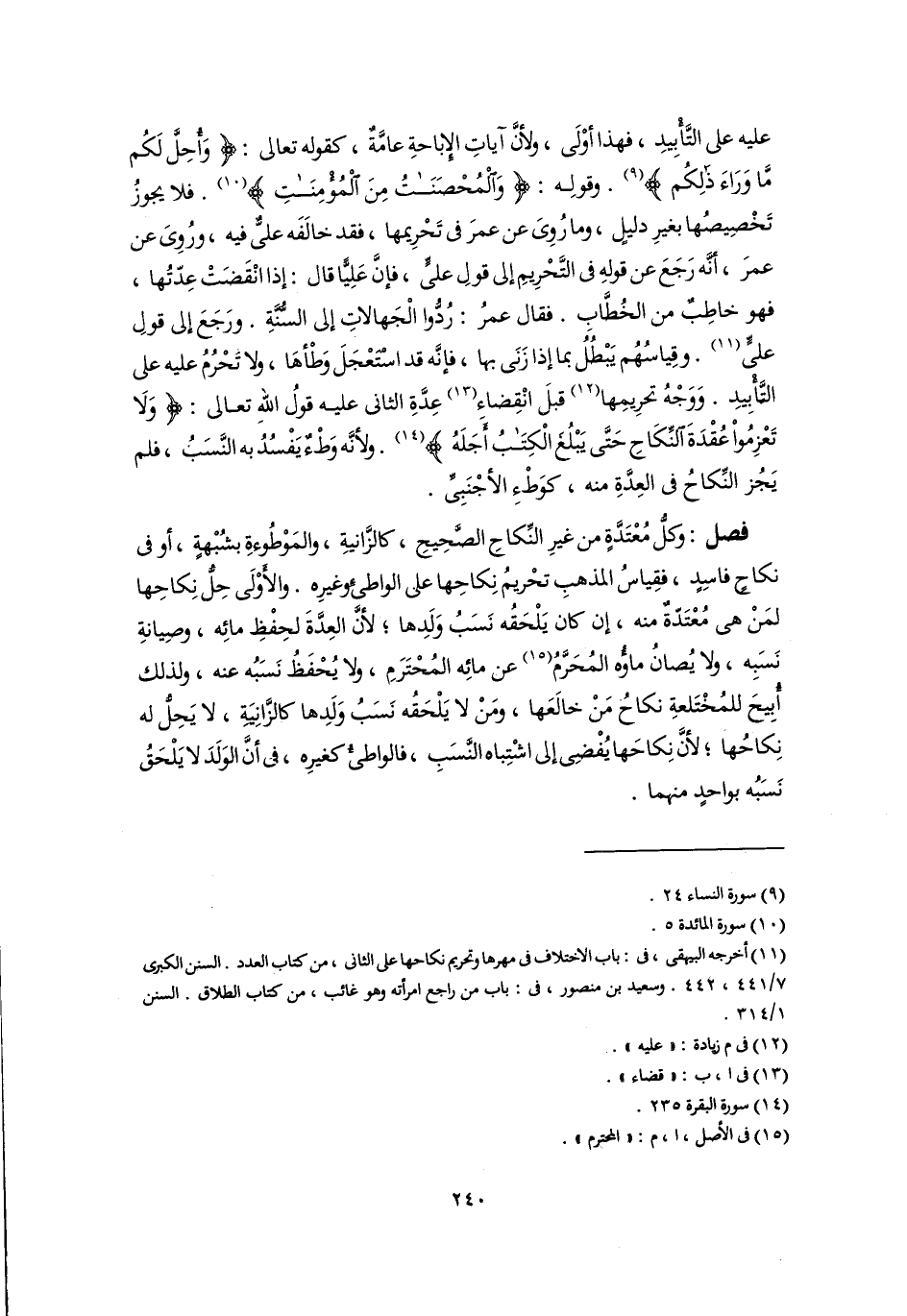 فصل: وكلُّ مُعْتَدَّةٍ من غيرِ النِّكاحِ الصَّحِيحِ، كالزَّانيةِ، والمَوْطُوءةِ بشُبْهةٍ، أو فى نكاحٍ فاسِدٍ، فقِياسُ المذهبِ تحْريمُ نِكاحِها على الواطىءِ وغيرِه. والأَوْلَى حِلُّ نِكاحِها لمَنْ هى مُعْتَدَّةٌ منه، إن كان يَلْحَقُه نَسَبُ وَلَدِها؛ لأنَّ العِدَّةَ لحِفْظِ مائِه، وصِيانةِ نَسَبِه، ولا يُصانُ ماؤُه المُحَرَّمُ (١٥) عن مائِه المُحْتَرَمِ، ولا يُحْفَظُ نَسَبُه عنه، ولذلك أُبِيحَ للمُخْتَلعةِ نكاحُ مَنْ خالَعَها، ومَنْ لا يَلْحَقُه نَسَبُ وَلَدِها كالزَّانِيَةِ، لا يَحِلُّ له نِكاحُها؛ لأنَّ نِكاحَها يُفْضِى إلى اشْتِباه النَّسَبِ، فالواطئُ كغيرِه، في أنَّ الوَلَدَ لا يَلْحَقُ نَسَبُه بواحدٍ منهما.