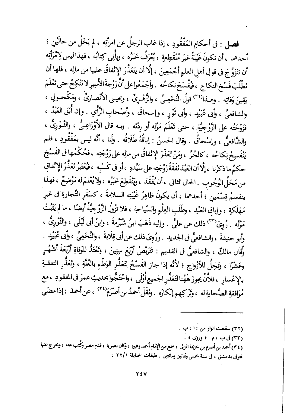 فصل: فى أحكامِ المَفْقُودِ، إذا غاب الرجلُ عن امرأتِه، لم يَخْلُ من حالَيْنِ؛ أحدهما، أن تكونَ غَيْبَةً غيرَ مُنْقَطِعةٍ، يُعْرَفُ خَبَرُه، ويأْتِى كِتابُه، فهذا ليس لِامْرَأتِه أن تتَزَوَّجَ فى قولِ أهلِ العلمِ أجْمَعِينَ، إلَّا أن يتَعَذَّرَ الإِنْفاقُ عليها من مالِه، فلها أن تَطْلُبَ فَسْخ النكاحِ، فيُفْسَخَ نكاحُه. وأجْمَعُوا على أنَّ زَوْجةَ الأسِيرِ لا تَنْكِحُ حتى تَعْلَمَ يَقِينَ وَفاتِه. وهذا (٣٢) قولُ النَّخَعِىِّ، والزُّهْرِيِّ، ويحيى الأنْصاريِّ، ومَكْحولٍ، والشافعىِّ، وأبي عُبَيْدٍ، وأبي ثَوْرٍ، وإسحاقَ، وأصْحابِ الرَّأْىِ. وإن أَبَقَ العَبْدُ، فزَوْجَتُه على الزَّوْجِيَّةِ، حتى تَعْلَمَ مَوْتَه أو رِدّتَه. وبه قال الأوْزَاعِىُّ، والثَّوْرِىُّ، والشَّافعىُّ، وإسْحاقُ. وقال الحسنُ: إباقُهُ طَلَاقُه. ولَنا، أنَّه ليس بمَفْقودٍ، فلم يَنْفَسِخْ نِكاحُه، كالحُرِّ، ومَنْ تَعَذّرَ الإِنْفاقُ من مالِه على زَوْجَتِه، فحُكْمُها فى الفَسْخِ حكمُ ما ذكرْنا، إلَّا أن العَبْدَ نَفَقَةُ زَوْجَتِه على سَيِّدهِ، أو فى كَسْبِه، فيُعْتَبرُ تَعَذُّرُ الإِنْفاقِ من مَحَلِّ الوُجُوبِ. الحال الثانى، أن يُفْقَدَ، ويَنْقَطِعَ خَبَرُه، ولا يُعْلمَ له مَوْضِعٌ، فهذا ينقسمُ قِسْمَينِ؛ أحدهما، أن يكونَ ظاهِرُ غَيْبَتِه السلامةَ، كسَفَرِ التِّجارةِ فى غيرِ مَهْلَكةٍ، وإباقِ العَبْدِ، وطَلَبِ العِلْمِ والسّياحةِ، فلا تزُولُ الزَّوْجِيَّةُ أيضًا، ما لم يَثْبُتْ مَوْتُه. رُوِىَ (٣٣) ذلك عن عليٍّ. وإليه ذَهَبَ ابنُ شُبْرُمةَ، وابنُ أبي لَيْلَى، والثَّوْرِىُّ، وأبو حنيفةَ، والشافعىُّ فى الجديدِ. ورُوِىَ ذلك عن أبي قِلَابةَ، والنَّخَعِىِّ، وأبي عُبَيْدٍ. وقال مالكٌ، والشافعىُّ فى القديمِ: تتَرَبَّصُ أَرْبَعَ سِنِينَ، وتَعْتَدُّ للوَفاةِ أَرْبَعَةَ أشْهُرٍ وعَشْرًا، وتَحِلُّ للأزْواجِ؛ لأنَّه إذا جاز الفَسْخُ لتَعَذُّرِ الوَطْءِ بالعُنَّةِ، وَتَعَذُّرِ النفقةِ بالإِعْسارِ، فلأَنْ يجوزَ ههُنا لتَعَذُّرِ الجميعِ أَوْلَى، واحْتَجُّوا بحديثِ عمرَ فى المفقودِ، مع مُوَافقةِ الصَّحابةِ له، وَترْكِهِم إنْكارَه. ونَقَلَ أحمدُ بن أصْرَمَ (٣٤)، عن أحمدَ: إذا مضَى